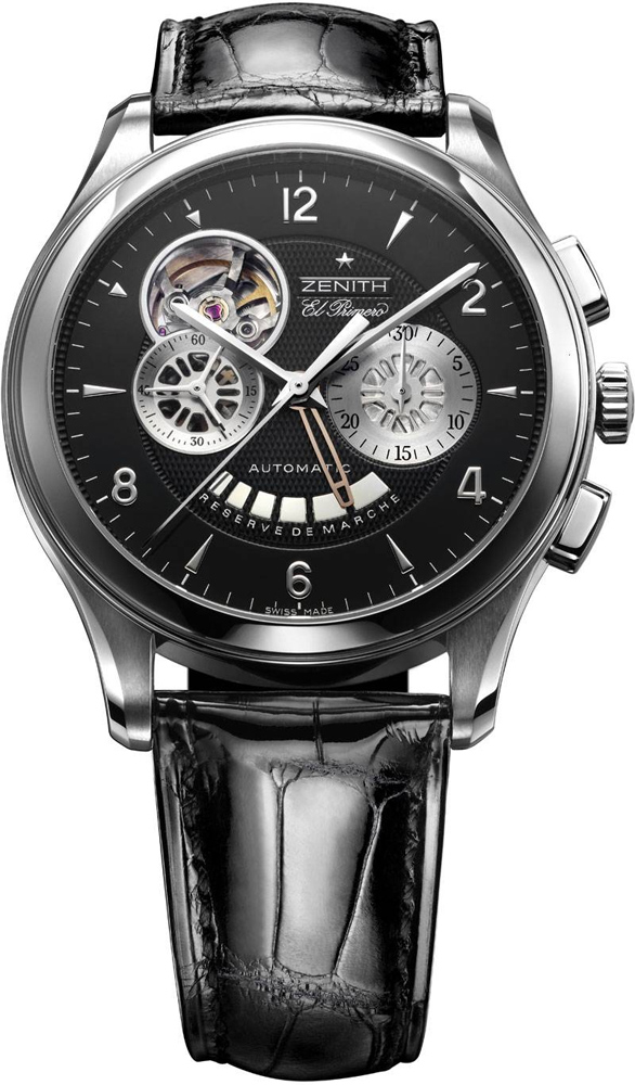 Stainless Steel Case, Black Crocodile Leather Strap with Steel Deployment Buckle, Black Guilloche textured Dial, Steel applied Arabic numeral & index hour markers & hands. The Famous El Primero Certified COSC Automatic Chronograph Movement.