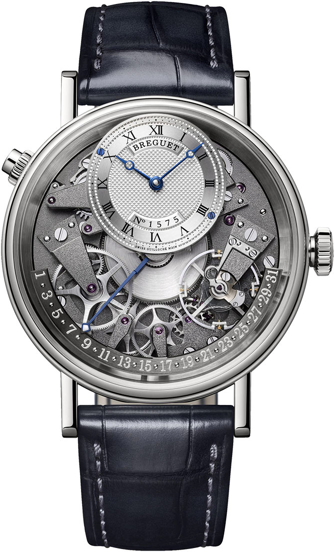 • Breguet Caliber 505q, beats at 21,600 vph, contains 45 jewels & has an approximate power reserve of 50 hours. Fitted with a Breguet balance-spring an inverted straight-line escapement in silicon.