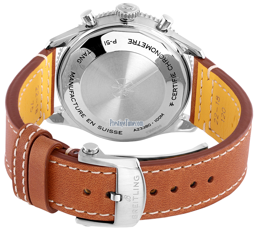 • Breitling in-house caliber B23, beats at 28,800 vph (4Hz), contains 27 jewels & has a power reserve of 48 hours.