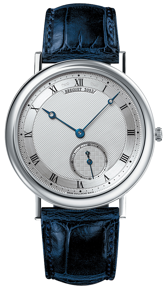 Classic Wristwatch. Beautiful Hand Engraved (engine-turned) Silver Dial. Roman Numeral Hour Markers. Blued "Breguet" Style Hands, Offset Small Seconds hand at the 6 o'clock position. 46 Hour Power Reserve.