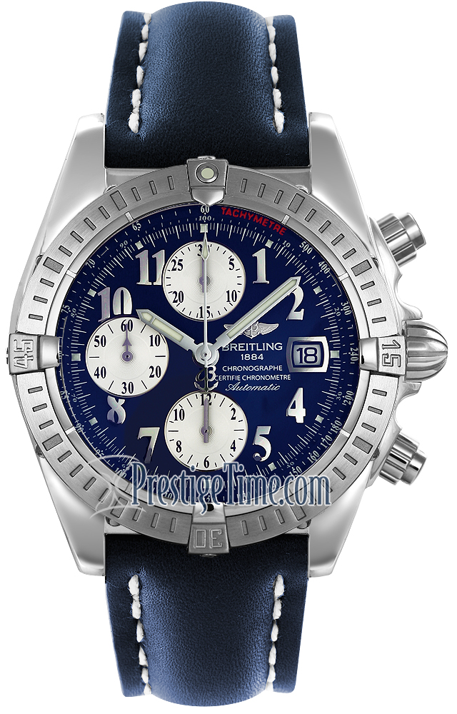 Blue Dial with Silver Sub-Dials. Applied Silver-Toned Arabic Numeral Index hour markers. This watch Features: 1/4th of a second Chronograph & a Tachymeter Scale. Date Displayed at the 3 o'clock position.