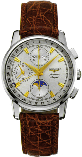 • Small seconds dial at 9 o’clock, 12 hour timer at 6 o’clock with moon phase, and a 30 minute timer at 12 o’clock with Day and Month windows.