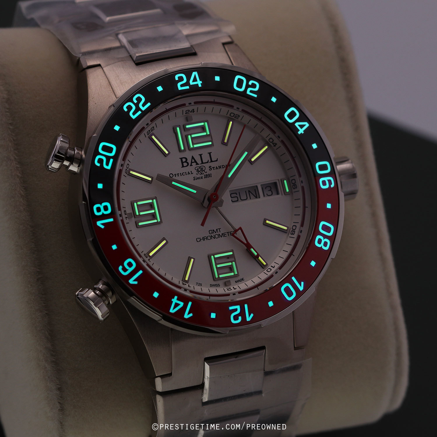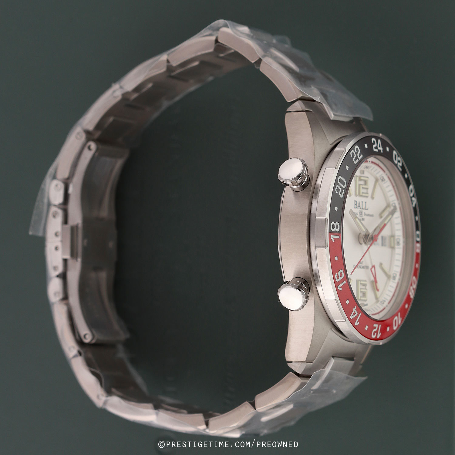 Case: Brushed titanium case. Stainless steel bi-directional bezel with polished red and black ceramic GMT bezel ring. White dial. Polished hands. Applied index & numeral hour markers. Fine printed minutes/seconds track. Day & date windows at 3 o'clock.