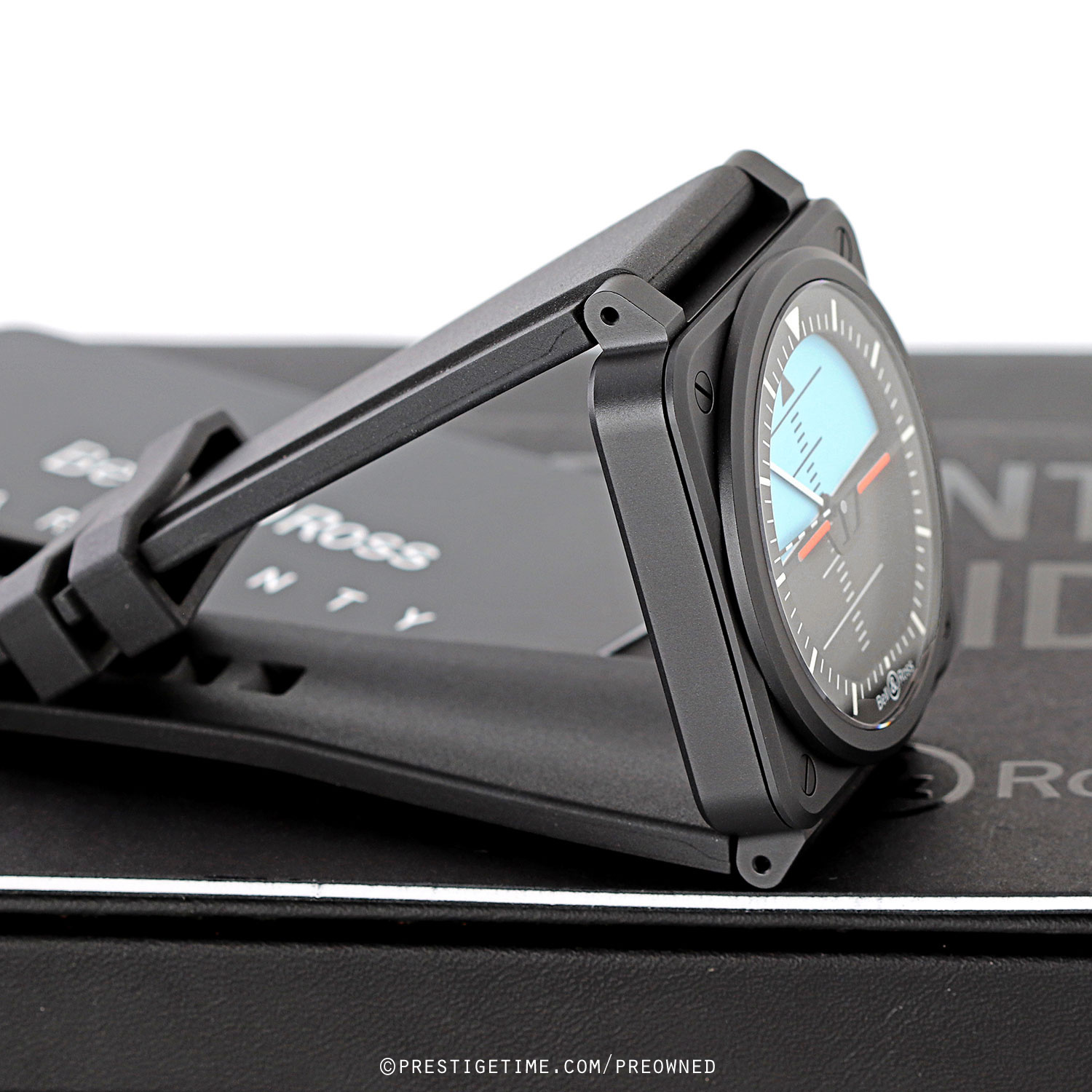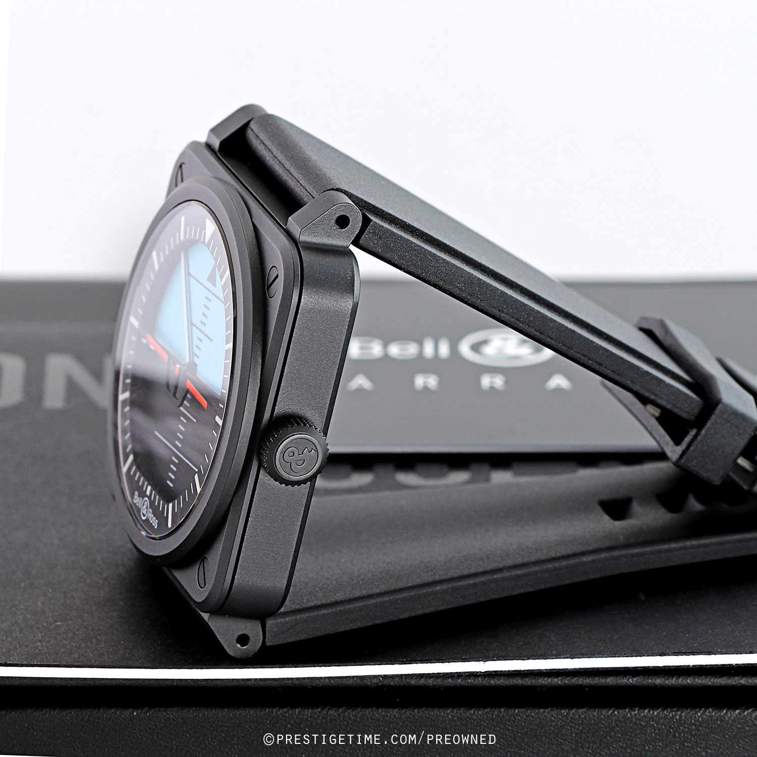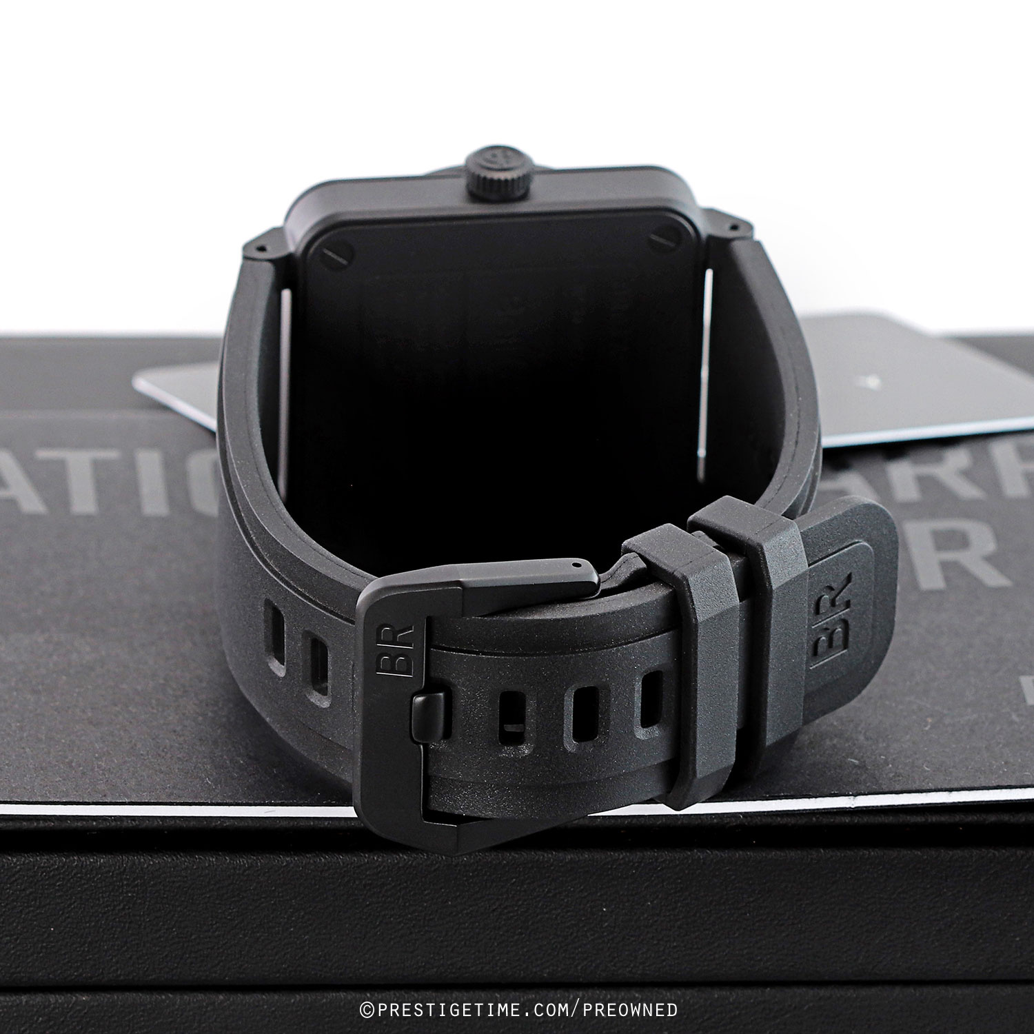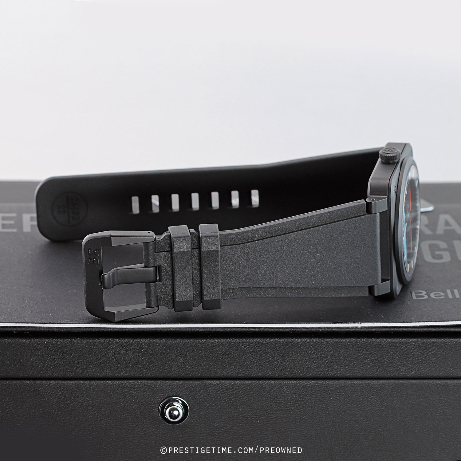- Fitted on its original Bell & Ross black rubber strap with a black PVD coated stainless steel tang buckle. This strap is unworn in new condition with its full wear lifespan remaining.