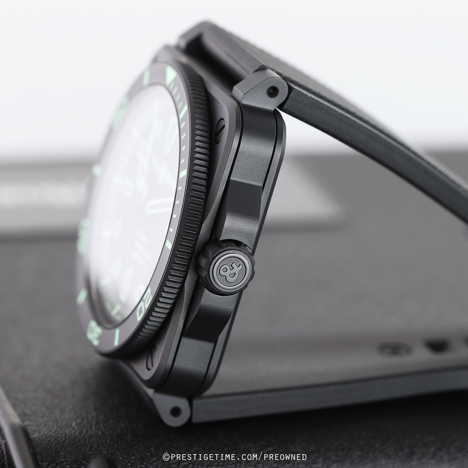 1. Fitted on its original Bell & Ross black rubber strap with a black PVD coated stainless steel tang buckle. This strap is unworn in new condition with its full wear lifespan remaining.
