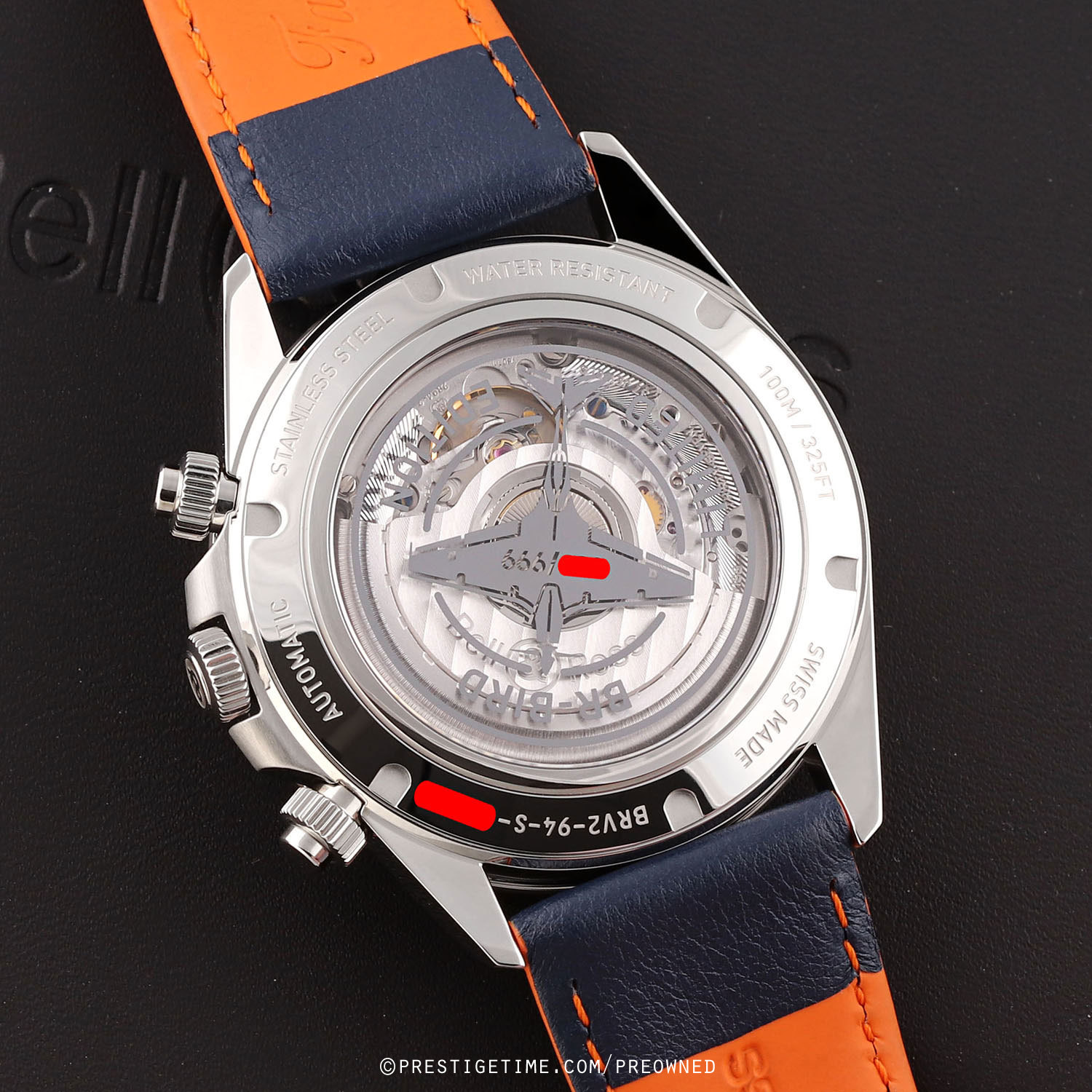 The Bell & Ross BR V2-94 RACING BIRD - limited & numbered edition of 999 pieces. The sapphire crystal case back features a picture of Bell & Ross's BR-Bird, an ultramodern single-seat, propeller-engine aircraft.