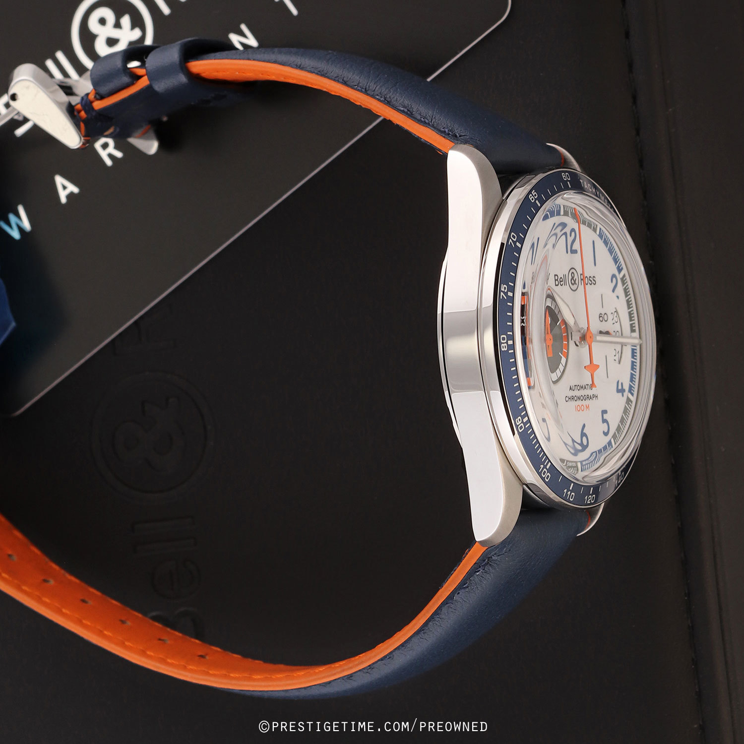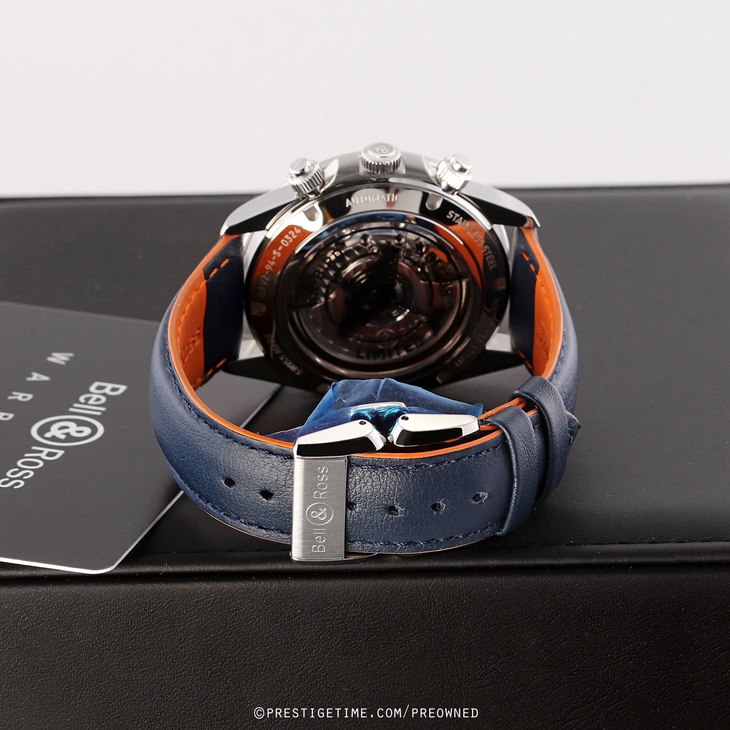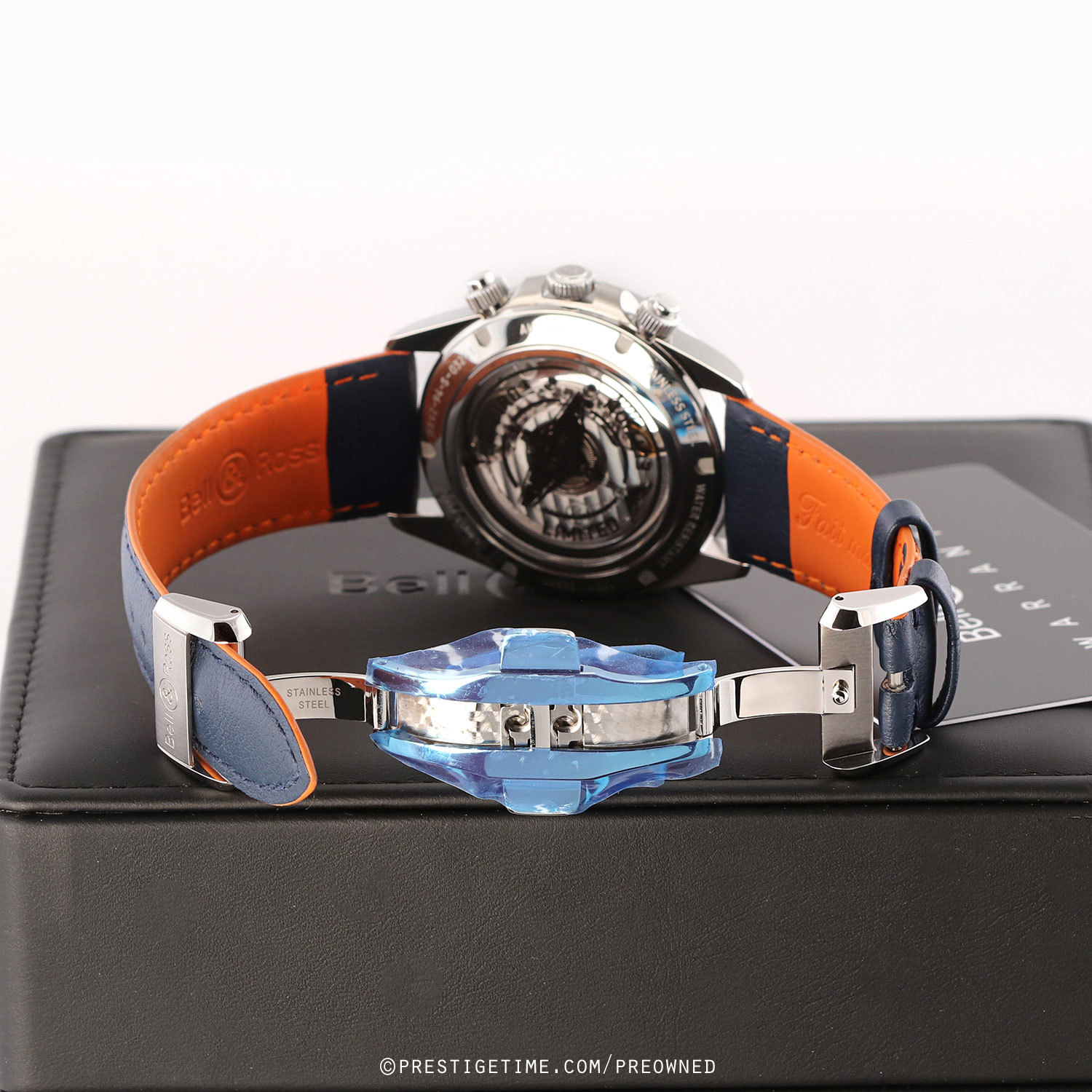 Strap: Fitted on its original Bell & Ross blue calfskin leather strap with orange lining & a stainless steel push-button deployant clasp. The strap is unworn, in new condition with its full wear lifespan remaining.