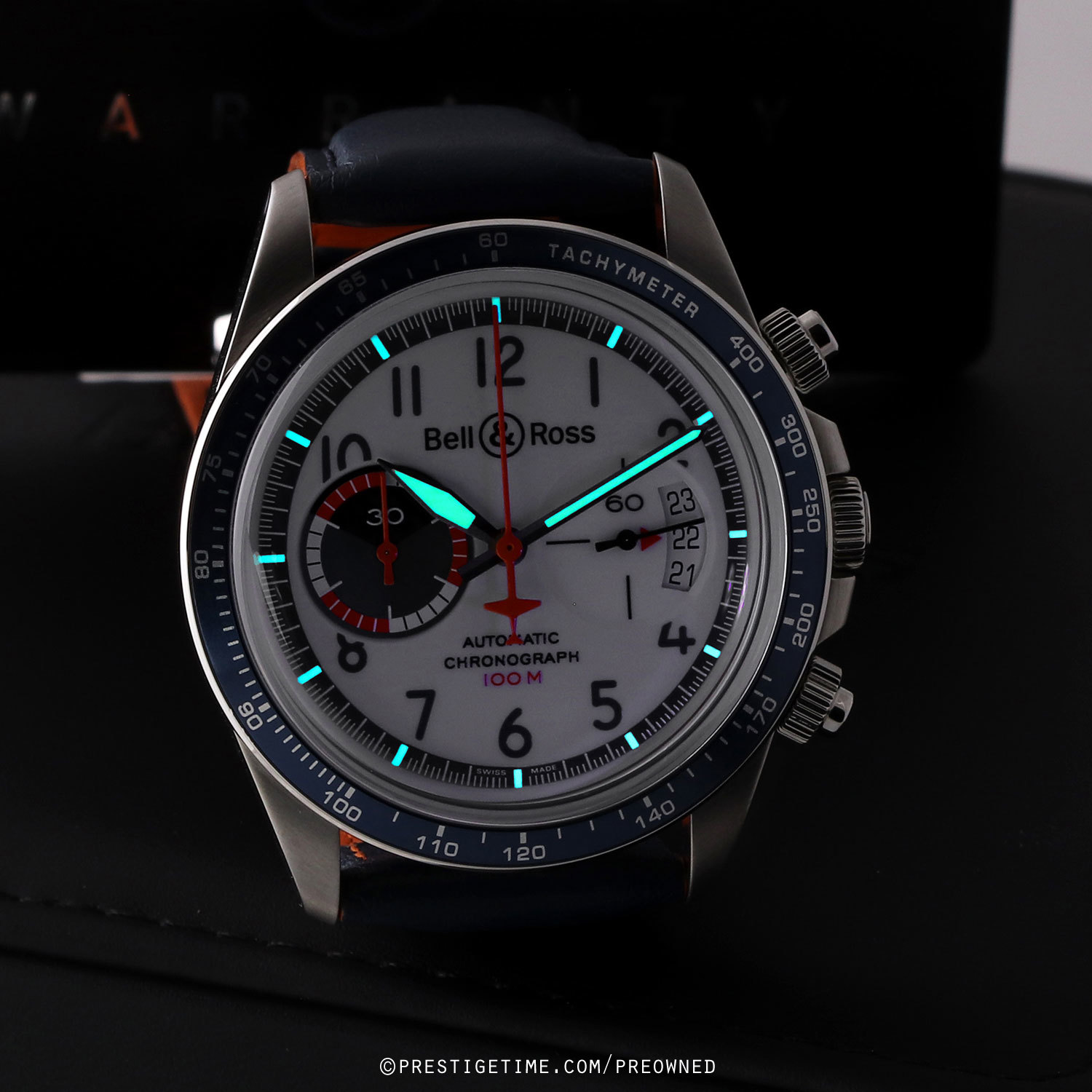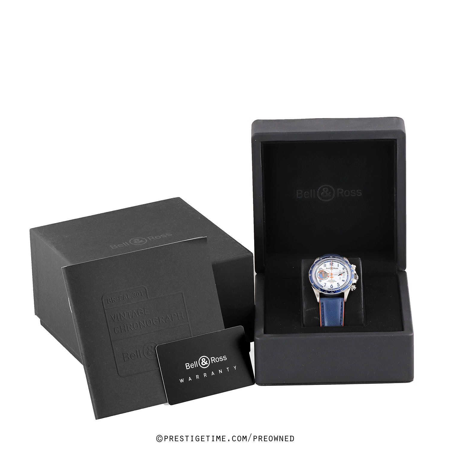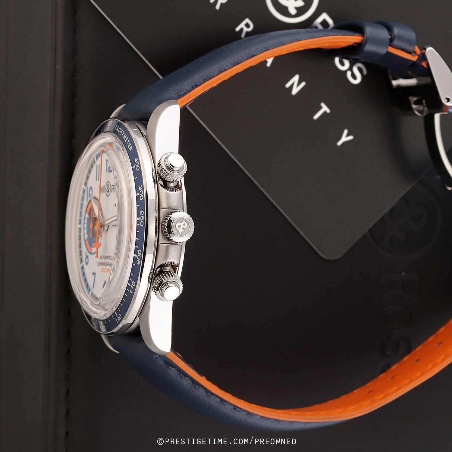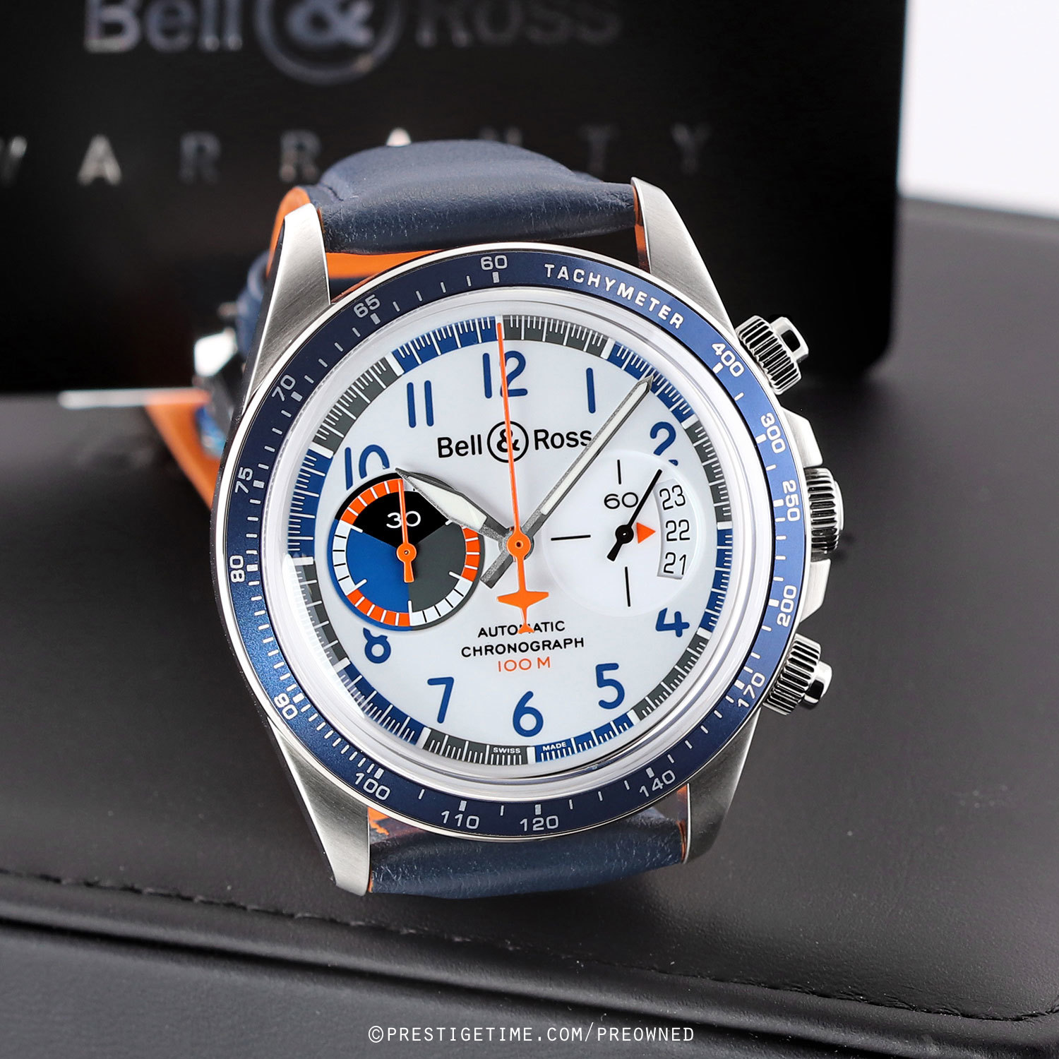 Strap: Fitted on its original Bell & Ross blue calfskin leather strap with orange lining & a stainless steel push-button deployant clasp. The strap is unworn, in new condition with its full wear lifespan remaining.