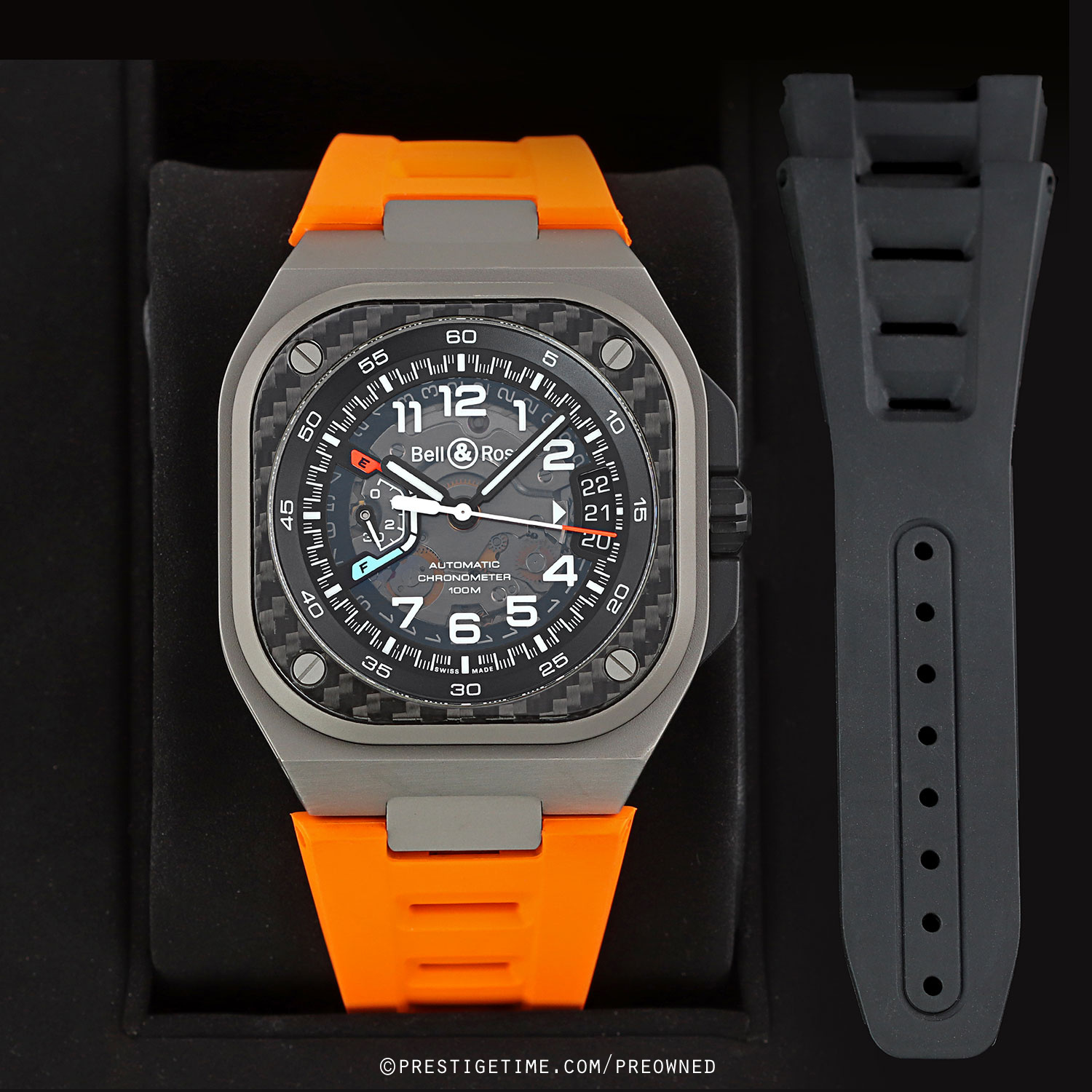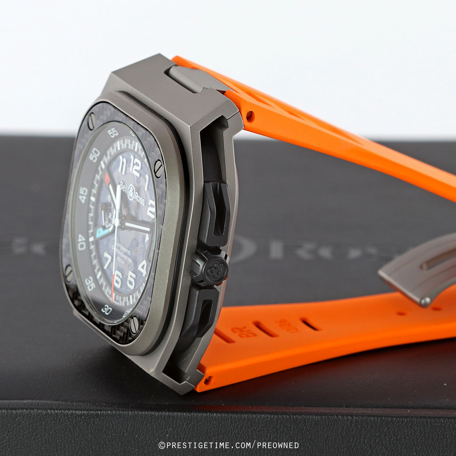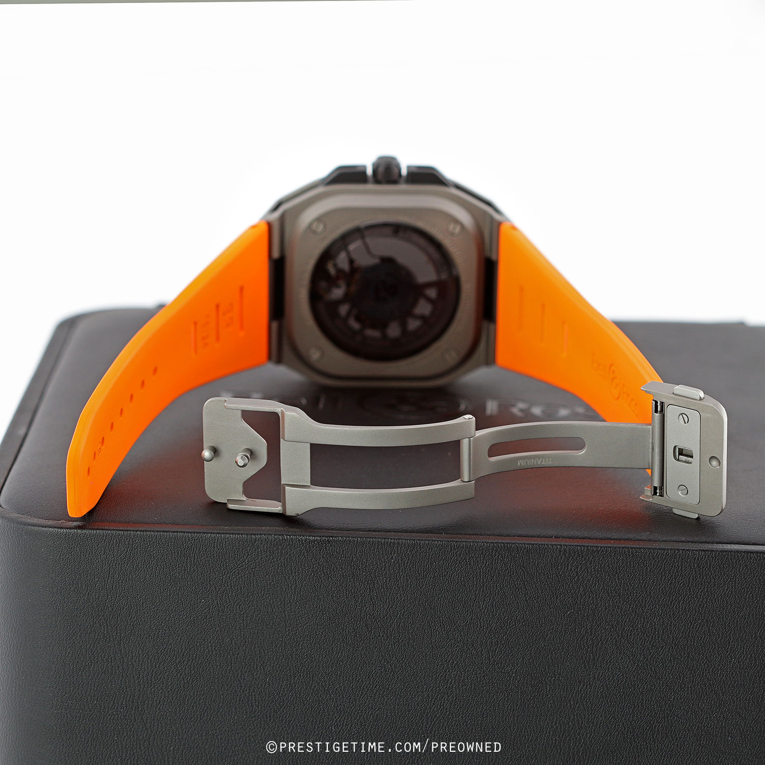 - Fitted on a Bell & Ross original orange rubber strap with a sandblasted finished titanium push-button deployant buckle. The strap is in near brand new condition, with its full wear lifespan remaining. We would be comfortable rating the strap as in 99% overall condition.
