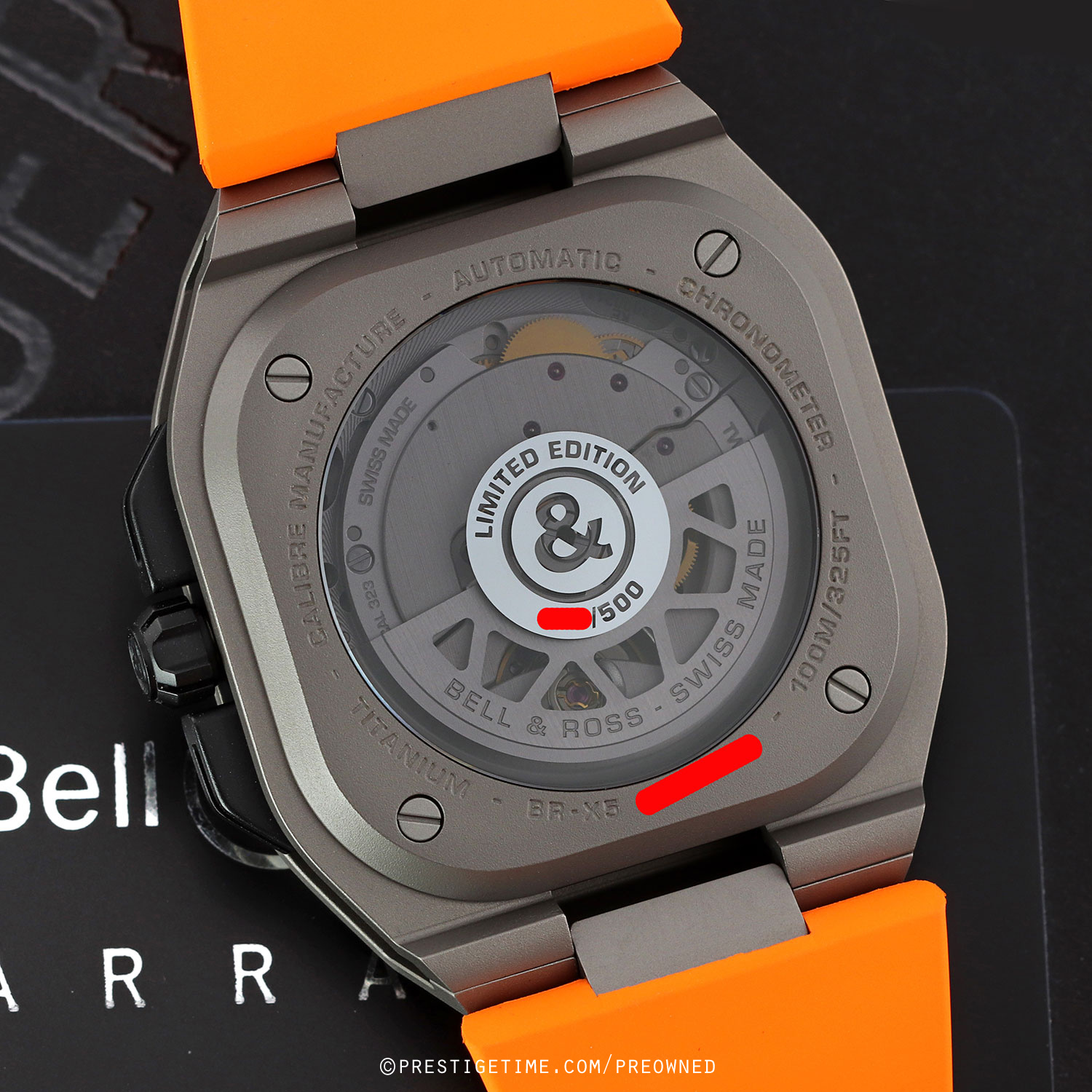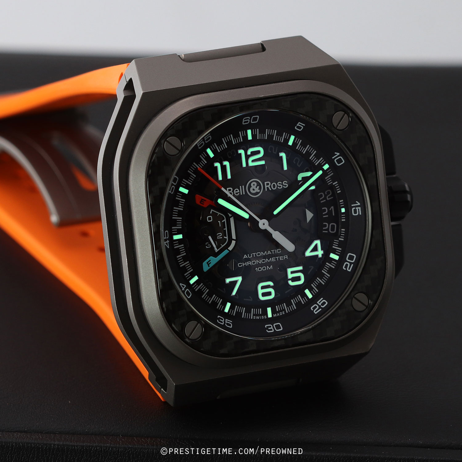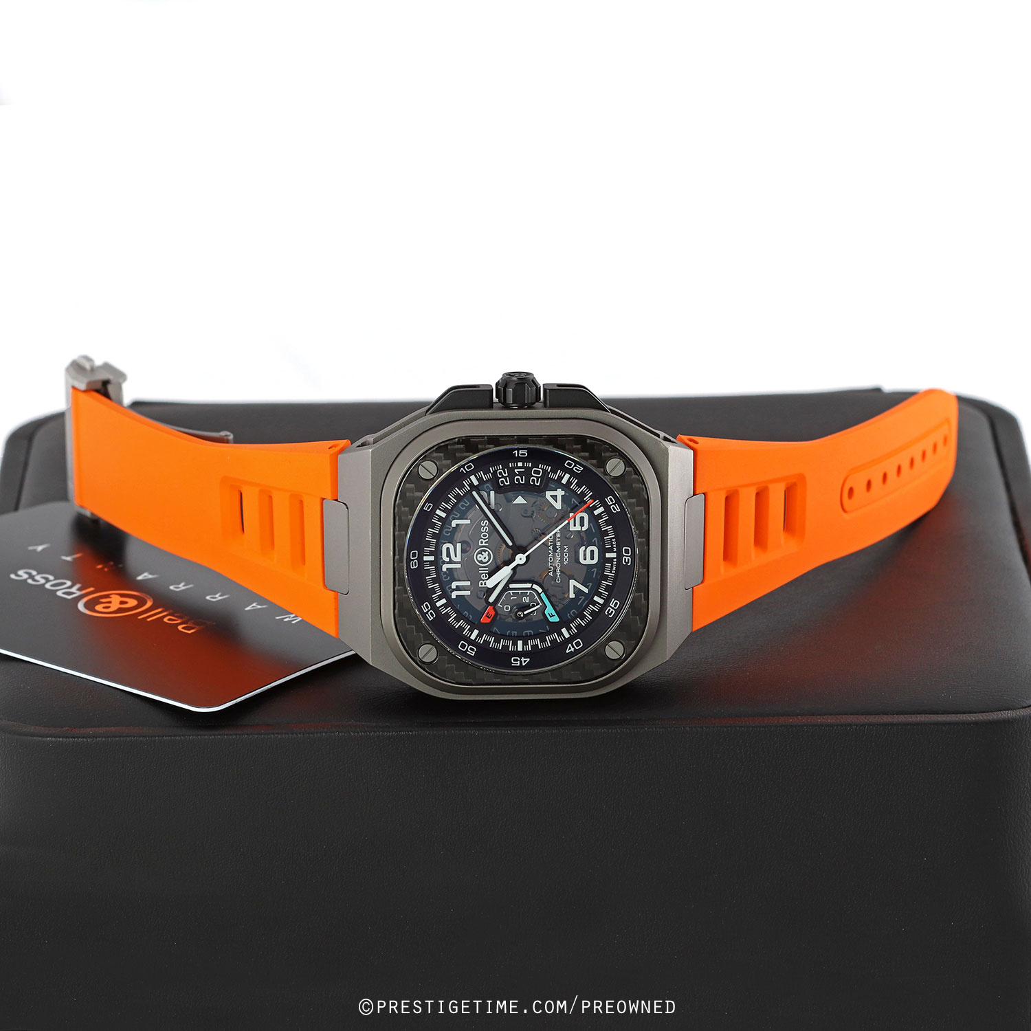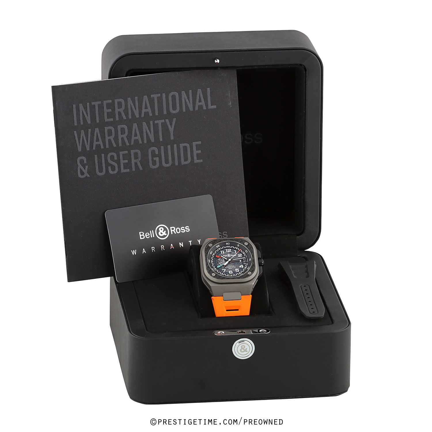 - Fitted on a Bell & Ross original orange rubber strap with a sandblasted finished titanium push-button deployant buckle. The strap is in near brand new condition, with its full wear lifespan remaining. We would be comfortable rating the strap as in 99% overall condition.