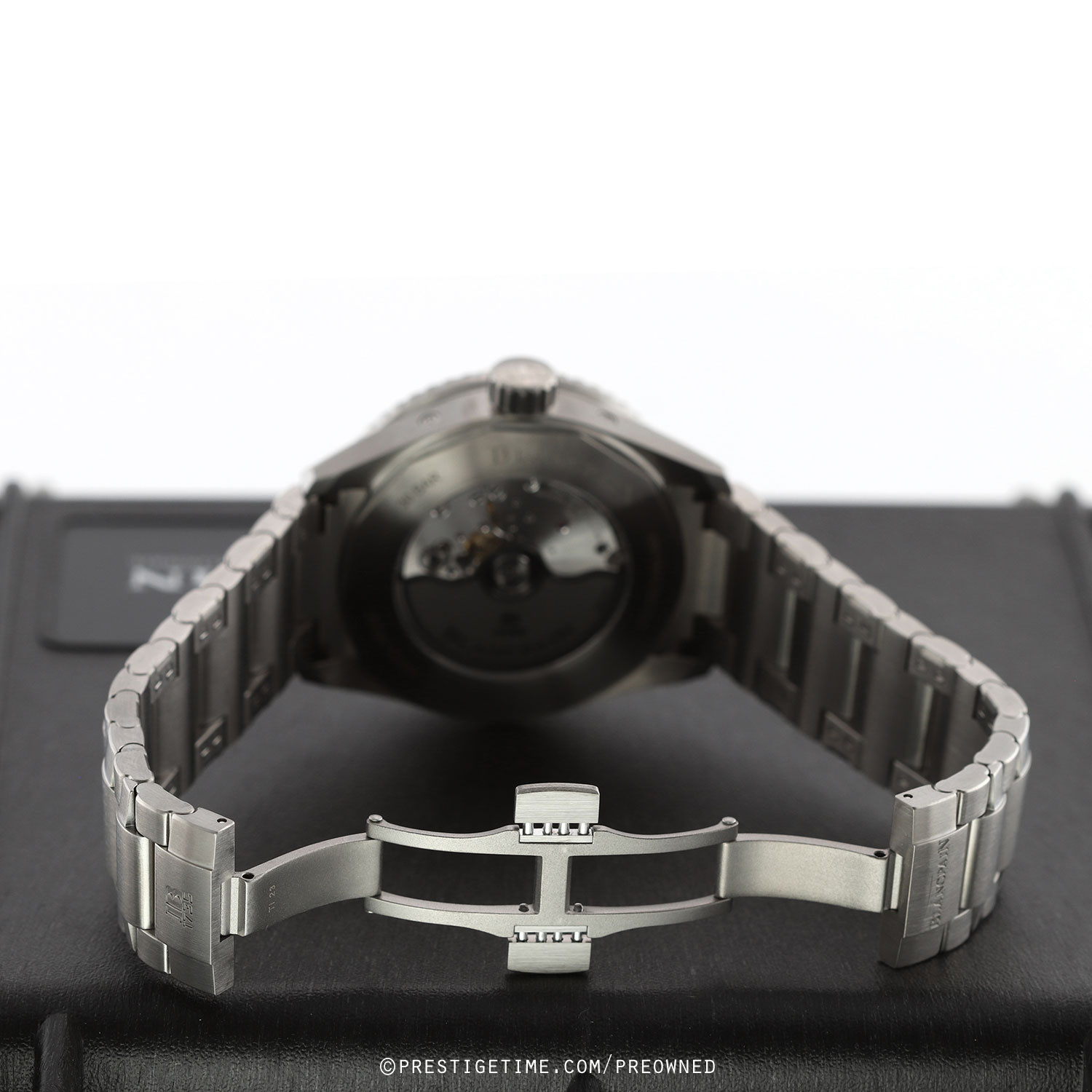 Case: Brushed titanium case. Brushed titanium bezel with matte dark grey ceramic bezel ring featuring Liquidmetal® graduating indications & a luminous filled dot at the starting point. Dark grey dial with a fine sunray finish. Darkened polished hands, the hour, minutes & seconds hands with luminous fill. Applied darkened polished hour markers with luminous fill.