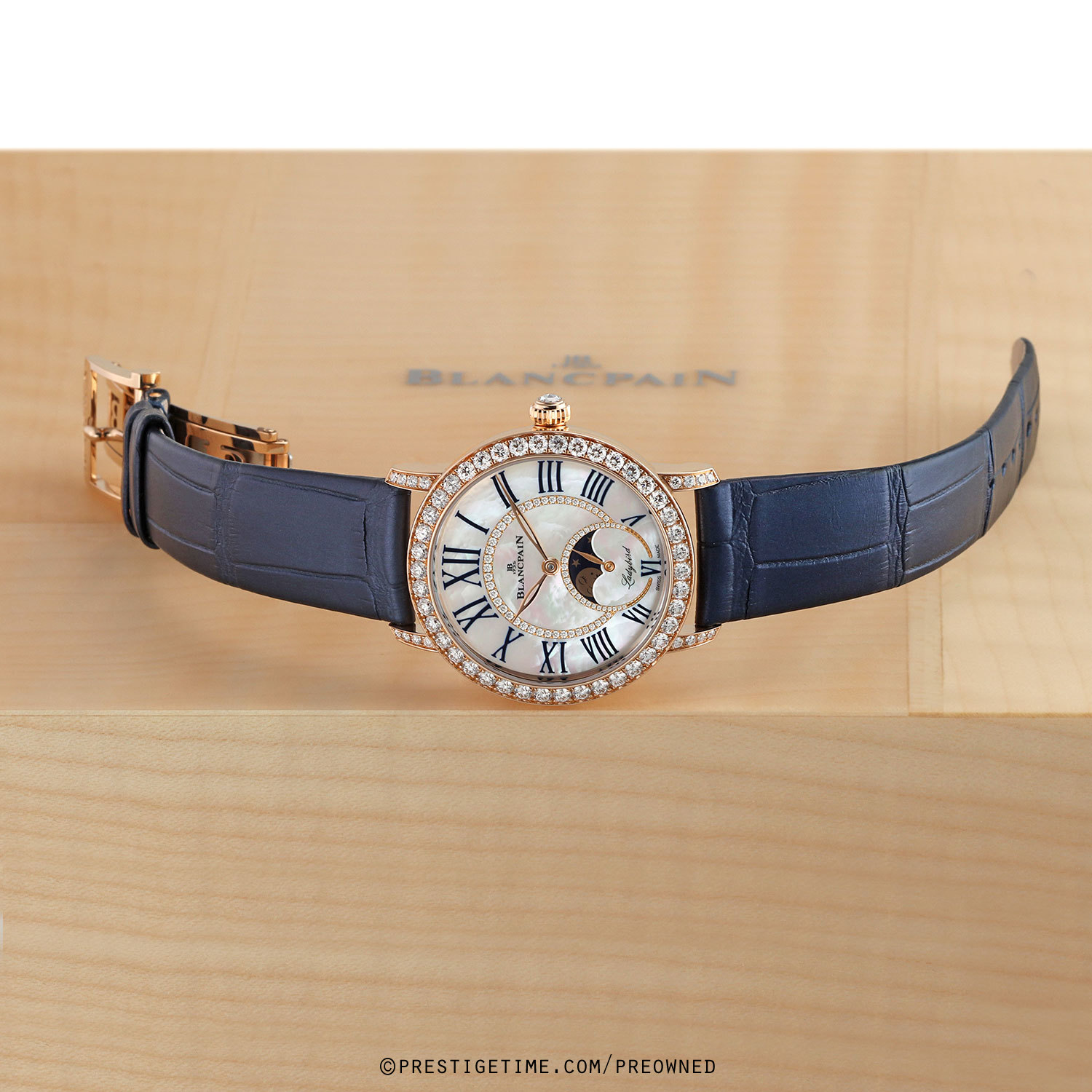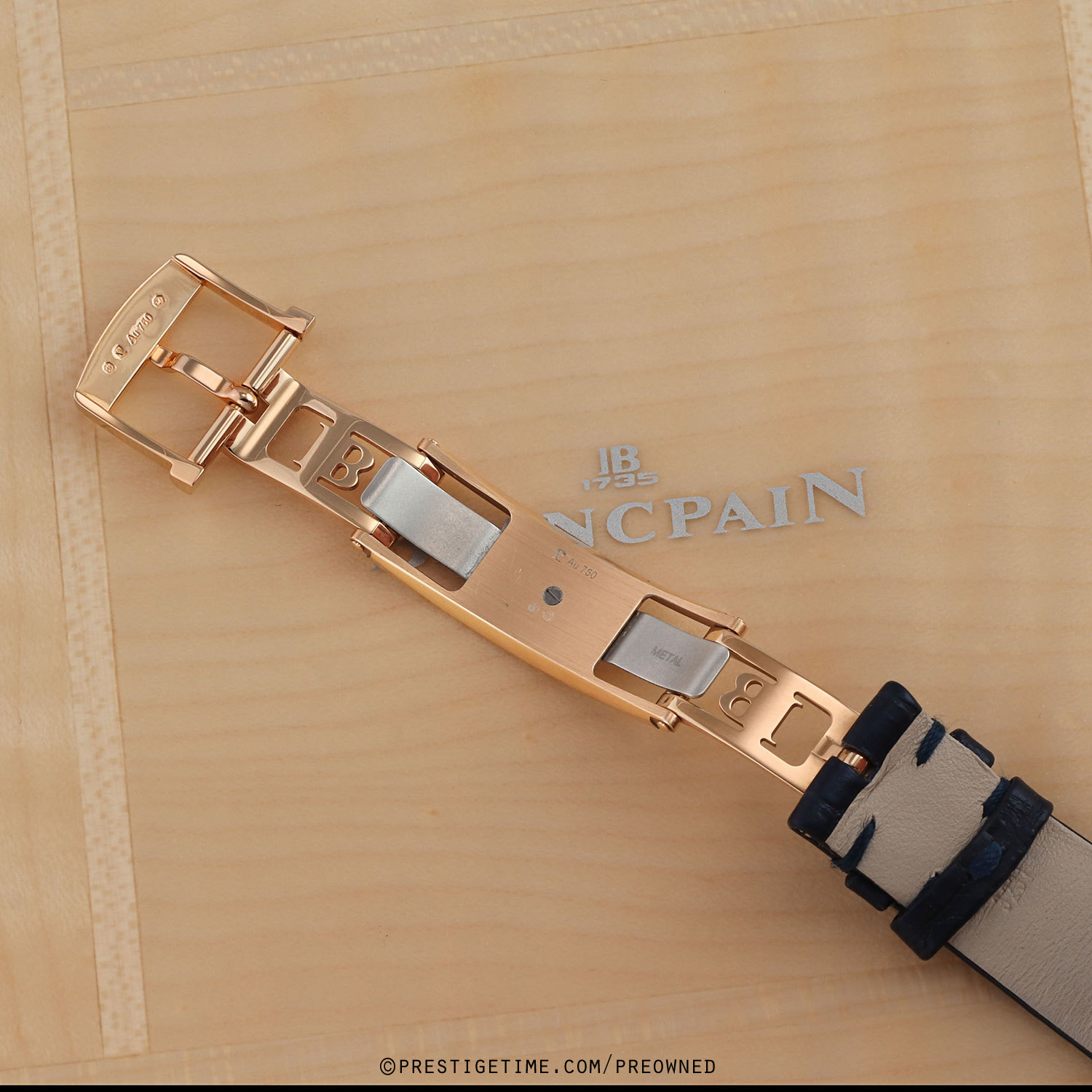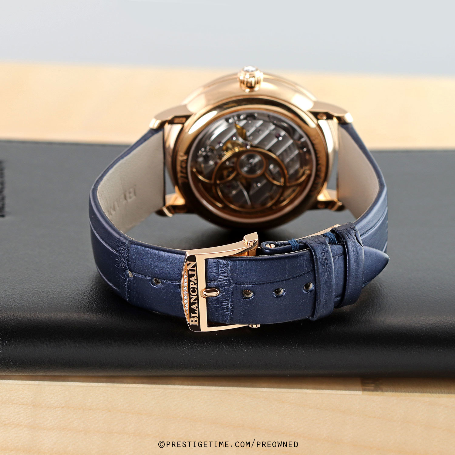 - Fitted on its original Blancpain midnight blue alligator leather strap with a solid 18kt rose gold butterfly style deployant buckle set with 9 diamonds. The strap is in excellent, near new condition with the vast majority of it wear lifespan remaining. We would be comfortable rating the strap as in 98% overall condition.