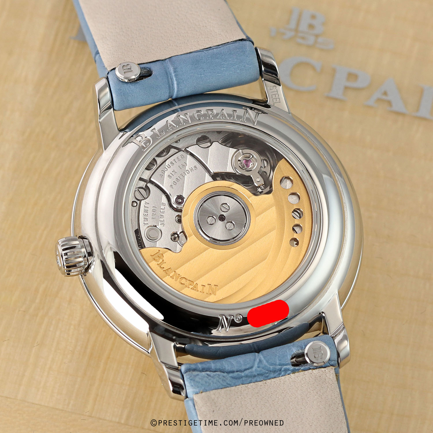Movement: Powered by a Blancpain caliber 913, beats at 21,600 vph (3Hz), contains 20 jewels & has a power reserve of +/- 40 hours. The movement features a silicon hairspring & gold plated rotor.
