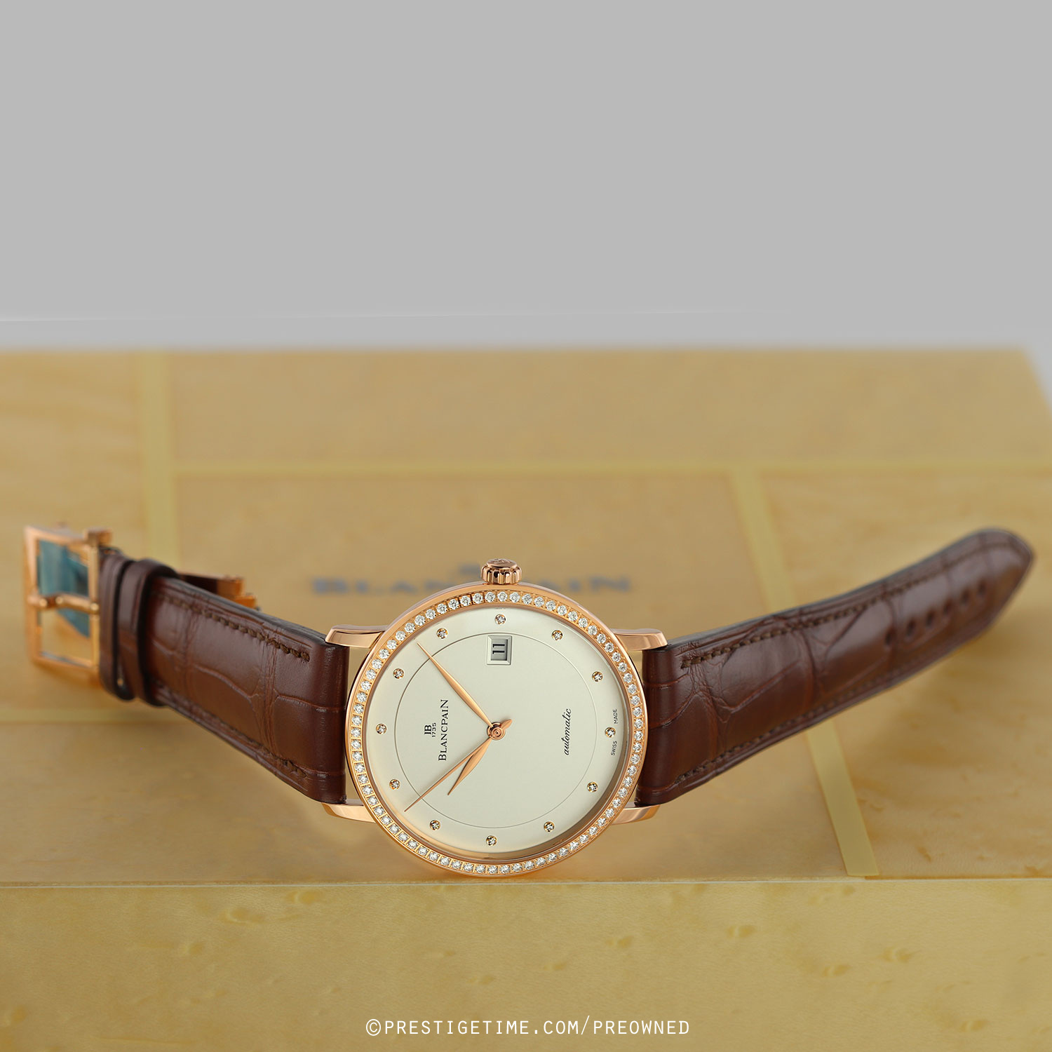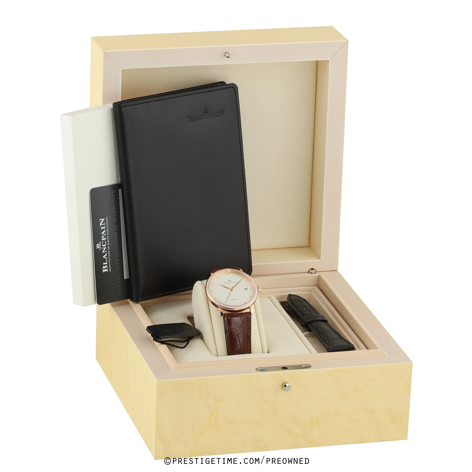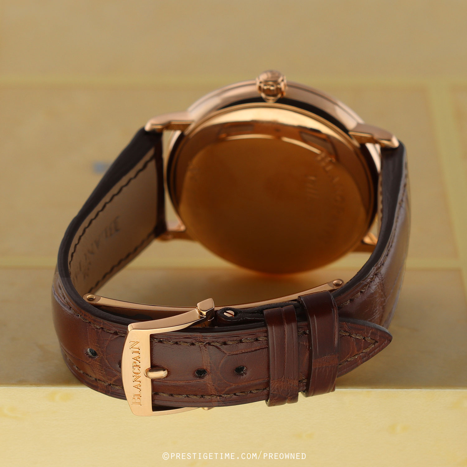 - Fitted on a Blancpain original brown alligator leather strap with a solid 18kt rose gold deployant buckle. The strap is in unworn condition with its full wear lifespan remaining.