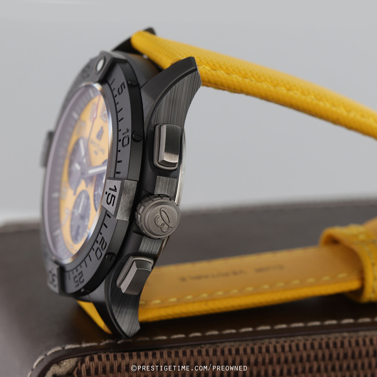 Case: Brushed black ceramic case and bezel. Bezel with engraved 60 minute scale & raised 15 minute tabs with a luminous start dot. Matte yellow dial. Solid black sub-dials and dial flange. Darkened grey hands with luminous fill. Applied polished hour markers with luminous fill. Fine printed minute/seconds & fractions of a seconds track on the dial flange. Date window at 6 o'clock. Small seconds sub-dial at 9 o'clock.