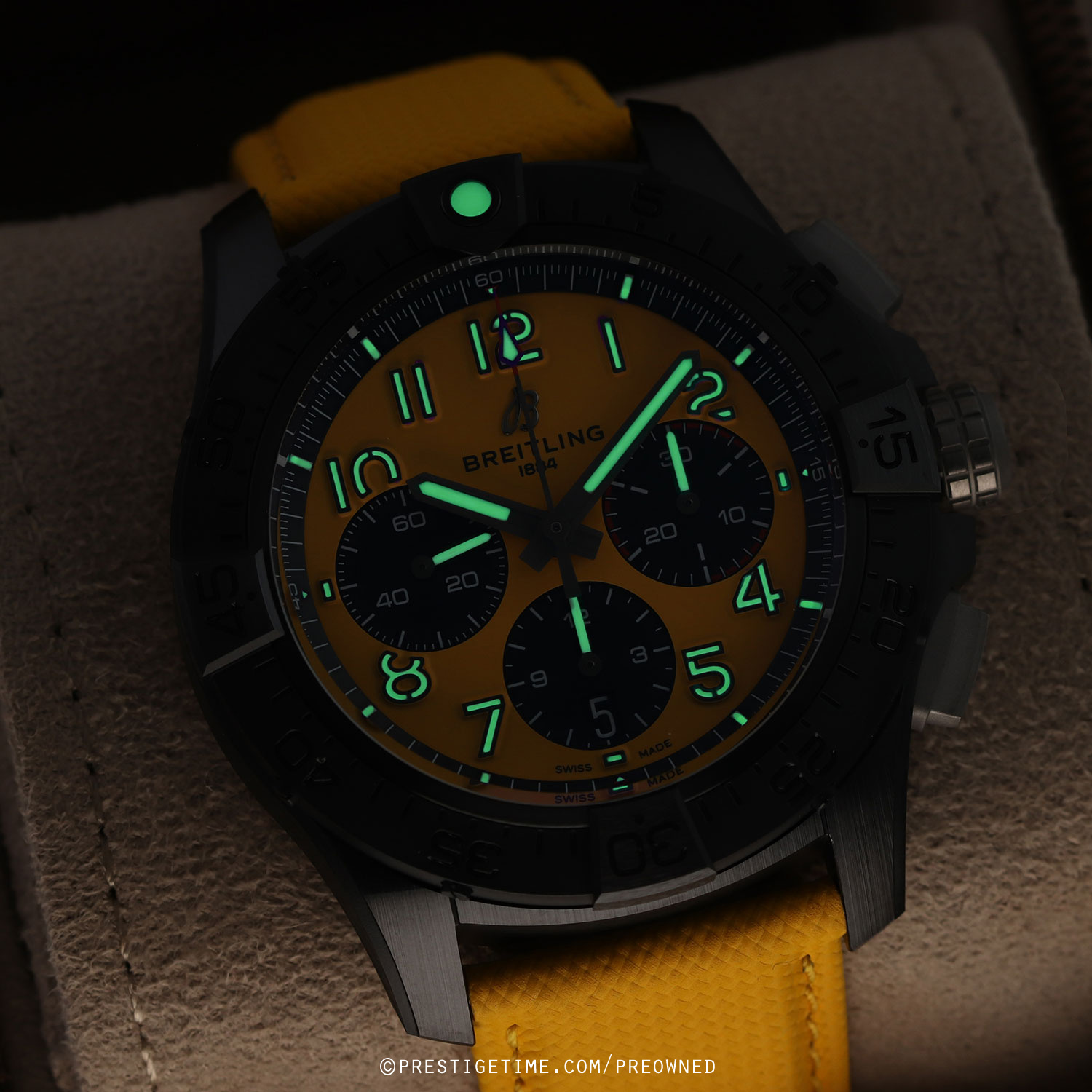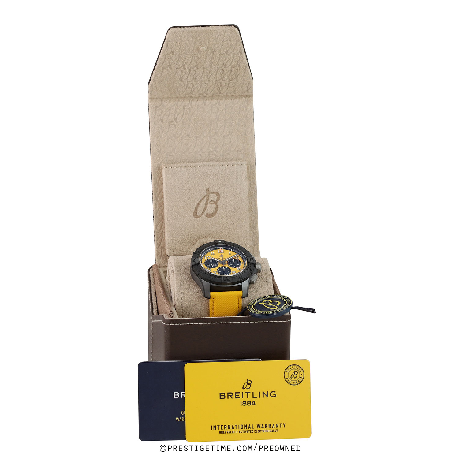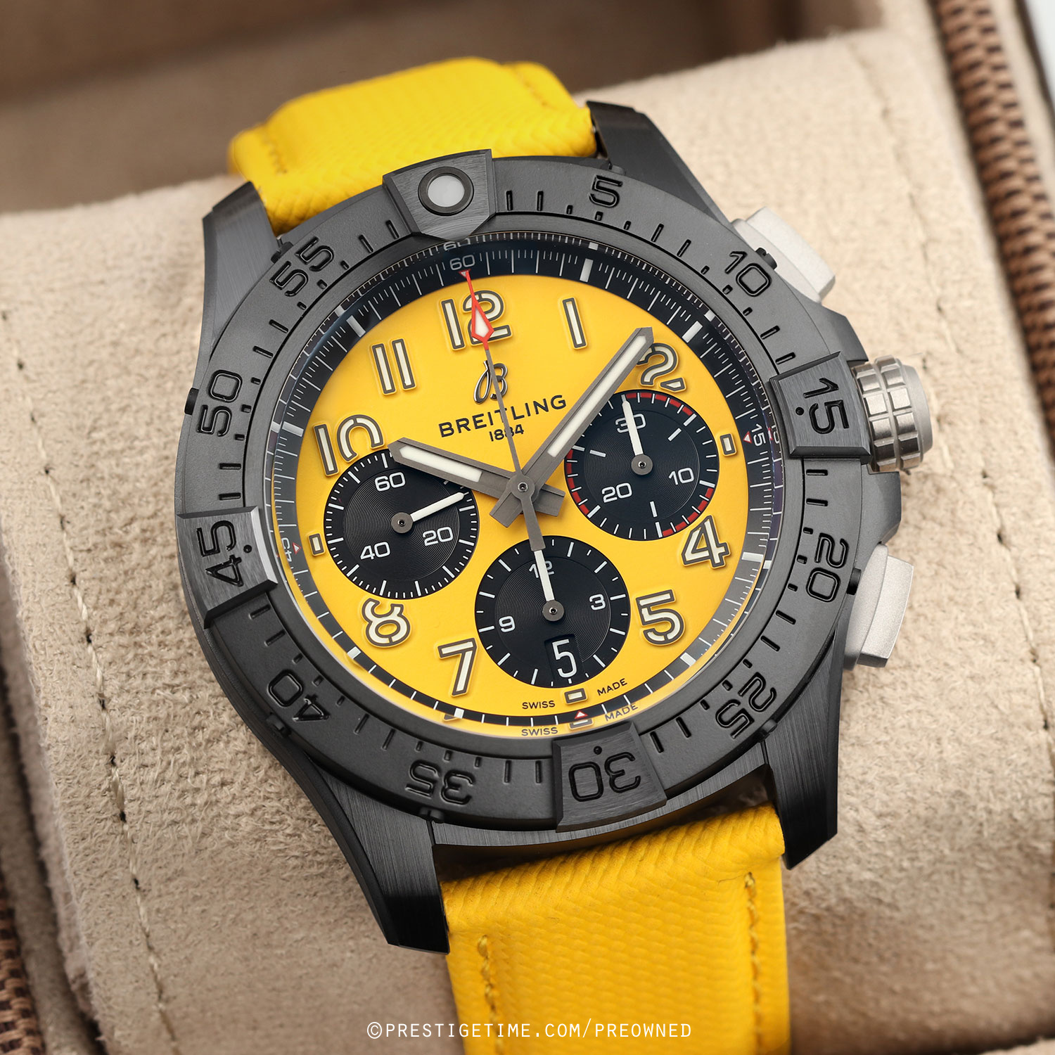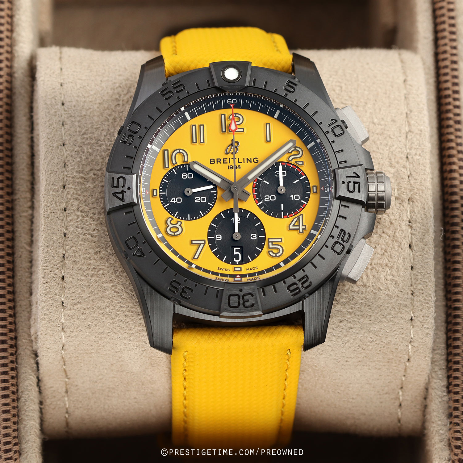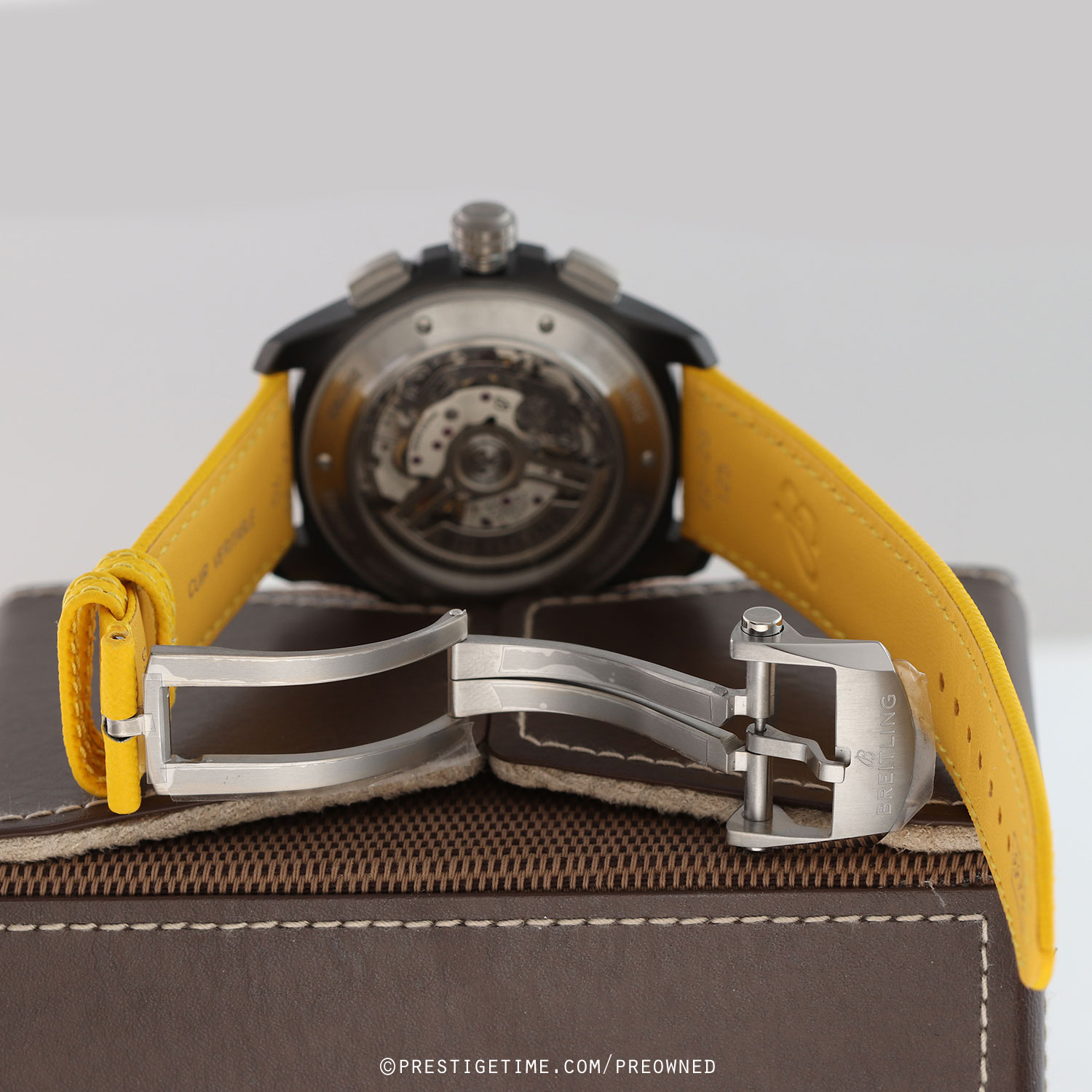 Strap: Fitted on its original Breitling yellow calfskin leather strap with a titanium push-button deployant buckle. The strap is brand new, crisp & unworn with its full wear lifespan remaining.
