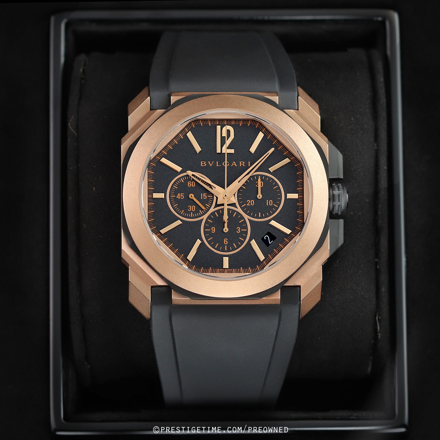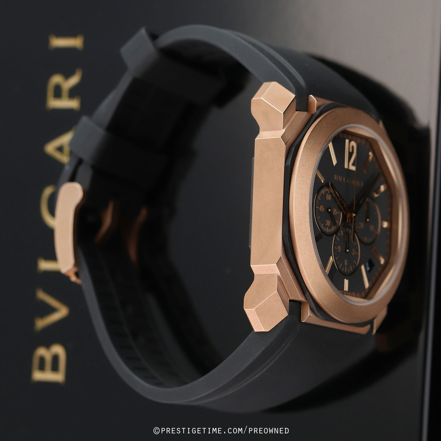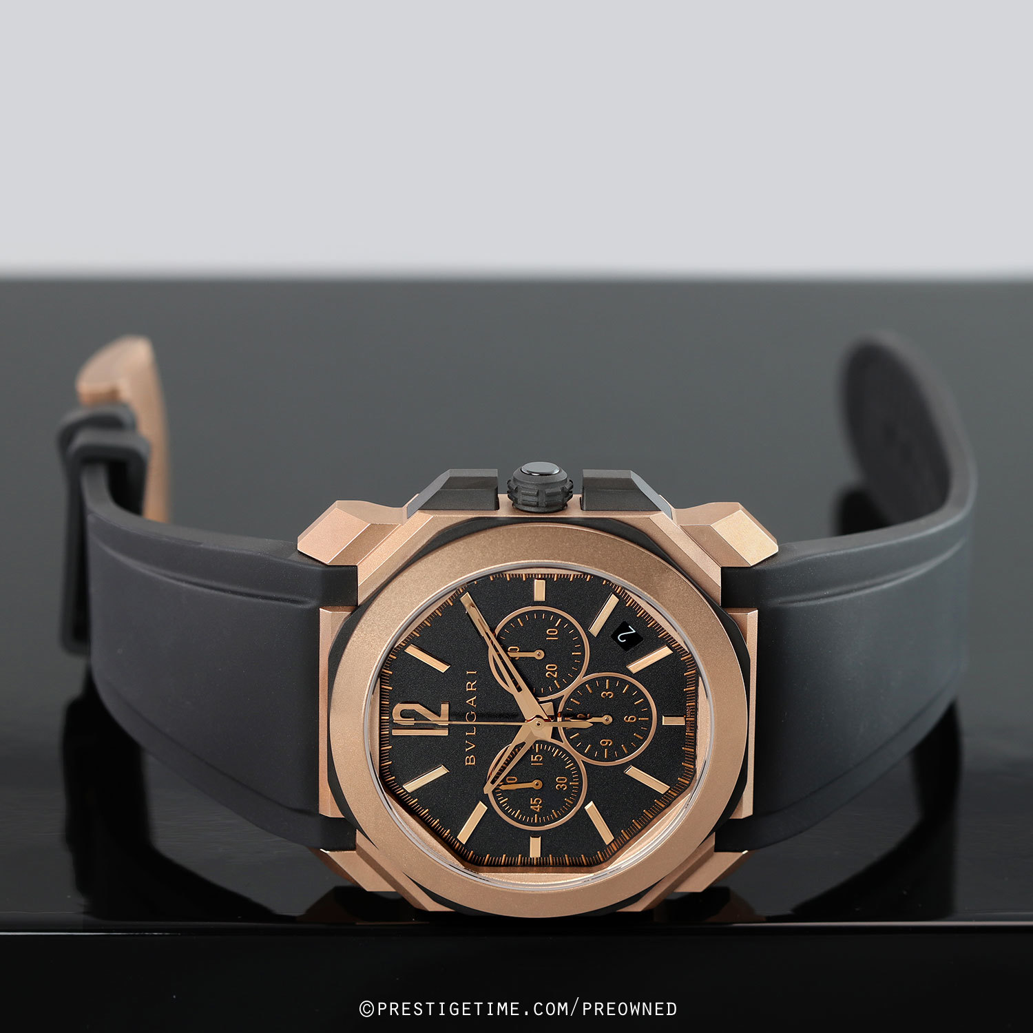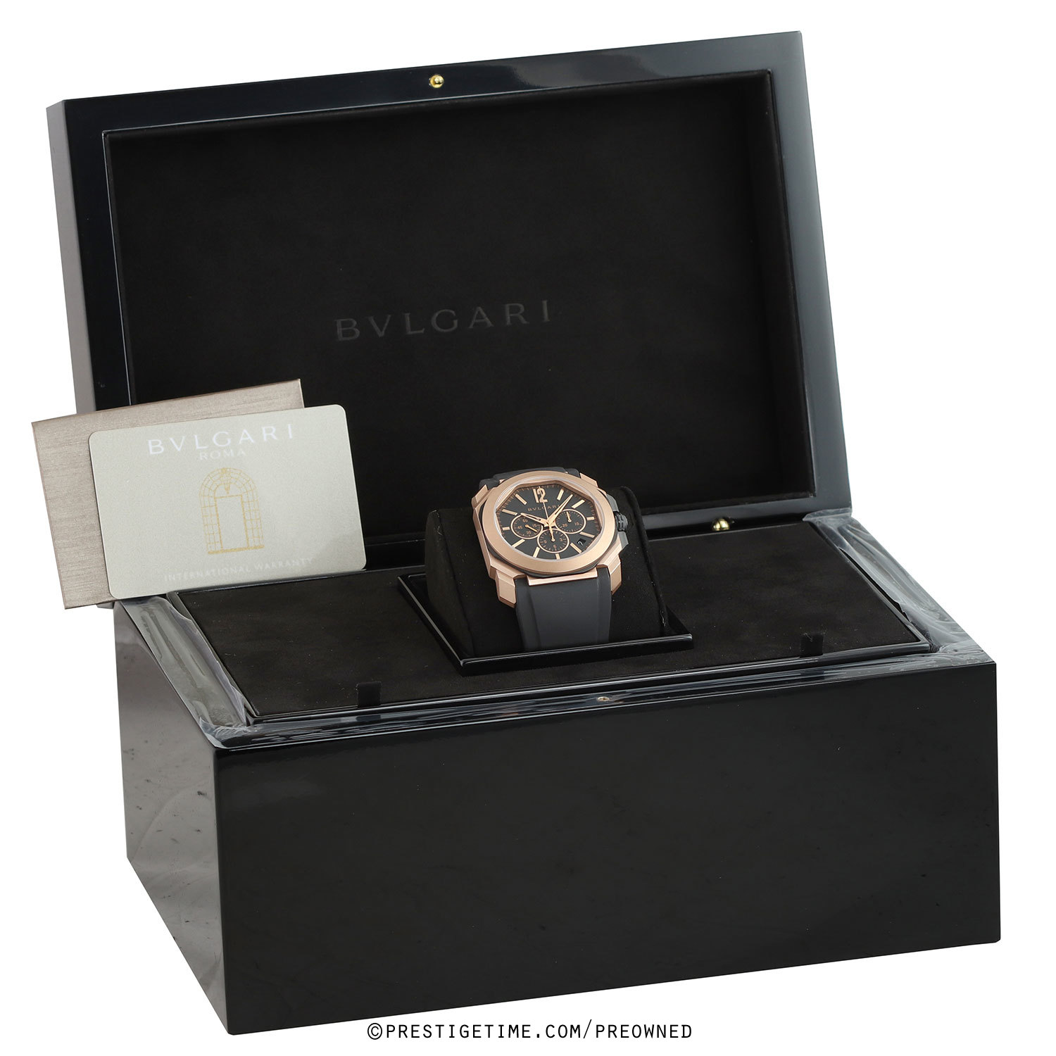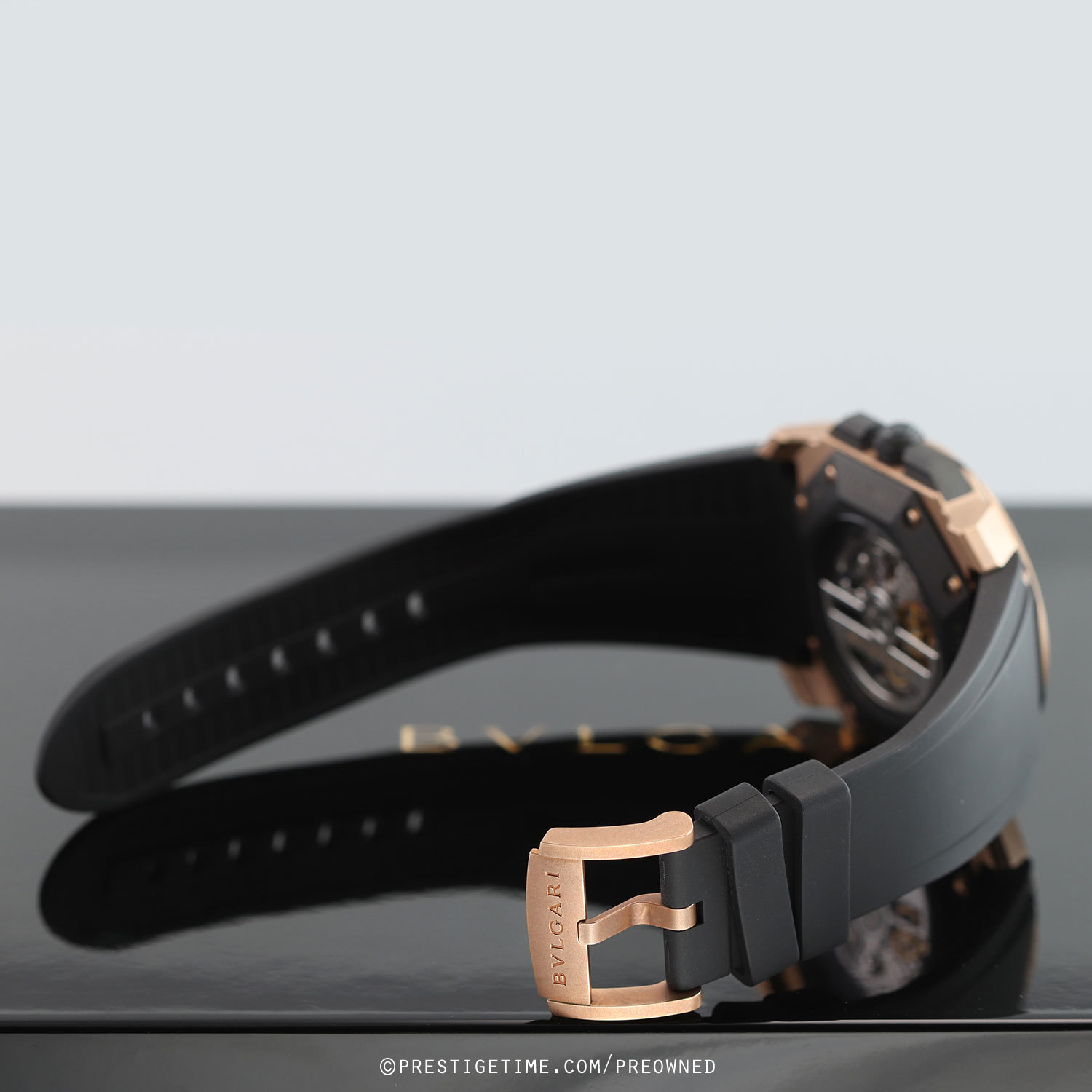 Strap: Fitted on its original Bulgari black rubber strap with a solid 18kt rose gold tang buckle. The strap is unworn & in perfect new condition.