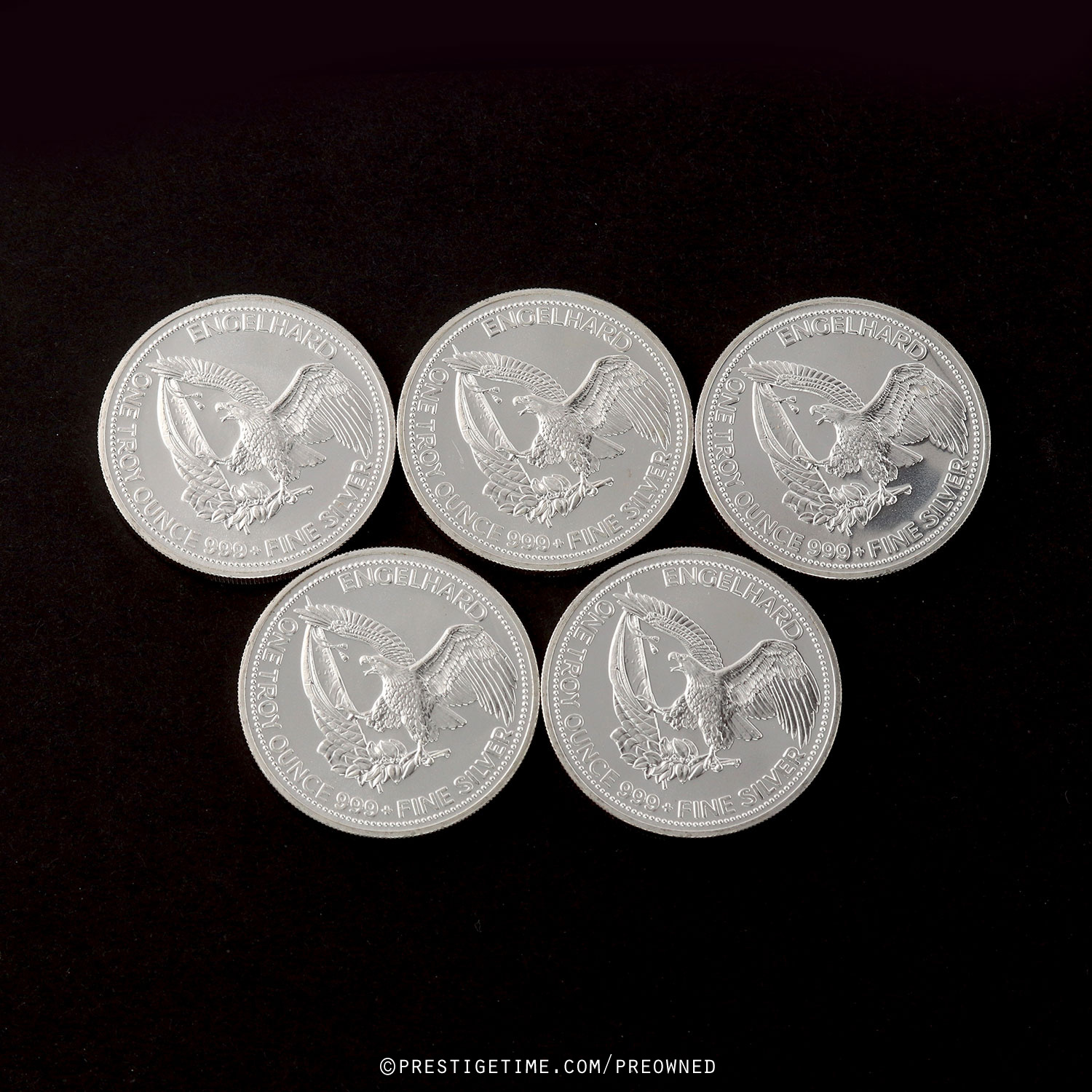 • 5 x 1 troy ounce 1986 Engelhard Prospector silver rounds of .999+ fine silver.