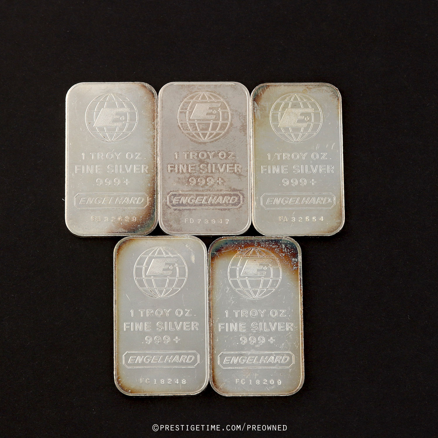 • 5 x 1 troy ounce vintage Engelhard 1 oz serialized bars of .999+ fine silver bars.