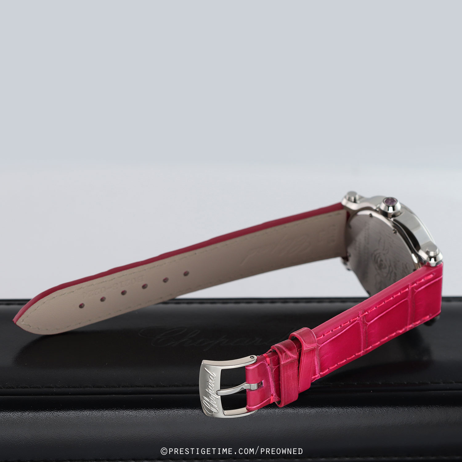 Strap: Fitted on a Chopard original fuchsia alligator leather strap with a polished stainless steel tang buckle. The strap is brand new & unworn with its full wear lifespan remaining.