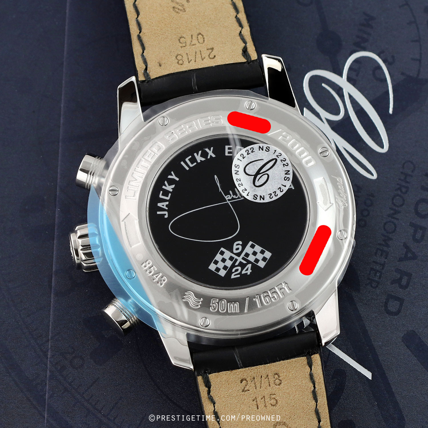 The Chopard Mille Miglia Jacky Ickx Edition V is a limited & numbered edition of 2000 pieces, created in tribute to Jacky Ickx’s legendary motorsport career and his record-setting six victories at the 24 Hours of Le Mans.! This special edition features a sapphire crystal case back with black underside printing, showcasing Jacky Ickx’s signature alongside the commemorative “6/24” motif framed by racing flags.
