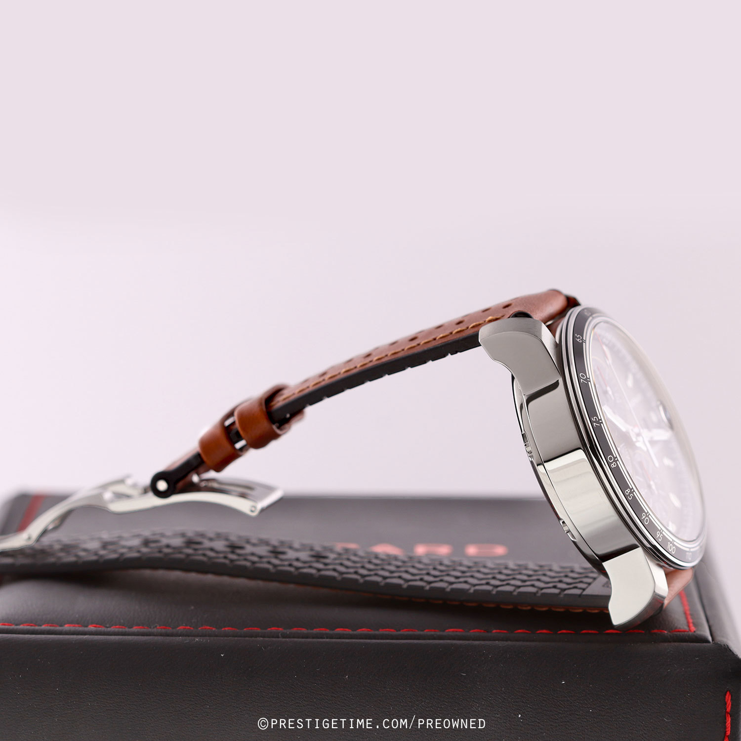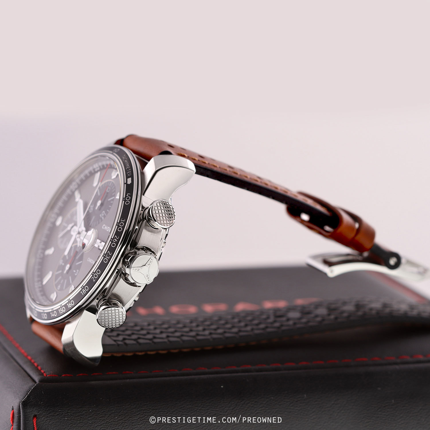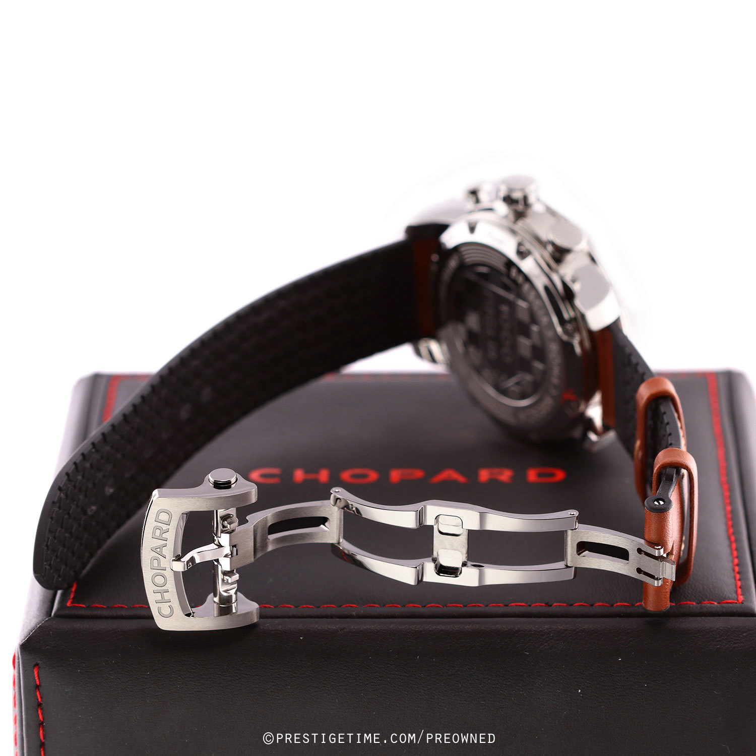 Strap: Fitted on its original Chopard brown perforated racing style calfskin strap with black tire-tread rubber lining & a stainless steel push-button deployant buckle. The strap is in excellent near new condition with the majority of its wear lifespan remaining. We would grade this trap in 96%+ condition.