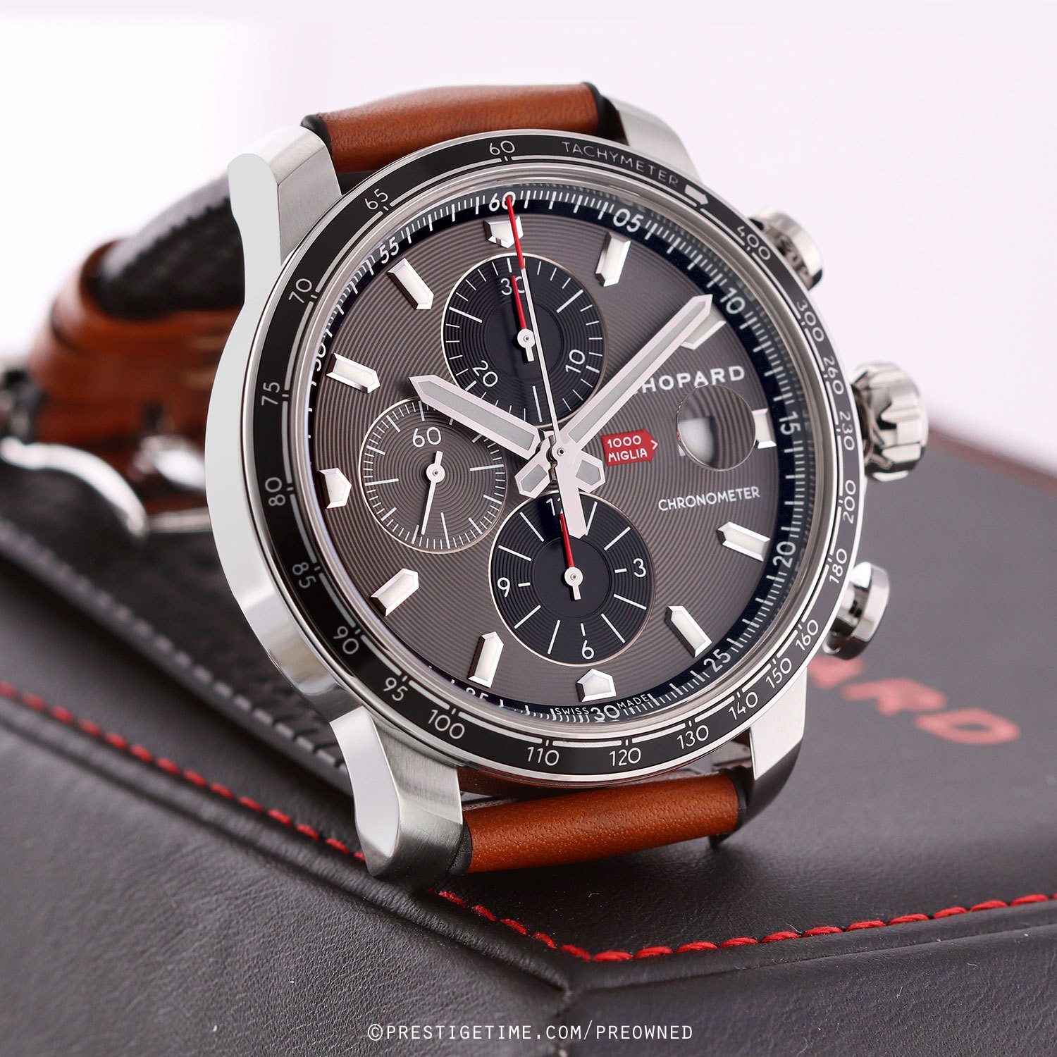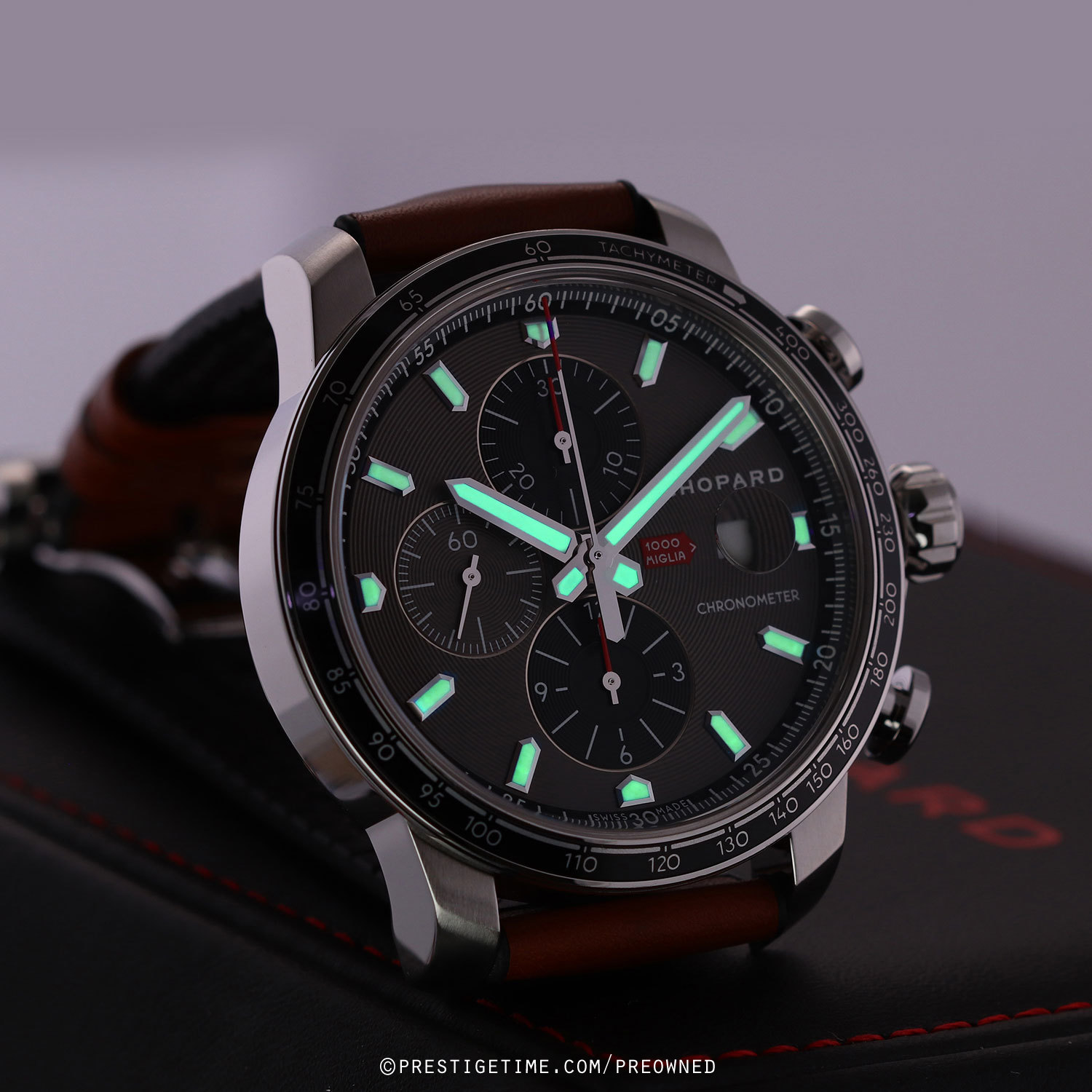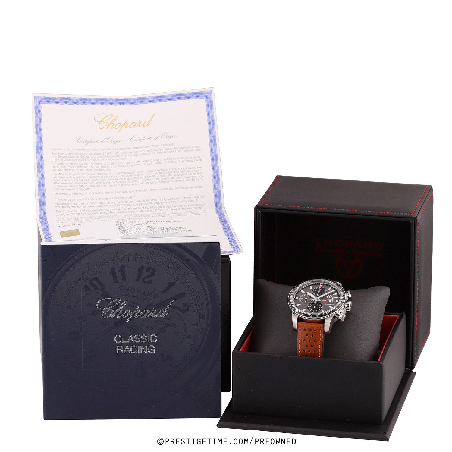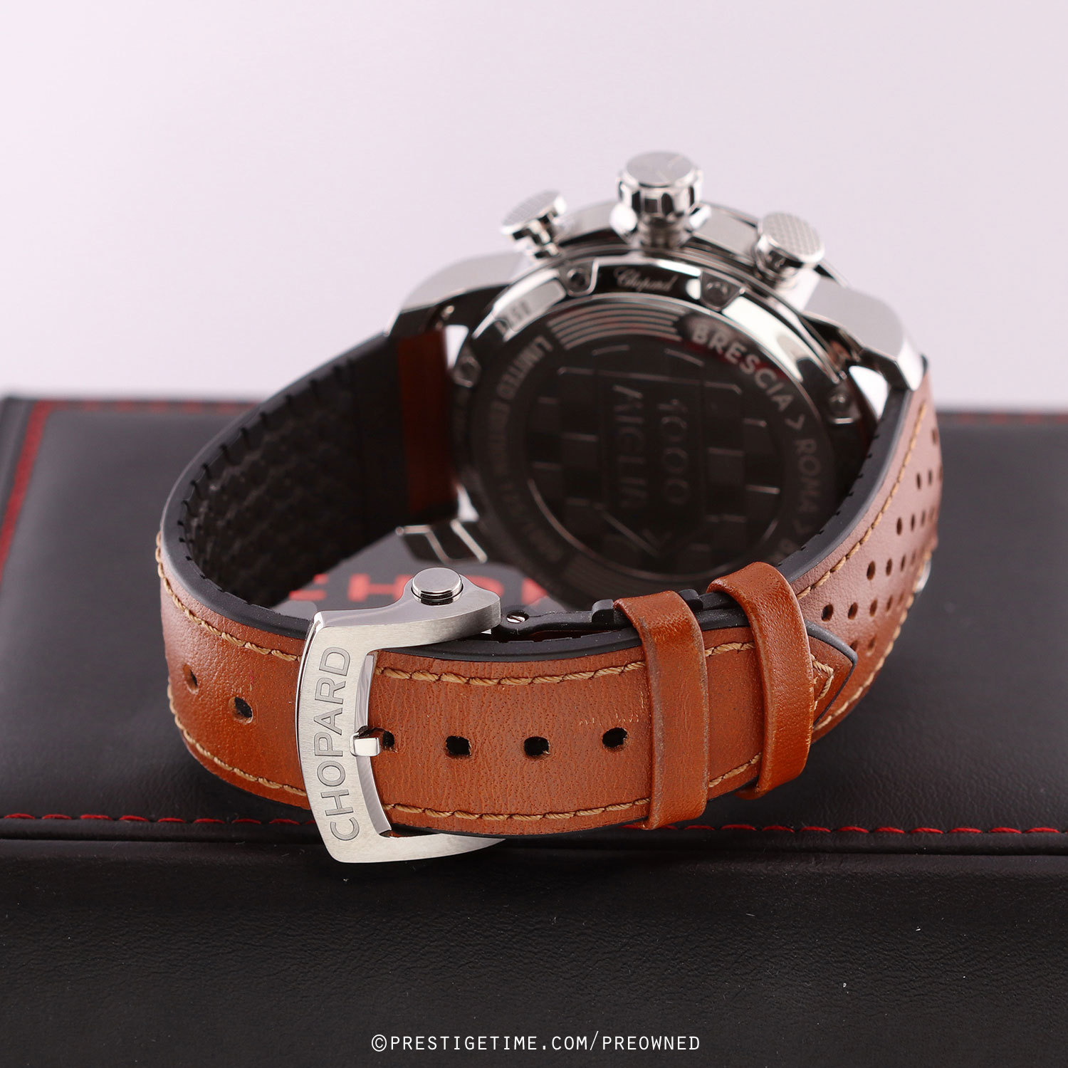 Strap: Fitted on its original Chopard brown perforated racing style calfskin strap with black tire-tread rubber lining & a stainless steel push-button deployant buckle. The strap is in excellent near new condition with the majority of its wear lifespan remaining. We would grade this trap in 96%+ condition.