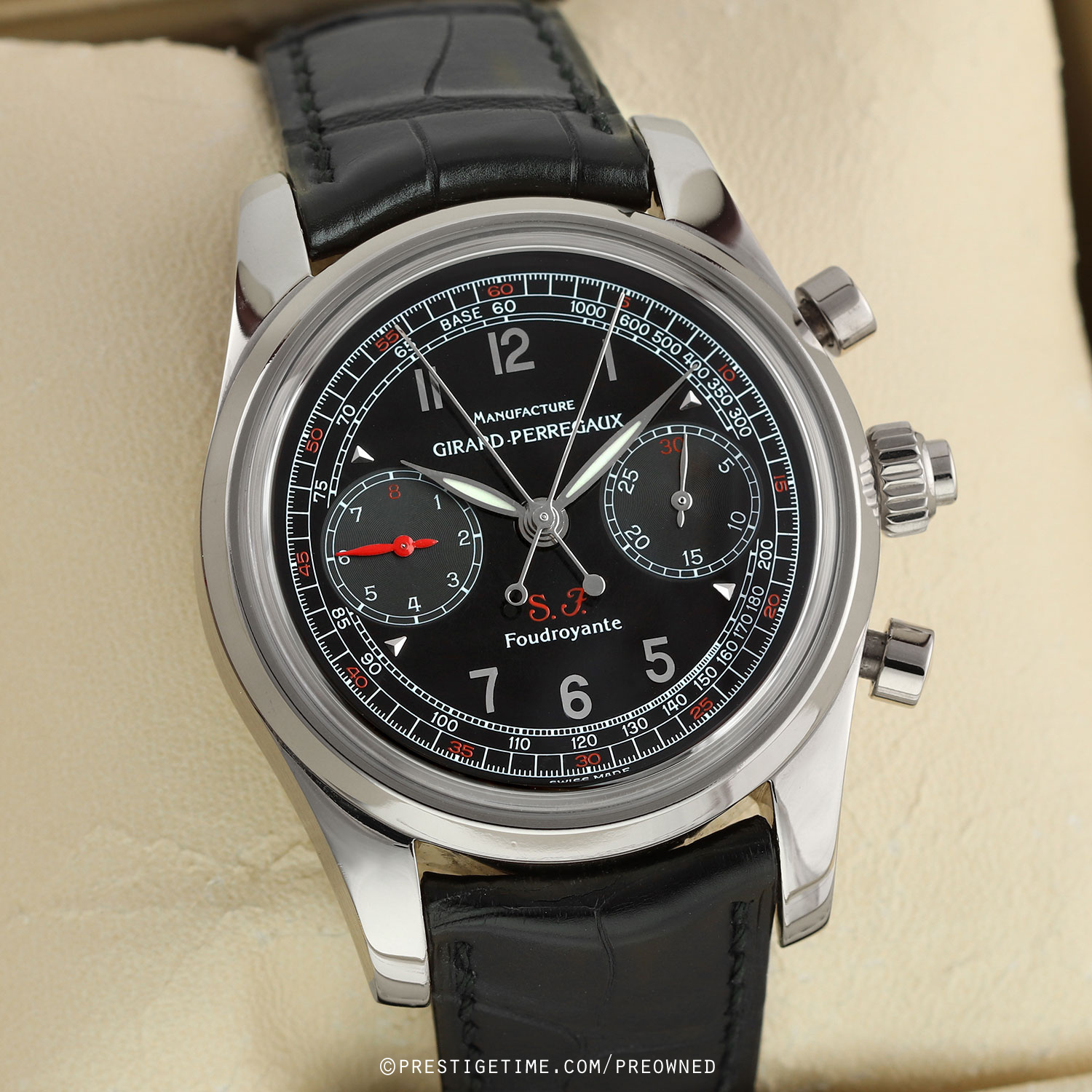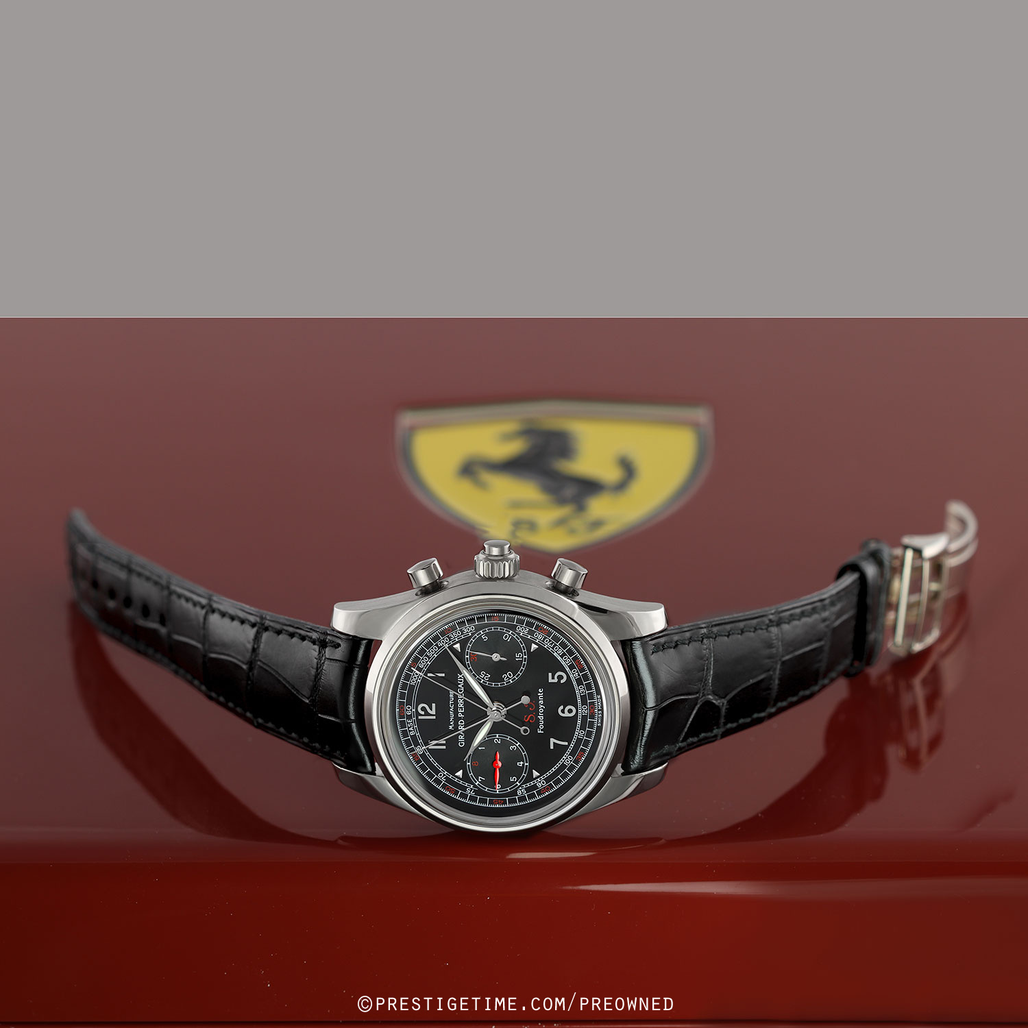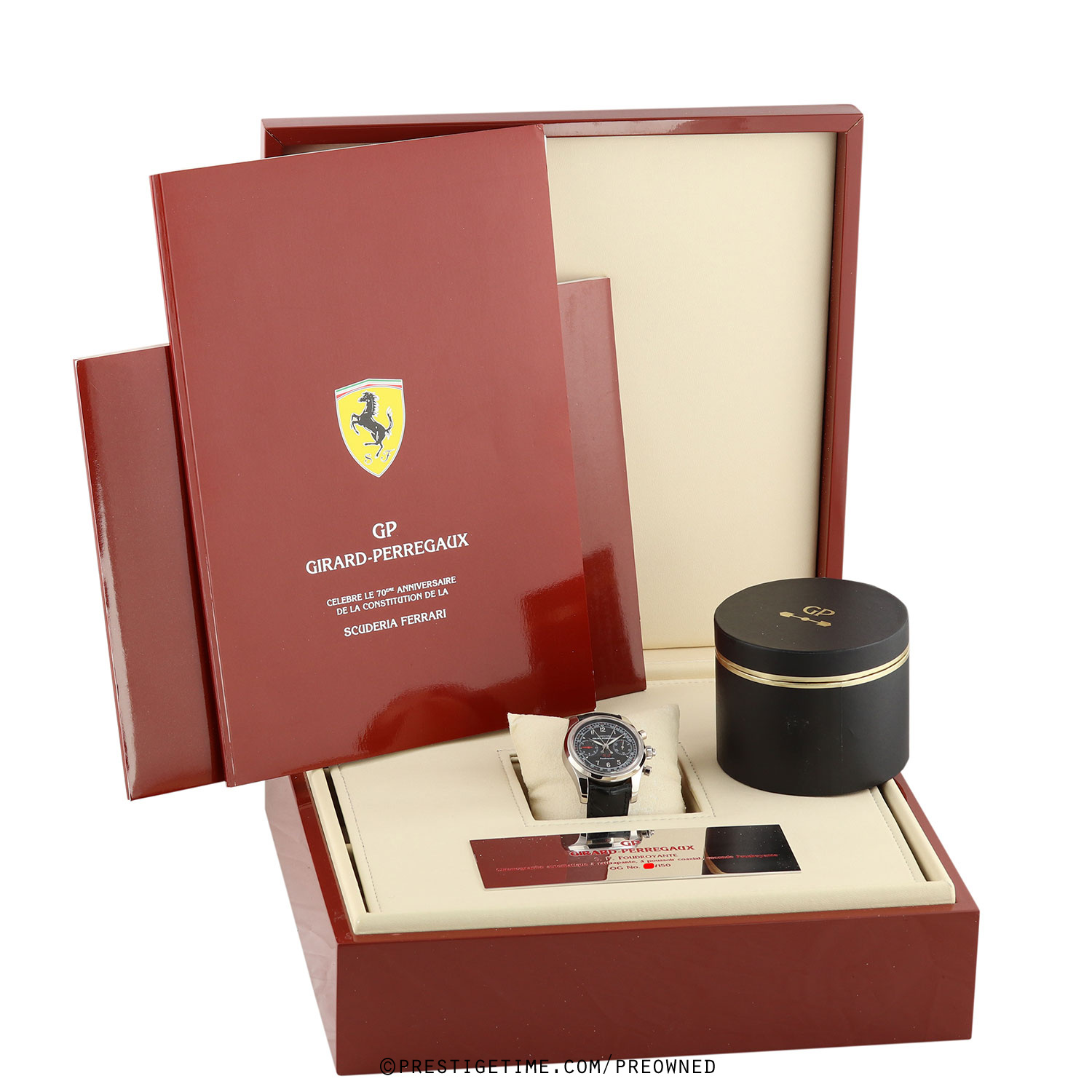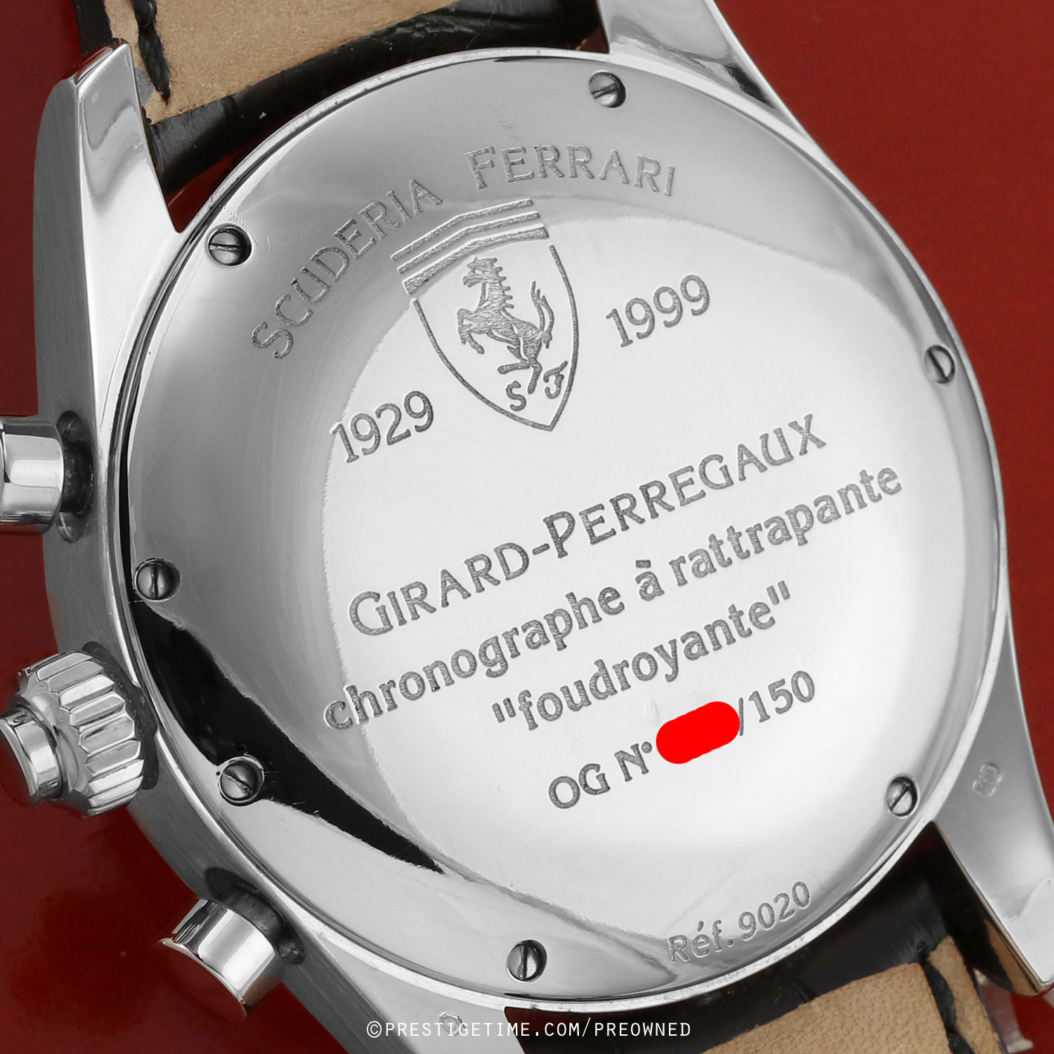 Factory service completed 12/2025, with a factory 1 year service warranty expiring 12/2026.Girard-Perregaux Scuderia Ferrari Chronograph Rattrapante Foudroyante – limited & numbered edition of 150 pieces, commemorating the 70th anniversary of Scuderia Ferrari (1929–1999). The caseback features an engraving of the Scuderia Ferrari prancing horse logo.