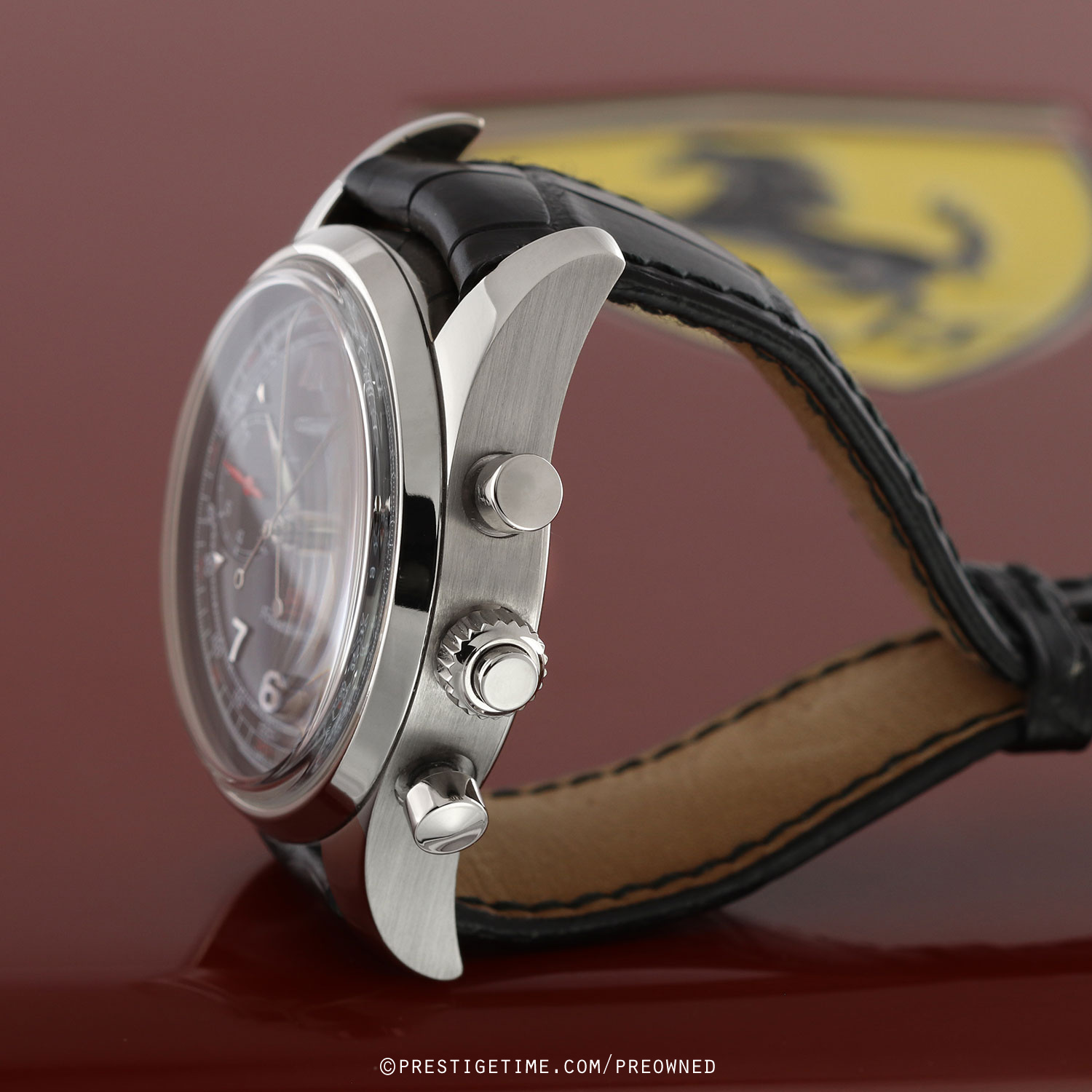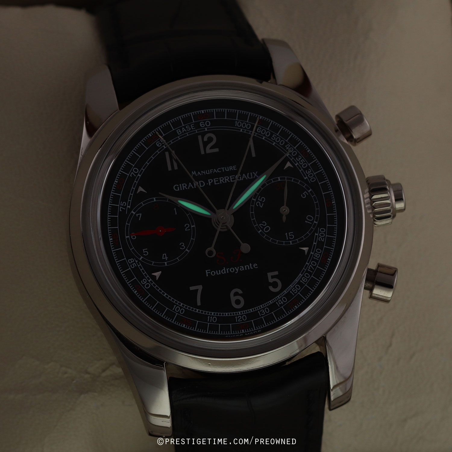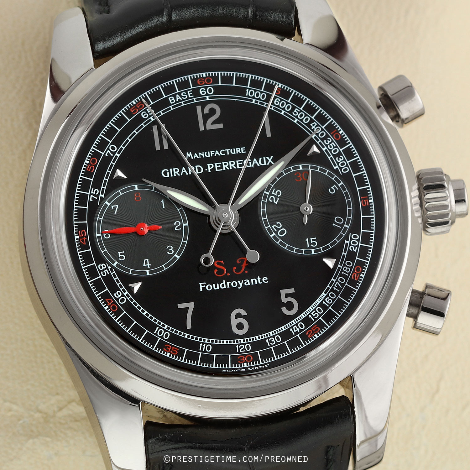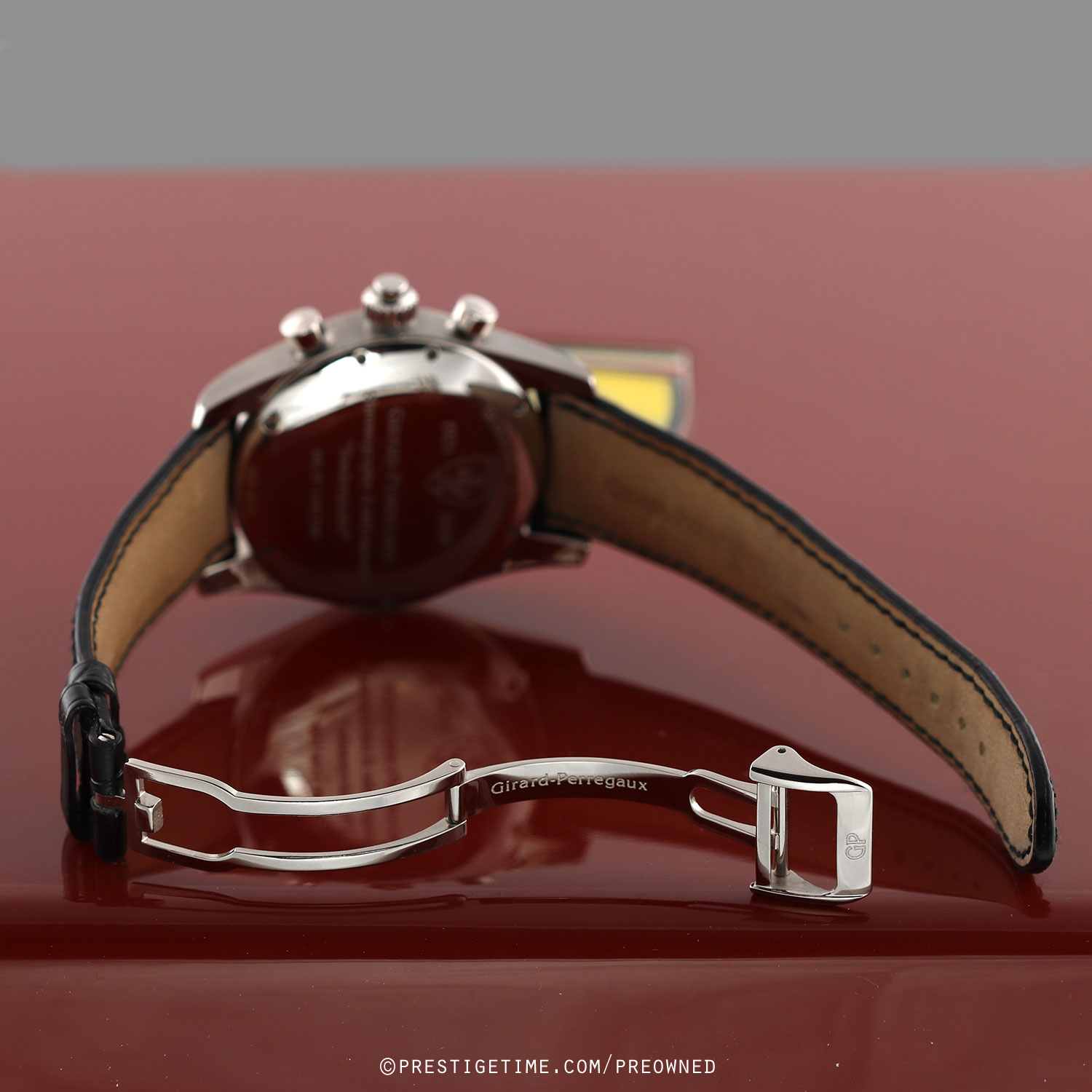 Factory service completed 12/2025, with a factory 1 year service warranty expiring 12/2026.Girard-Perregaux Scuderia Ferrari Chronograph Rattrapante Foudroyante – limited & numbered edition of 150 pieces, commemorating the 70th anniversary of Scuderia Ferrari (1929–1999). The caseback features an engraving of the Scuderia Ferrari prancing horse logo.