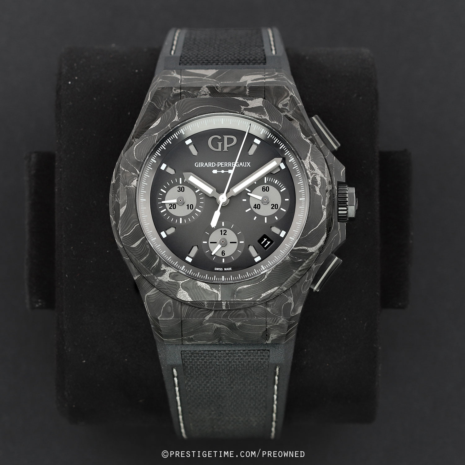The Laureato Absolute 8Tech is crafted from Girard-Perregaux’s proprietary 8Tech material, a carbon-titanium composite formed by layering ultra-thin sheets infused with titanium powder. Once built up, the material is precision-milled, resulting in exceptional strength and a naturally unique, patterned finish