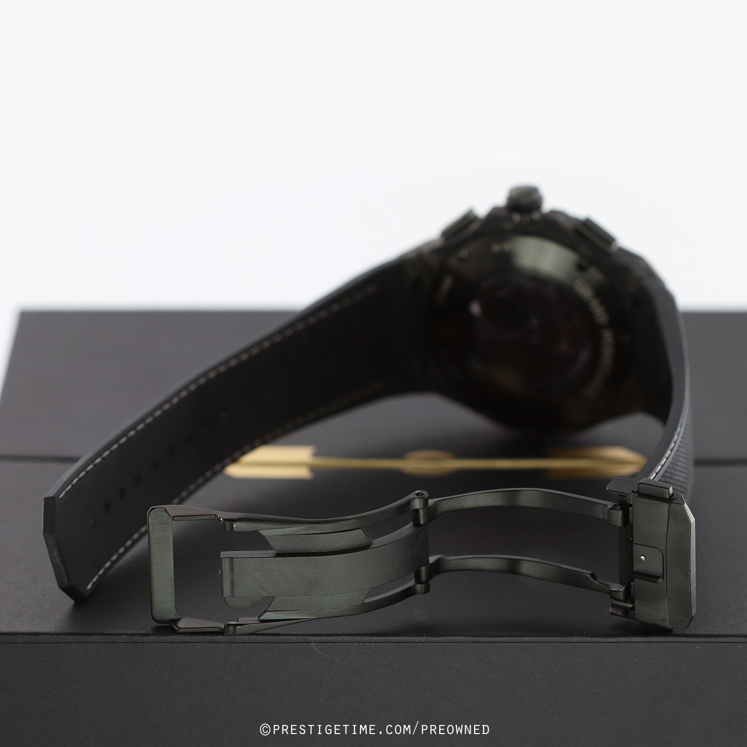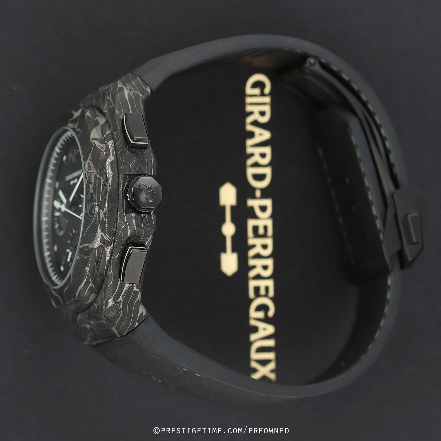 Strap: Fitted on its original GP black rubber strap with contrasting light-grey stitching & a black PVD coated titanium push-button deployant buckle. This strap is in excellent condition with the vast majority of its wear lifespan remaining. We would grade this strap in 98%+ condition.