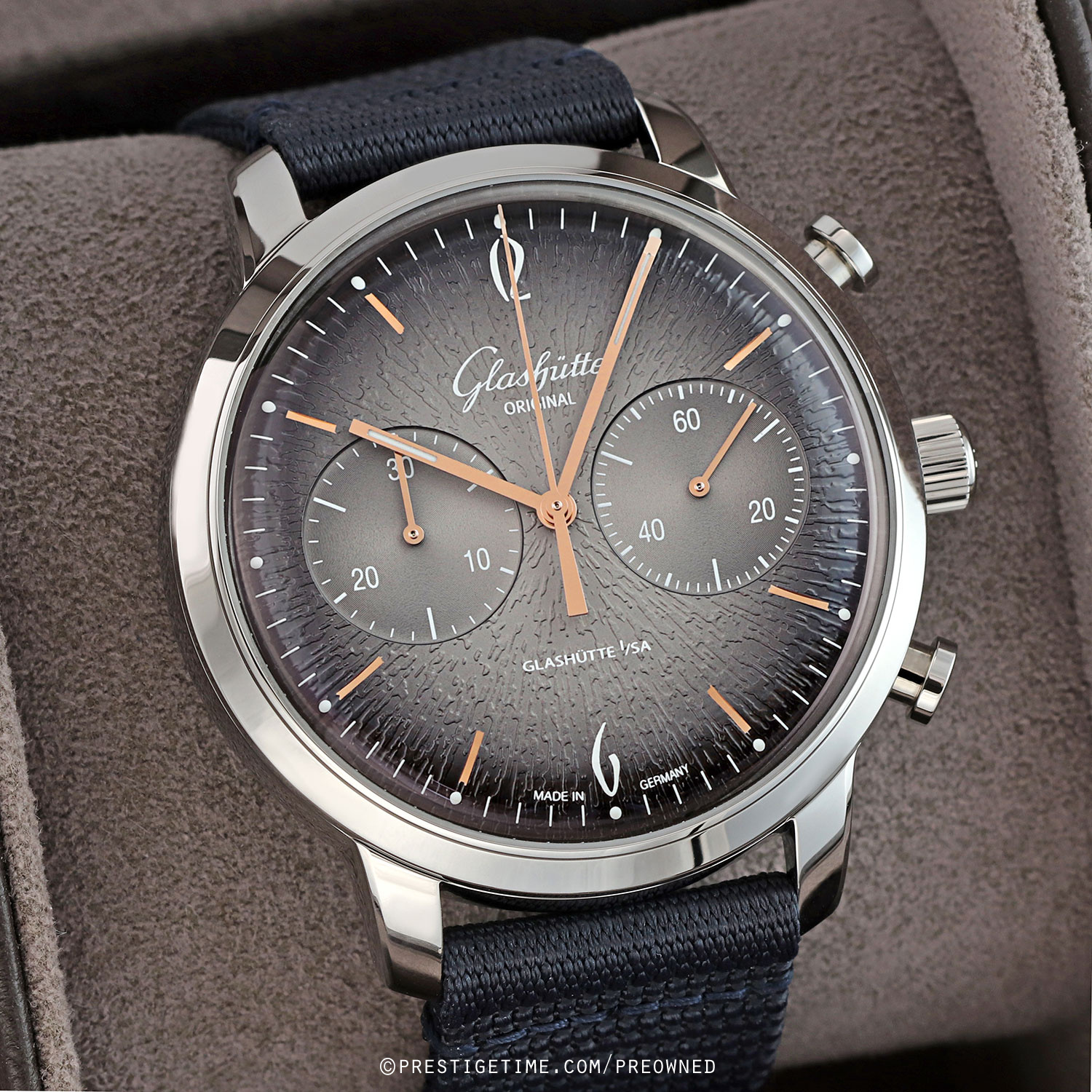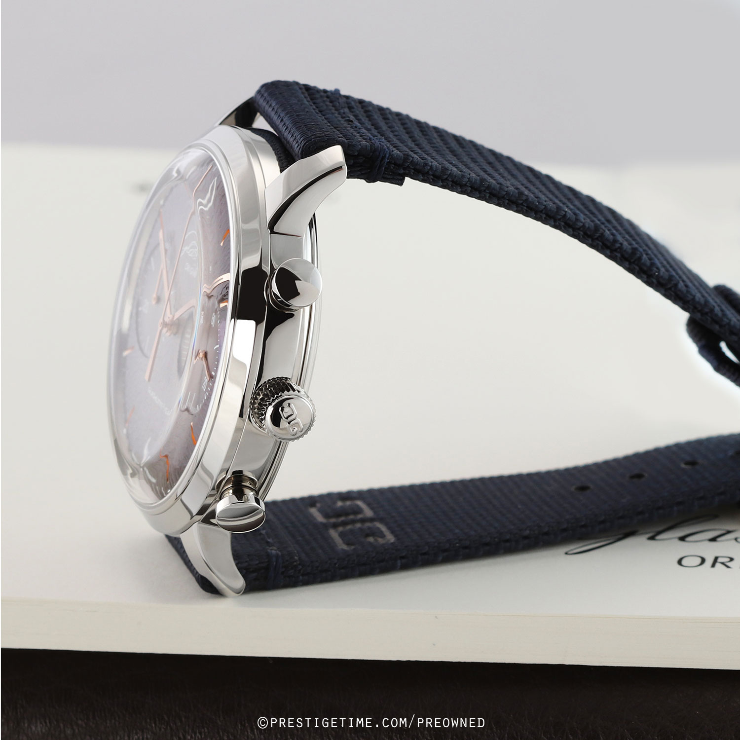 Strap: Fitted on its original Glashutte Original very dark blue fabric strap with a tang buckle. The strap is in excellent near new condition, with the vast majority of its wear-lifespan remaining. We would grade the strap as in 97% condition.