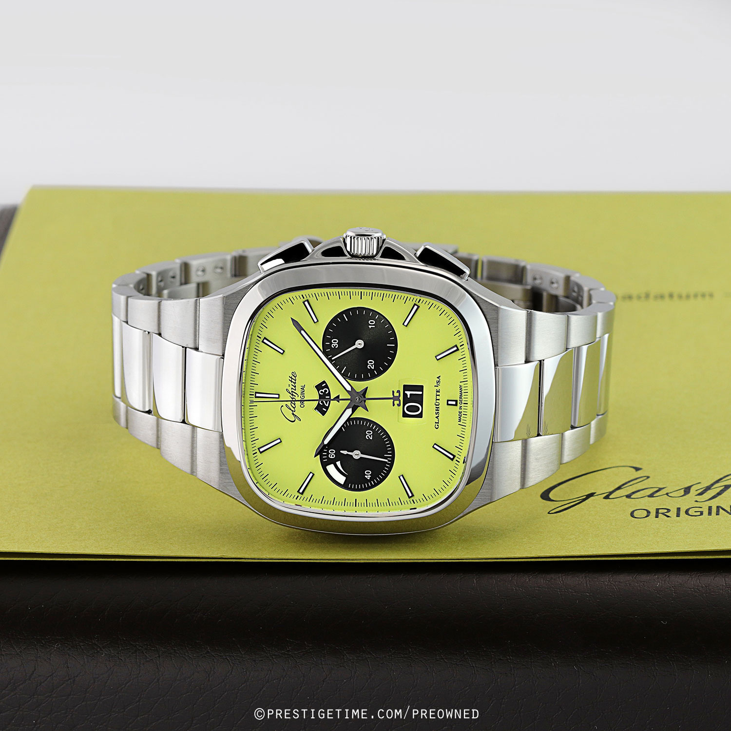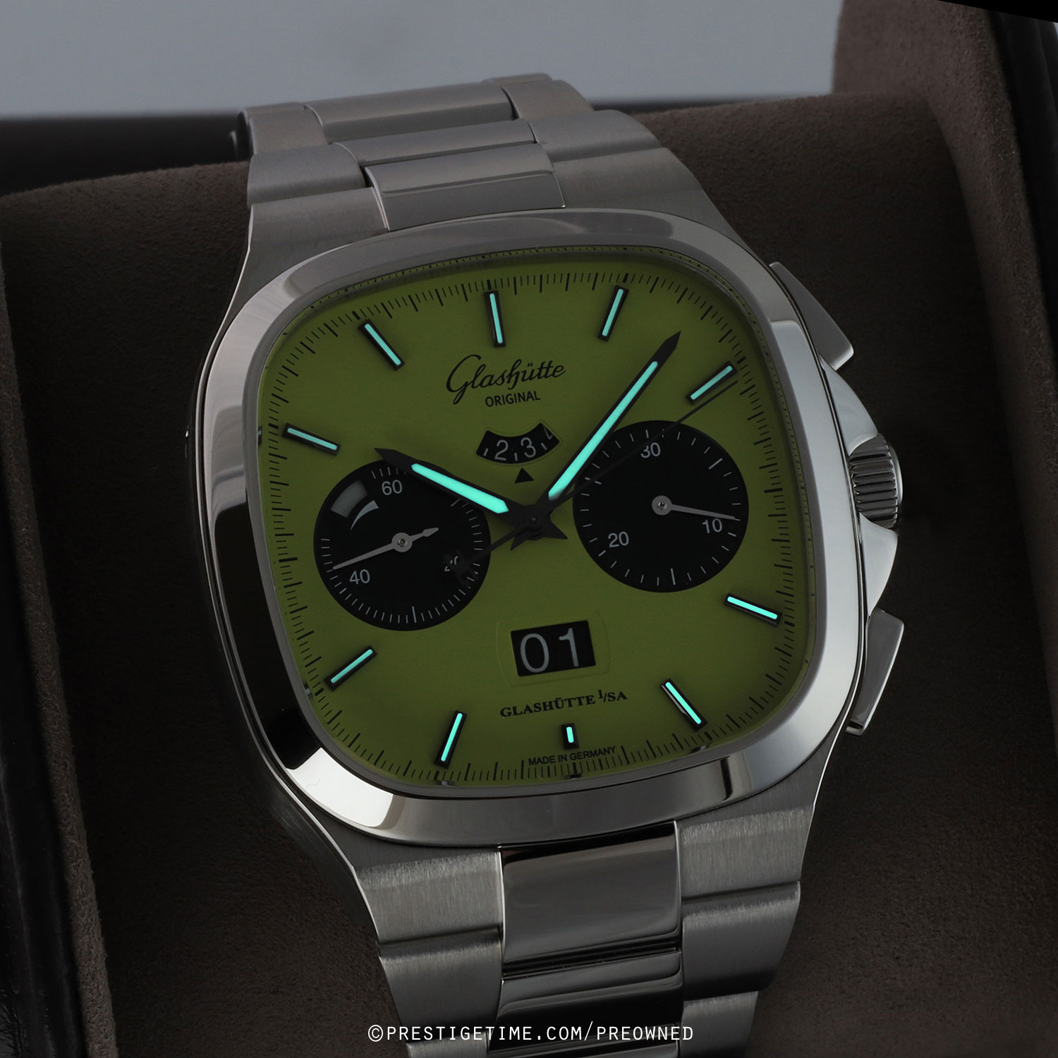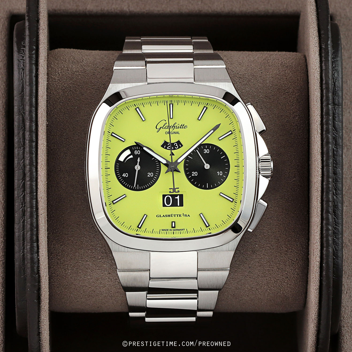 Case: Brushed & polished stainless steel case. Matte lacquered lime green dial. Black sub-dials. Polished hands, the hour & minute hands with luminous fill. Applied polished index hour markers with luminous fill. Luminous dot hour markers. Fine printed minute/seconds & fractions of a seconds track. Panorama date window at 6 o'clock. Small seconds sub-dial at 9 o'clock.
