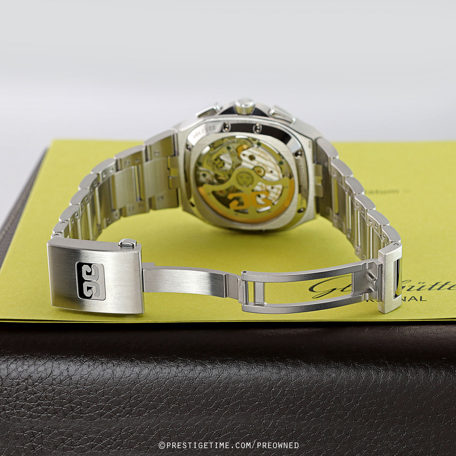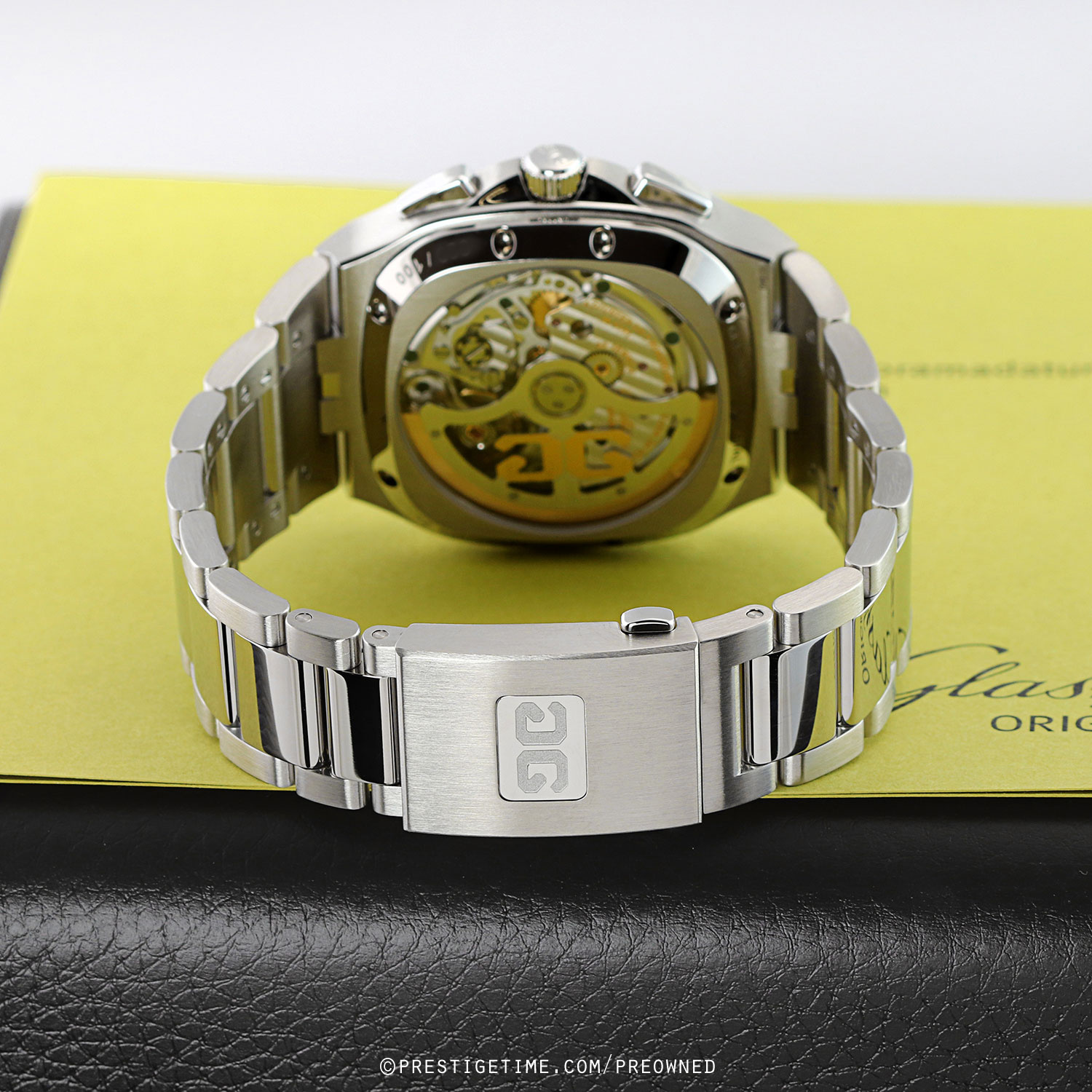 Movement: Powered by an in-house Glashutte Original caliber 37-02, beats at 28,800 vph (4Hz), contains 65 jewels & has an power reserve of +/- 70 hours. The movement is exquisitely finished with beveled & polished corners, blued screws & Glashutte striping. Features a skeletonized rotor with a 21kt gold peripheral oscillation weight.