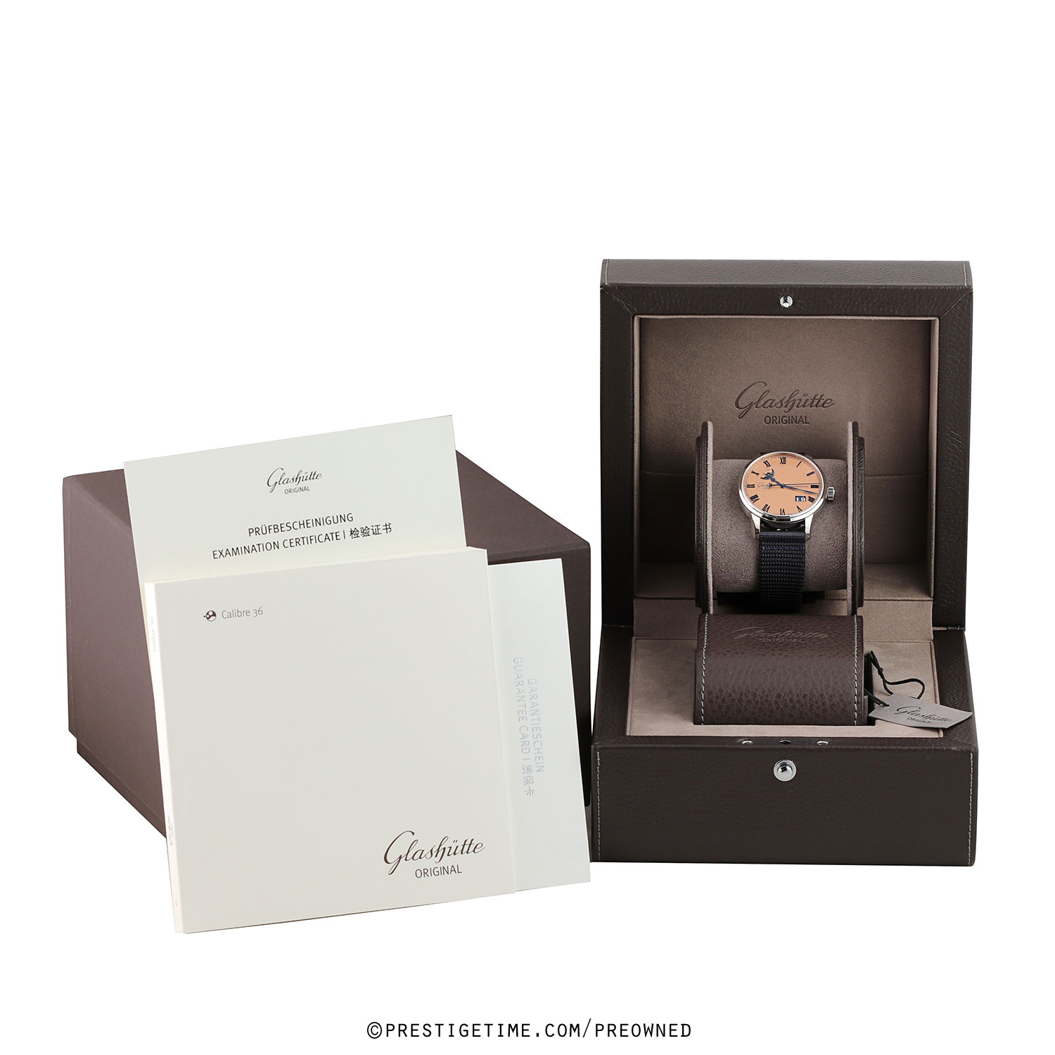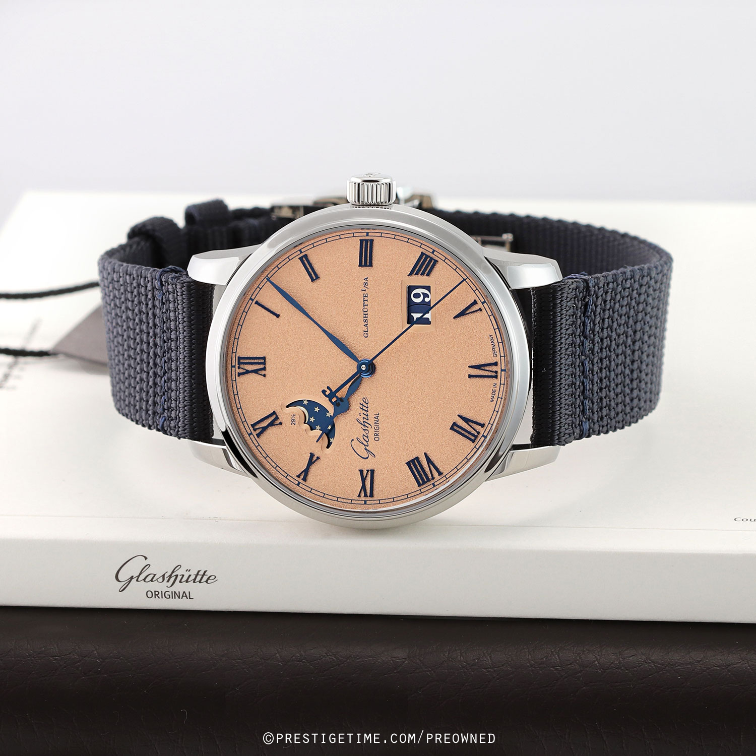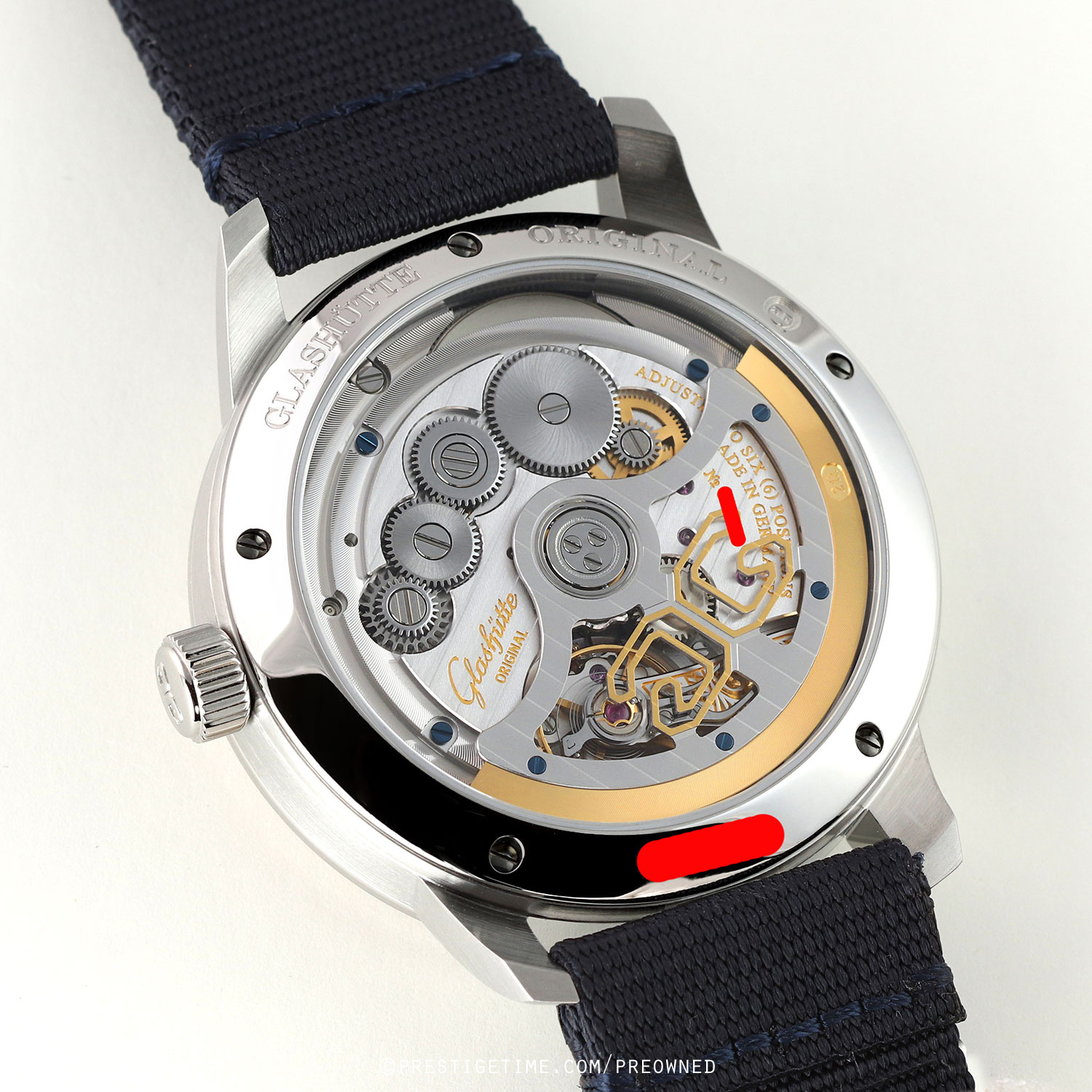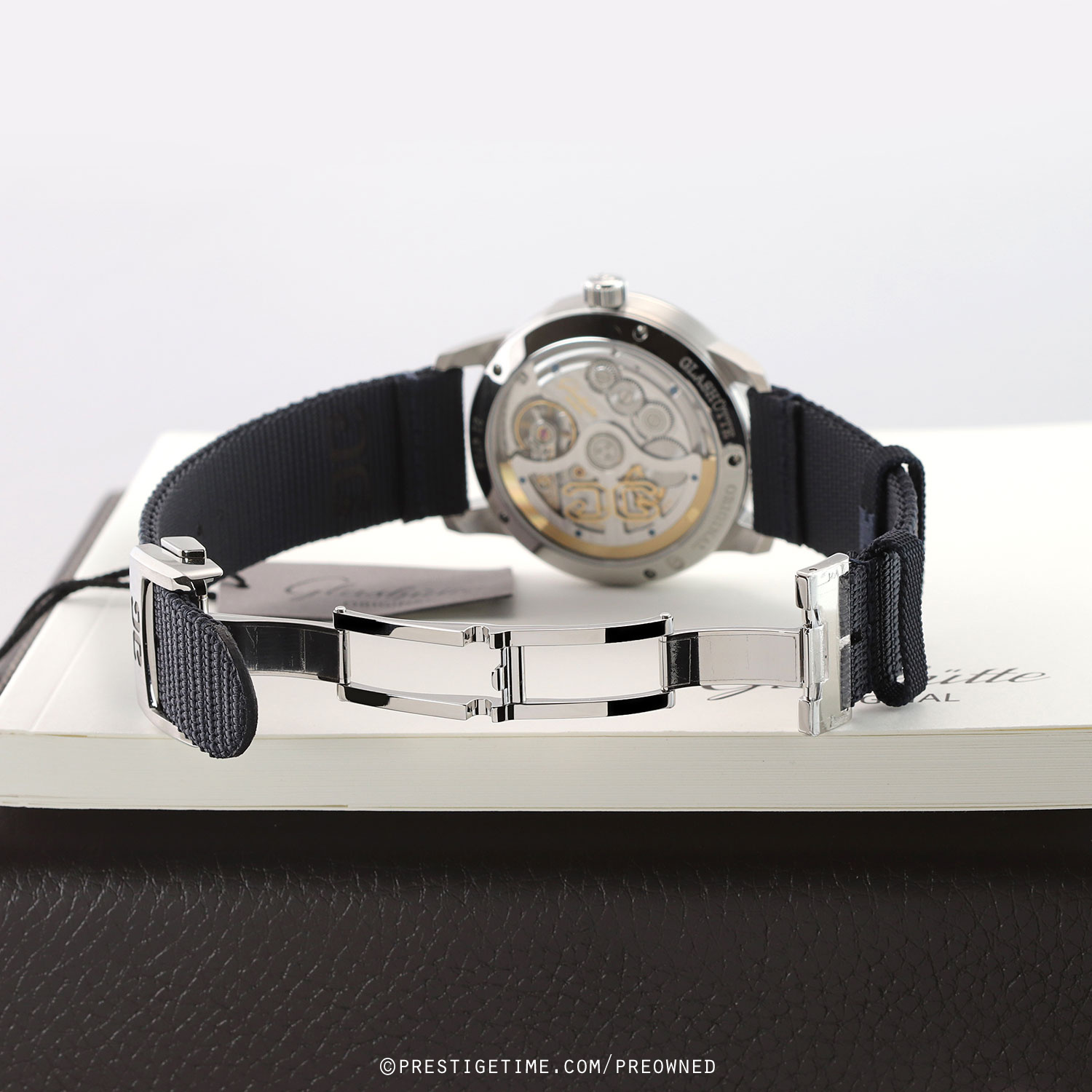 Strap: Fitted on its original Glashutte Original navy-blue fabric strap with a stainless steel deployant buckle. The strap is unworn, in new condition with its full wear lifespan remaining.