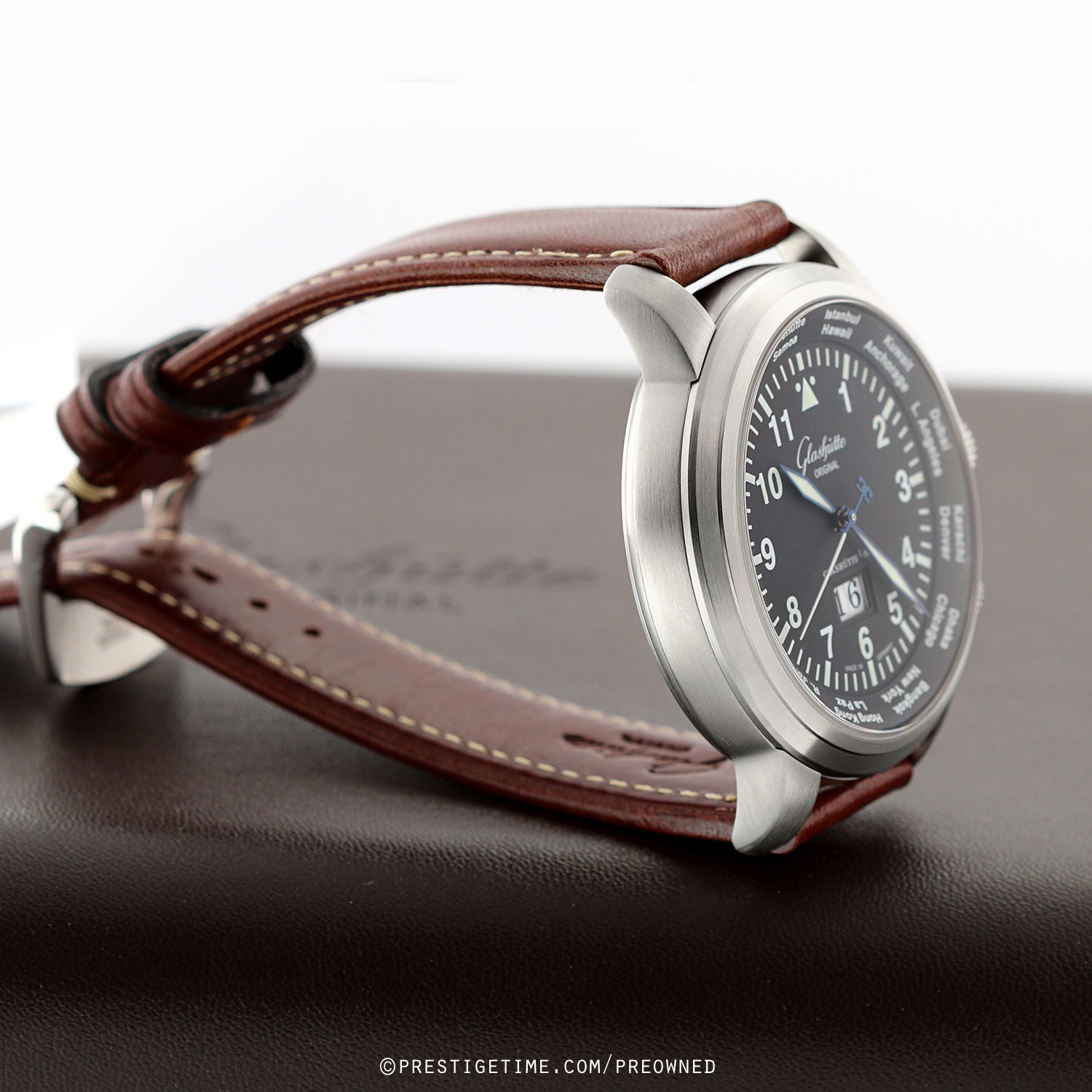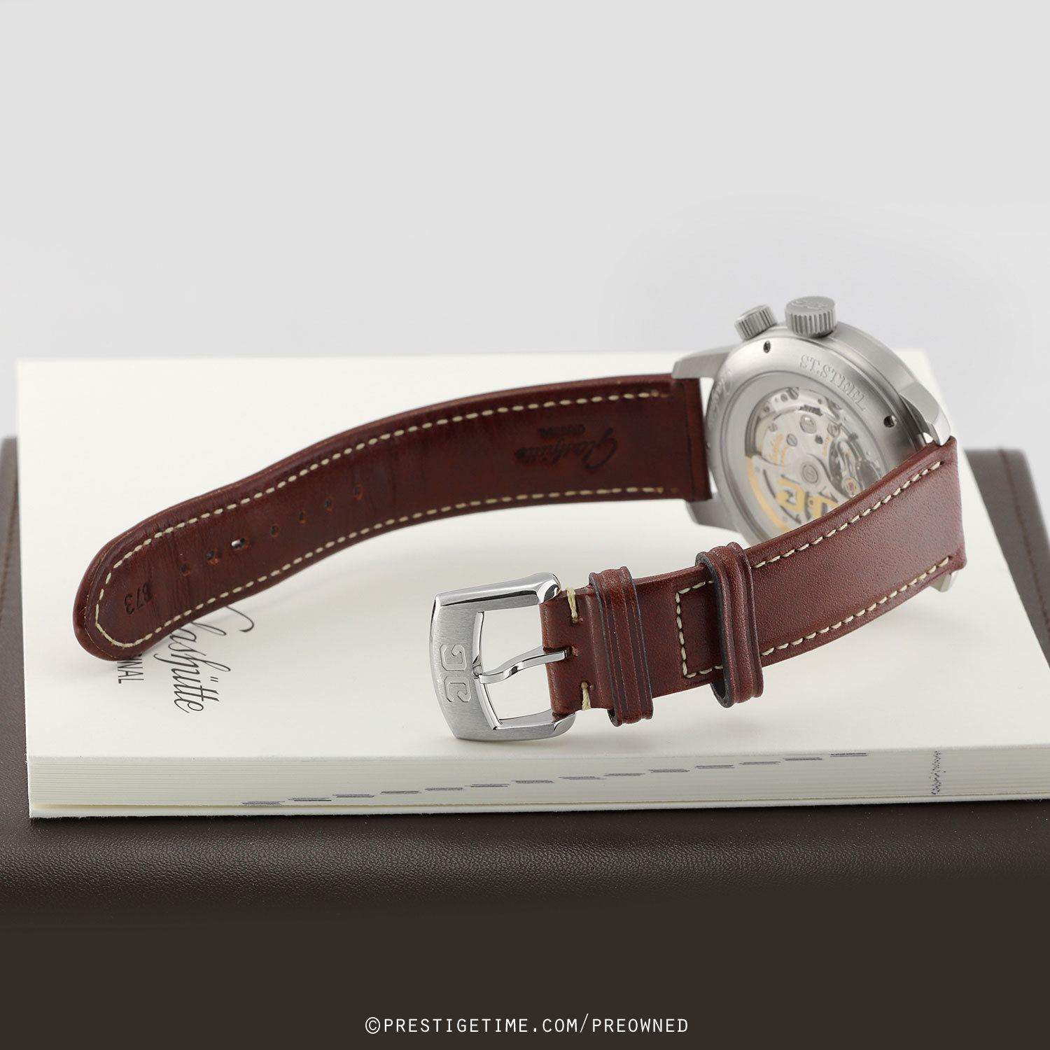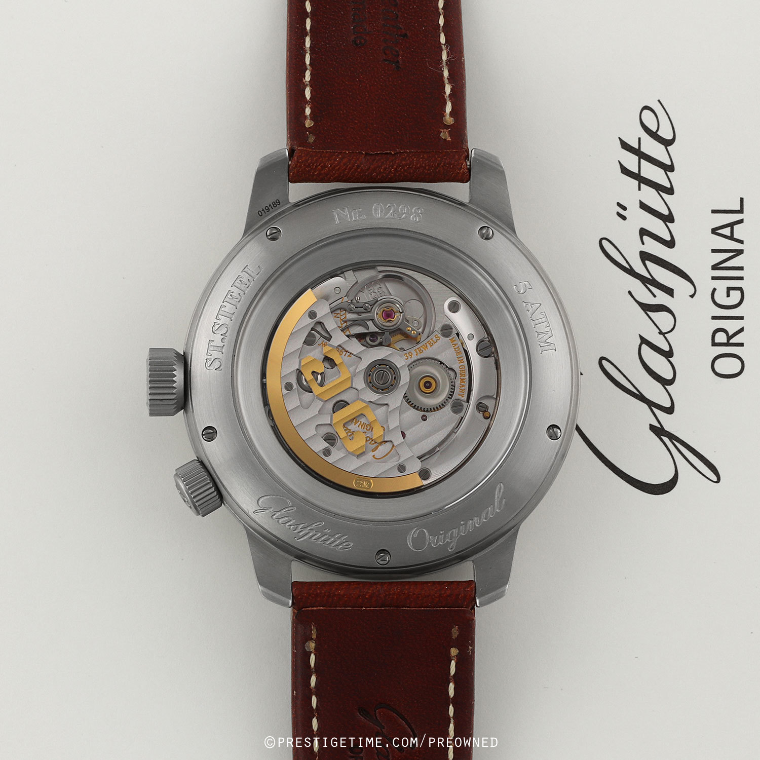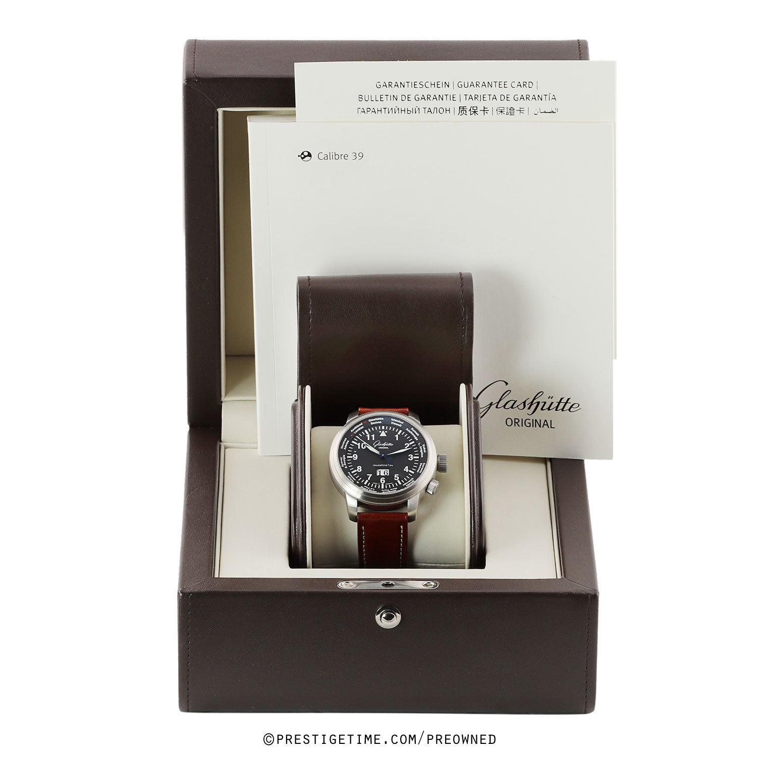 Movement: Powered by a Glashutte Original in-house caliber 39-47, beats at 28,800 vph (4Hz), contains 39 jewels & has a power reserve of 40 hours. The three-quarter plate is decorated with a Glashütte stripe finish. The rotor is skeletonized with the brands dual GG logo, features a Glashütte stripe finish and a 21-ct gold oscillation weight