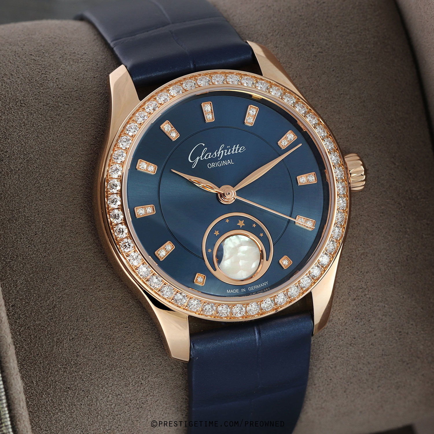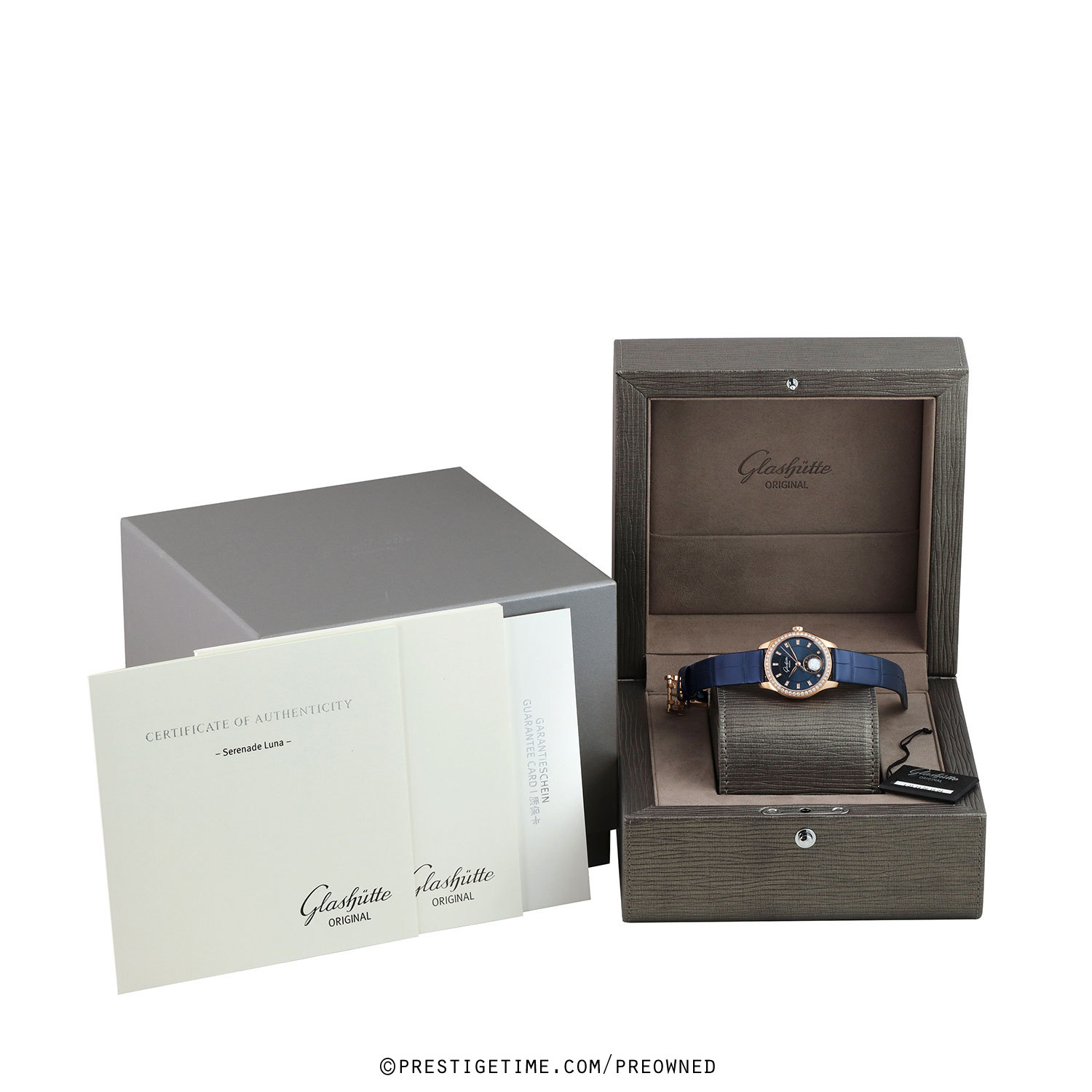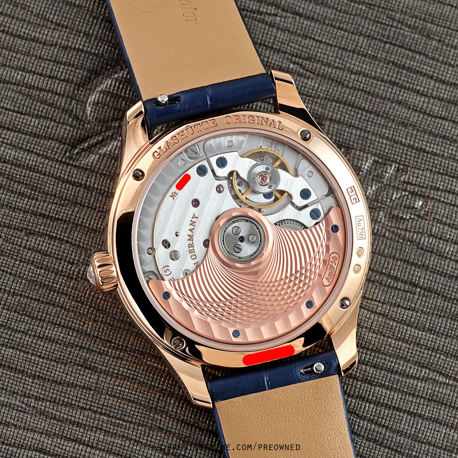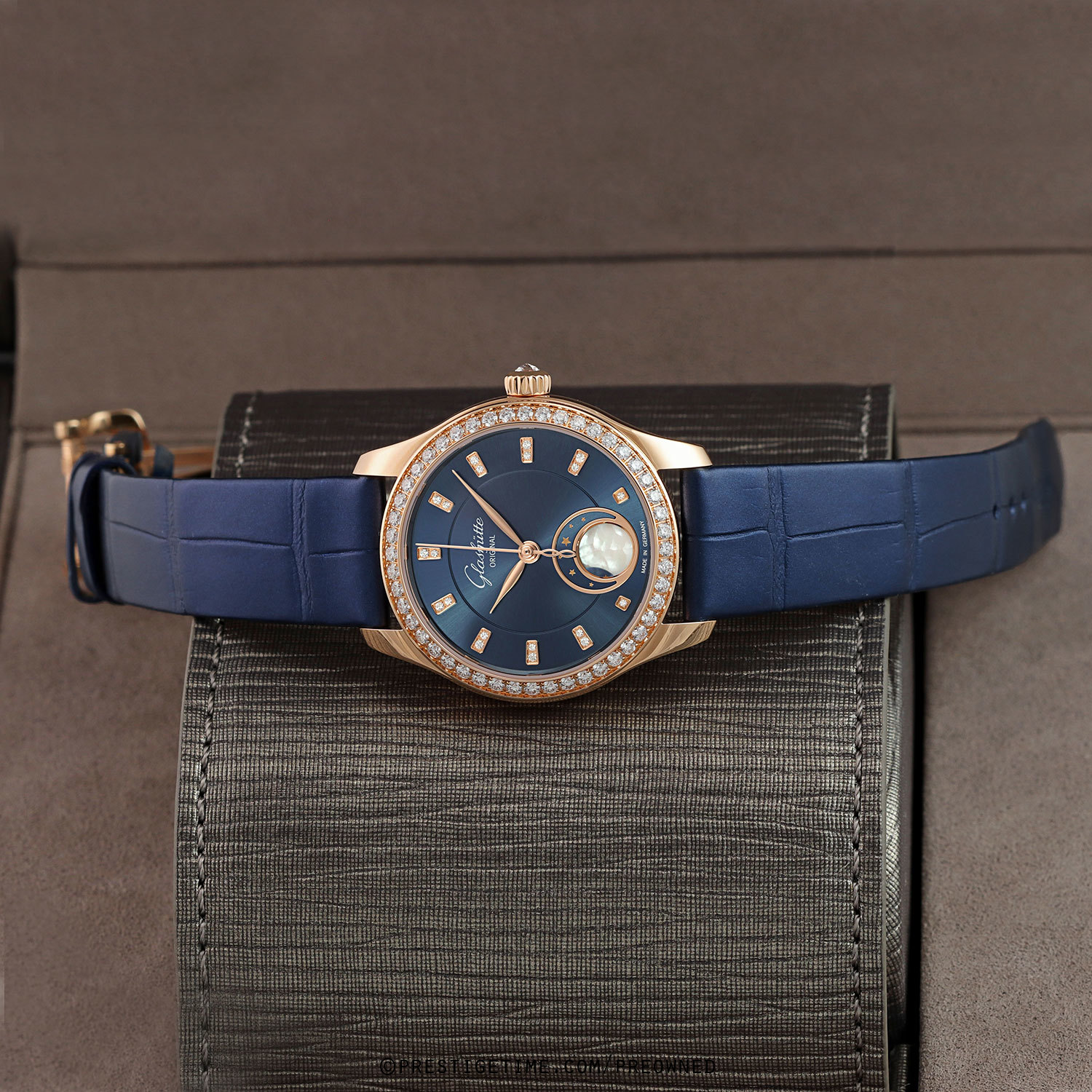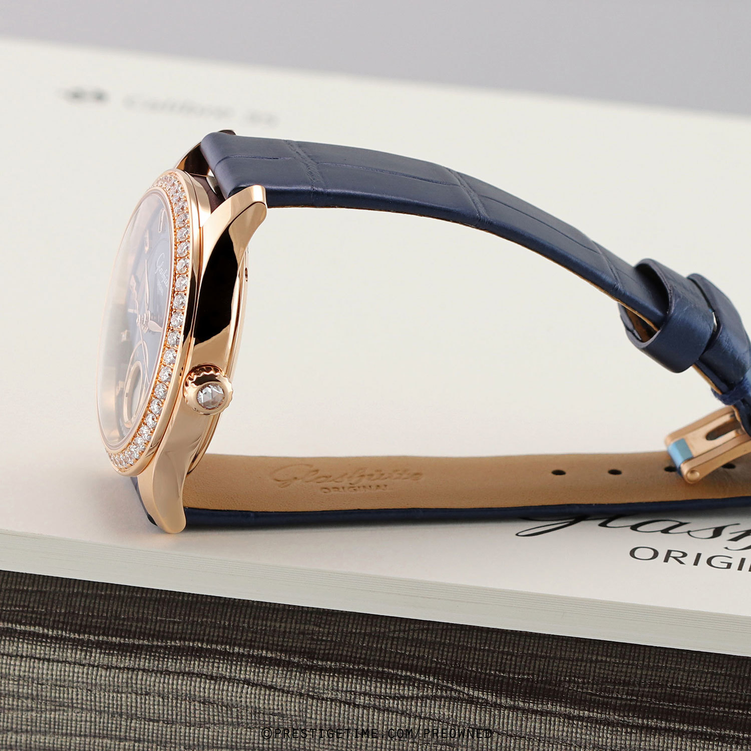 Strap: Fitted on its original Glashutte Original blue alligator leather strap with a polished solid 18kt rose gold push-button deployant buckle. The strap is unworn in new condition with its full wear lifespan remaining.