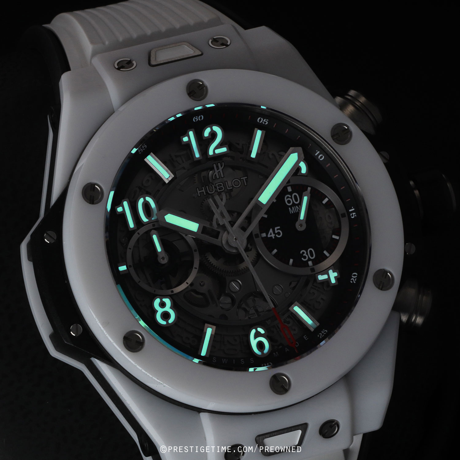 Case: Microblasted white ceramic case & bezel with polished beveled corners. Bezel secured by 6 H-head titanium screws. Black resin lower-bezel ring & lateral case inserts. Sapphire crystal dial showcasing the movement. Brushed hands with luminous fill. Applied hour markers with luminous fill. Black dial flange with minute/seconds track. Skeletonized date wheel, the current date highlighted at 3 o'clock. Small seconds sub-dial at 9 o'clock.