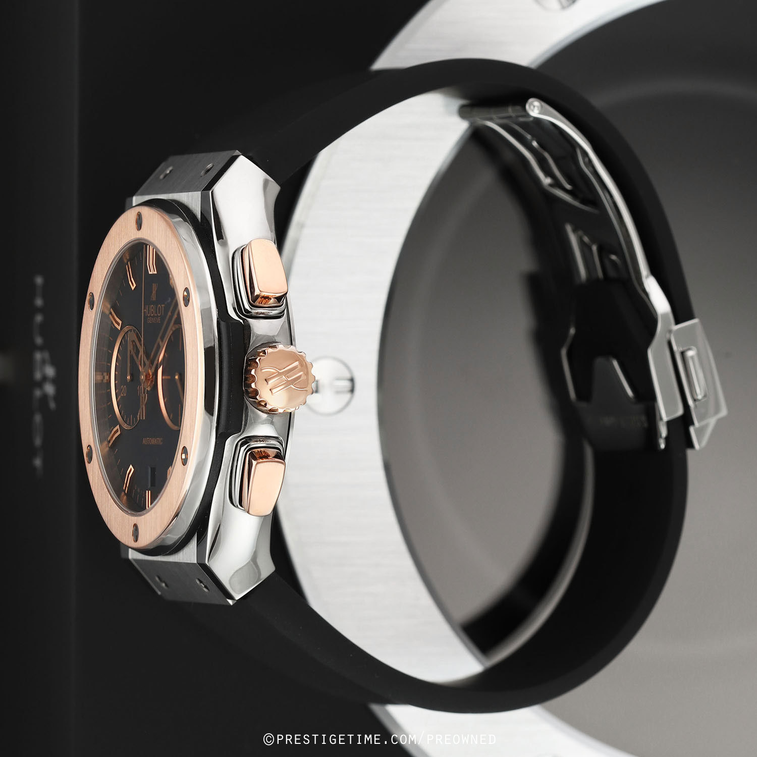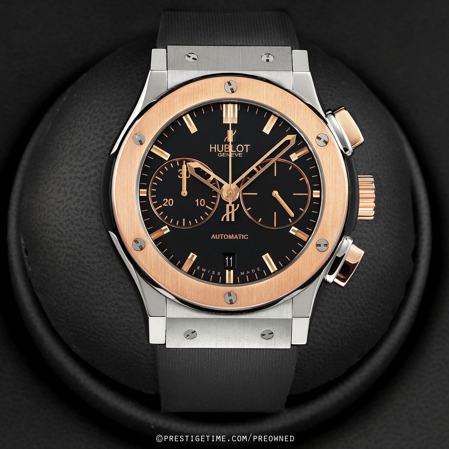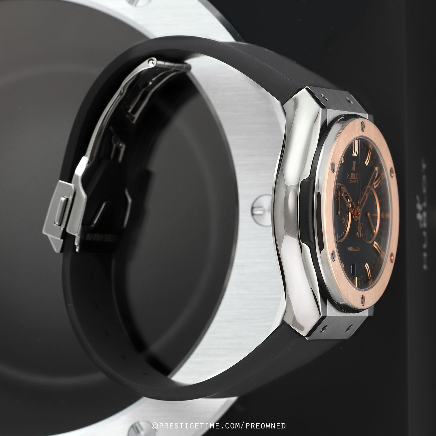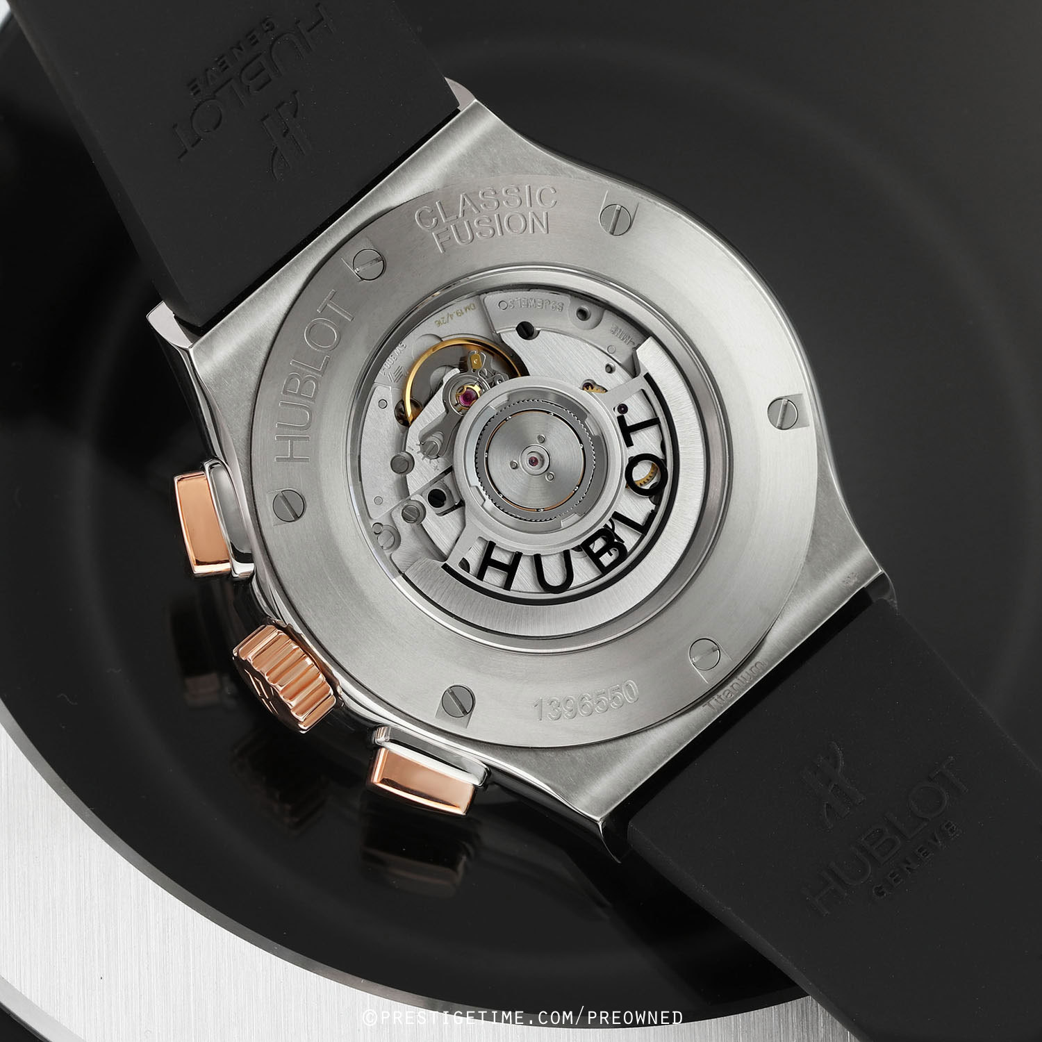Movement: Powered by a Hublot caliber HUB1143 (base SW300-1 with Dubois-Depraz chrono module), beats at 28,800 vph (4Hz), contains 59 jewels & a power reserve of +/- 42 hours