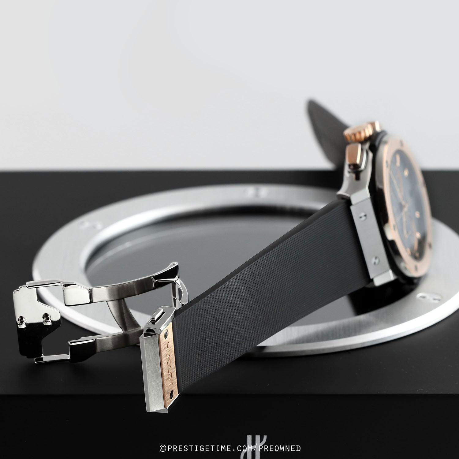 Strap: Fitted on its original Hublot black rubber with a push-button black ceramic & black DLC coated stainless steel deployant buckle. The strap is brand new, crisp & unworn with its full wear lifespan remaining.