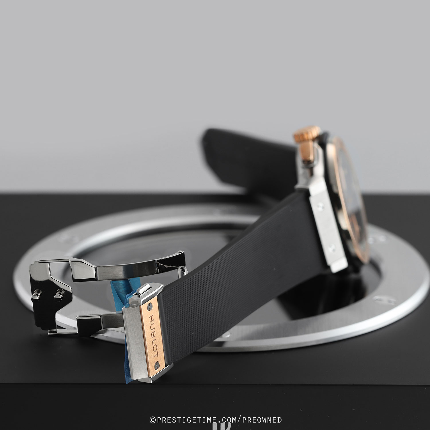 Strap: Fitted on its original Hublot black rubber with a push-button black ceramic & black DLC coated stainless steel deployant buckle. The strap is brand new, crisp & unworn with its full wear lifespan remaining.