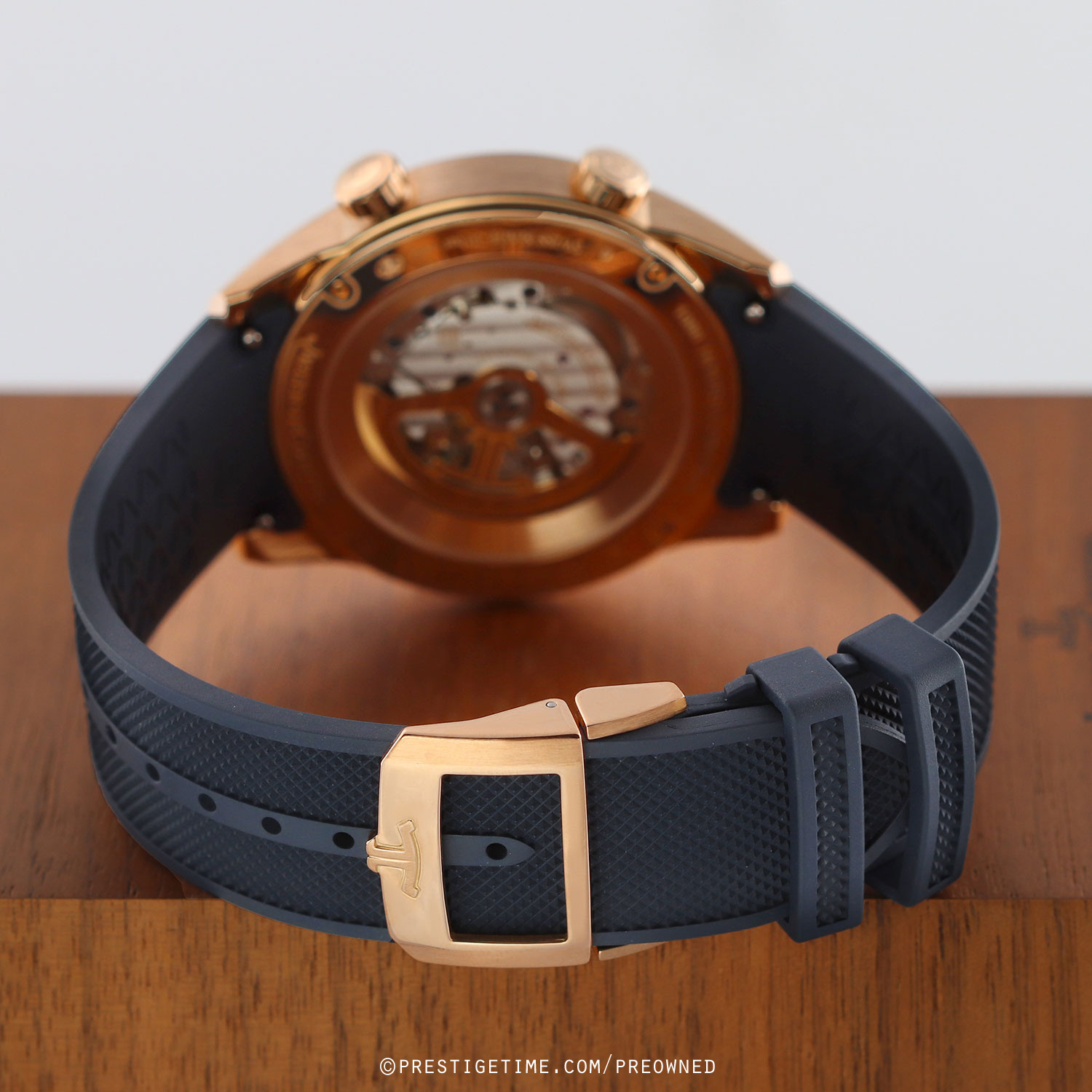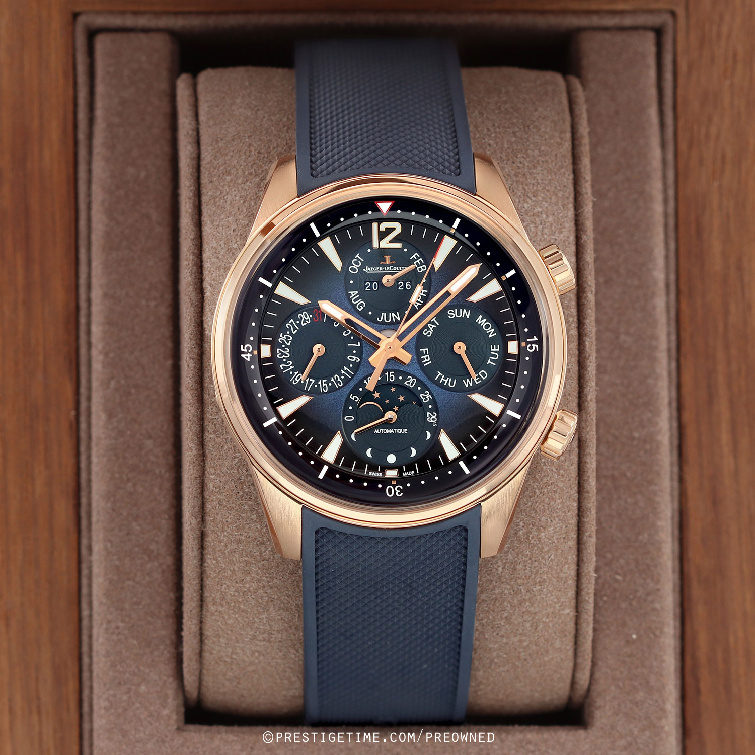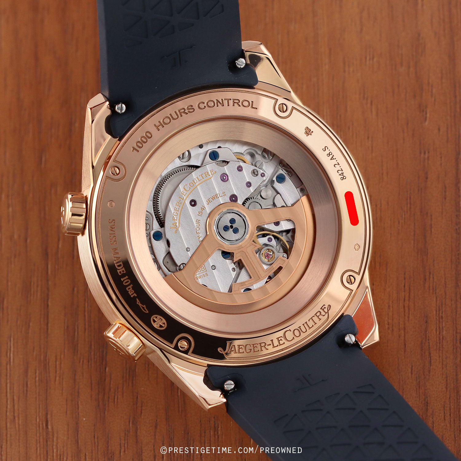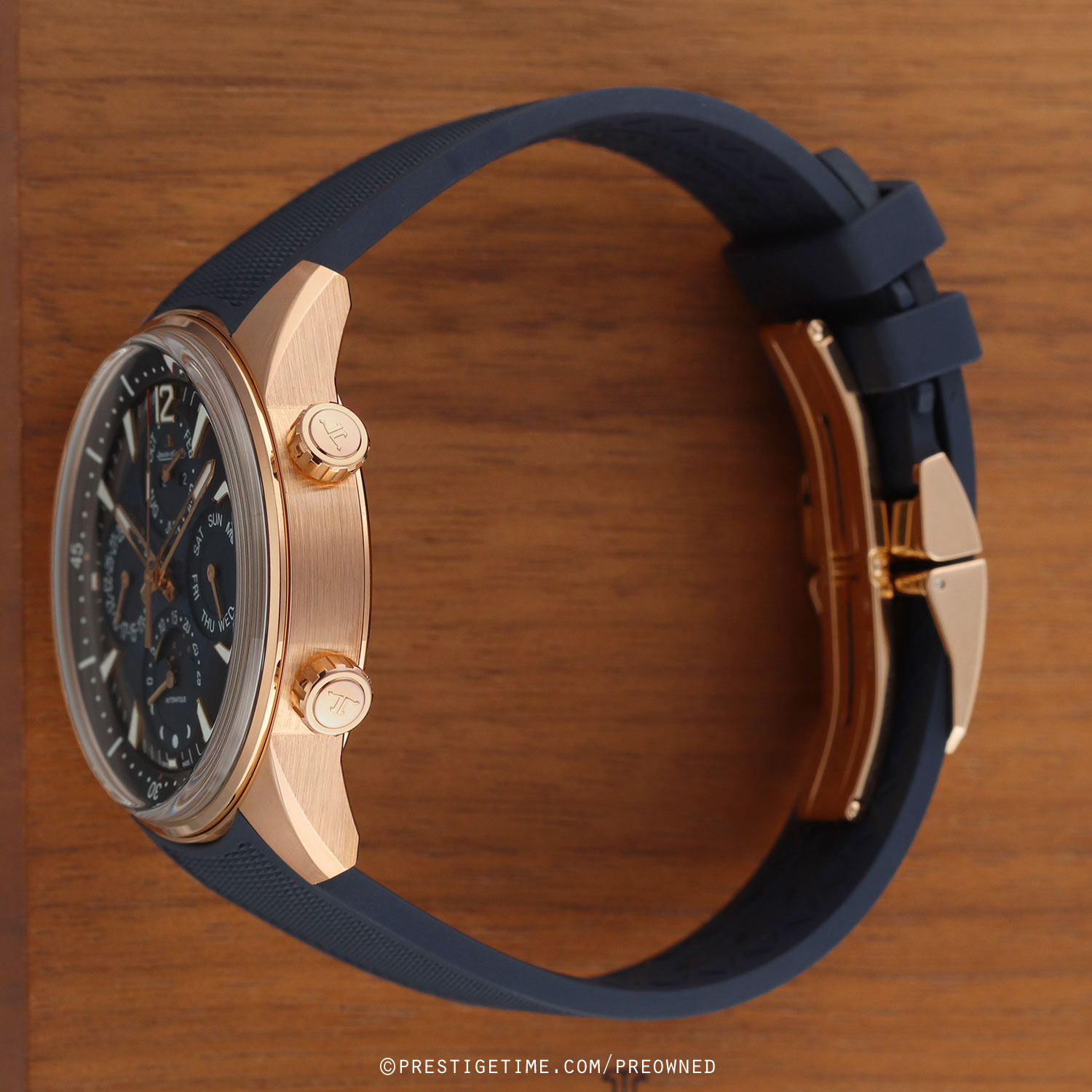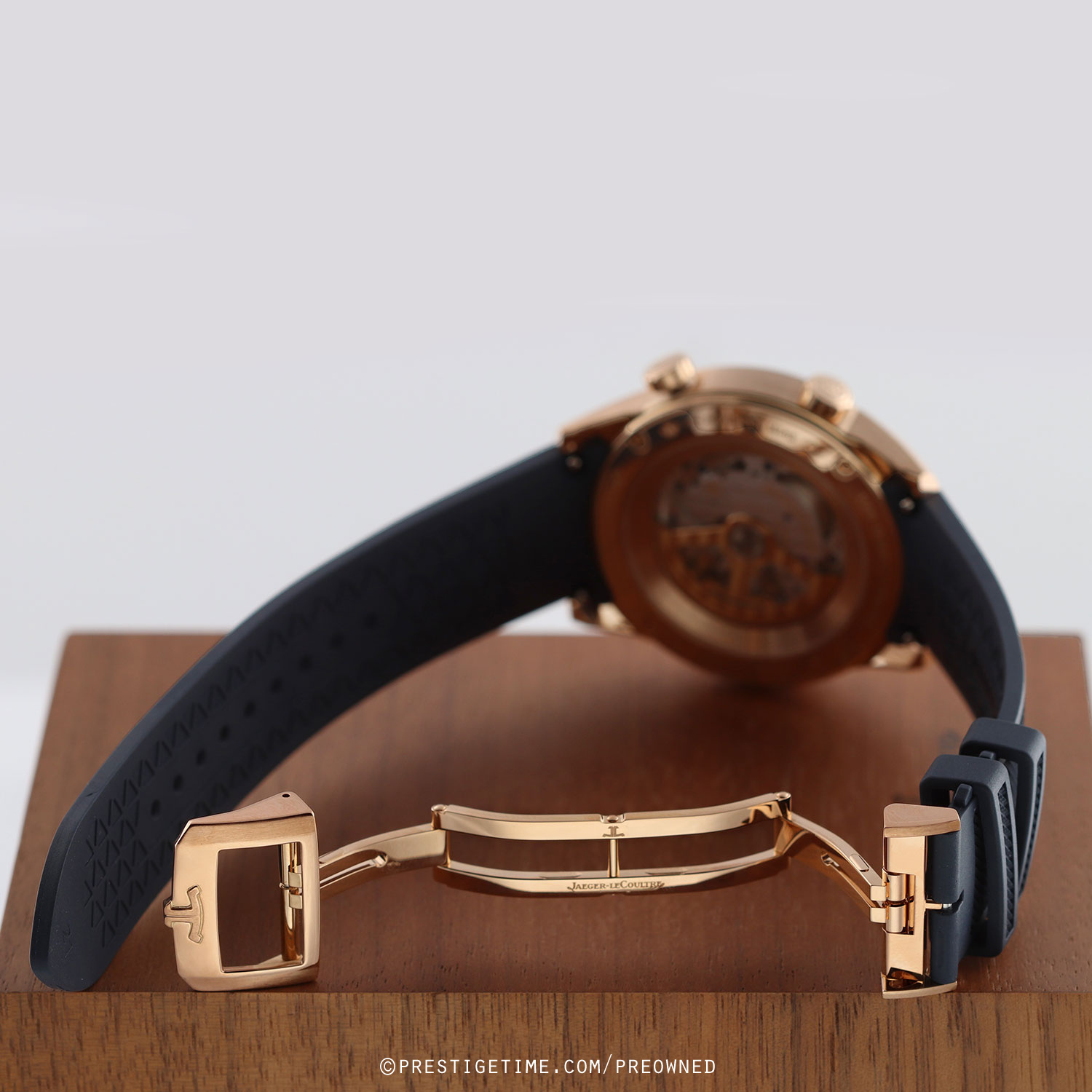 - Fitted on its JLC original blue rubber strap with a solid 18kt rose gold push-button deployant buckle. The strap is excellent near-new condition with the vast majority of its wear lifespan remaining. We would rate this strap in 97% overall condition.