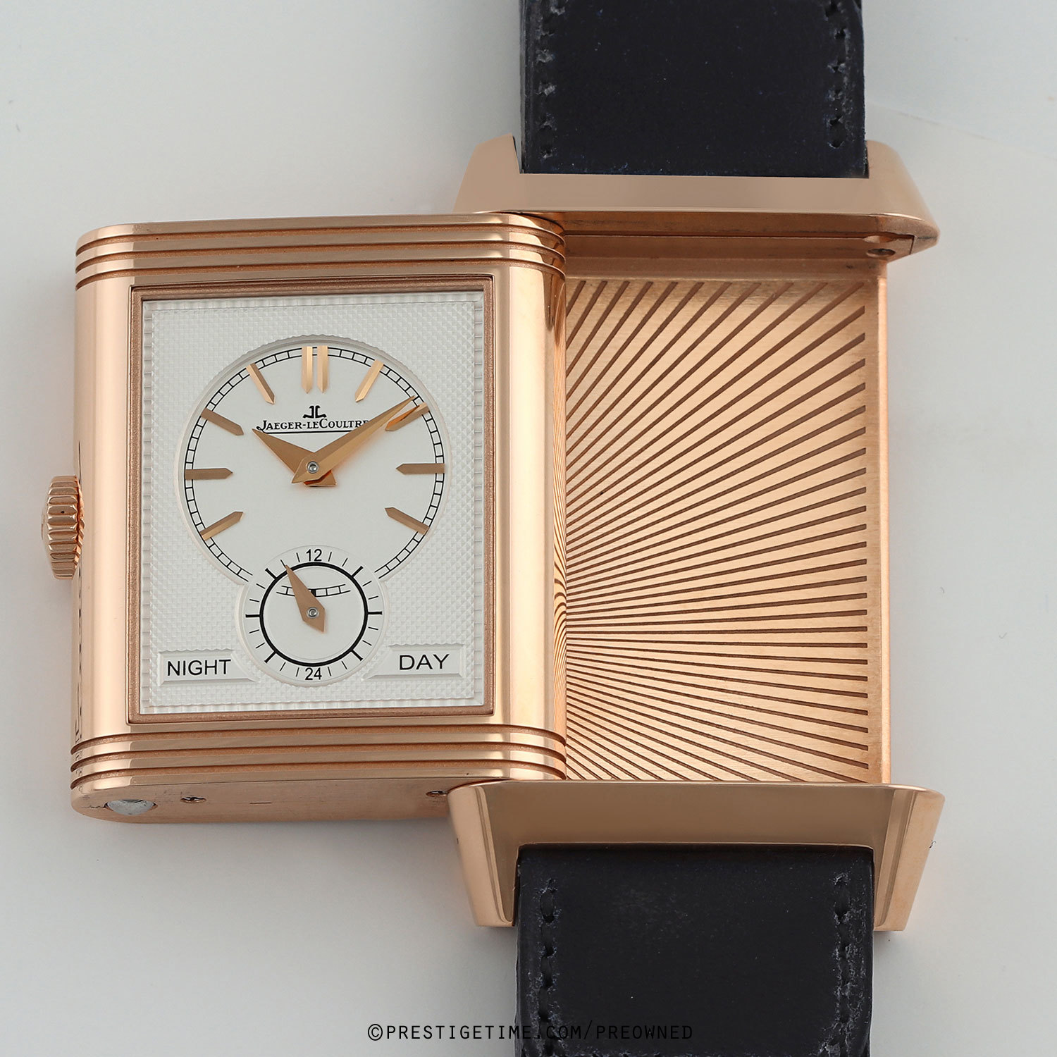 Polished 18kt rose gold case. Featuring a reversible case with 2 separate dials capable of keeping keeping dual time zones: