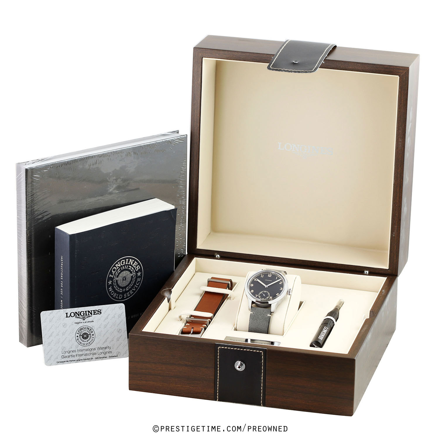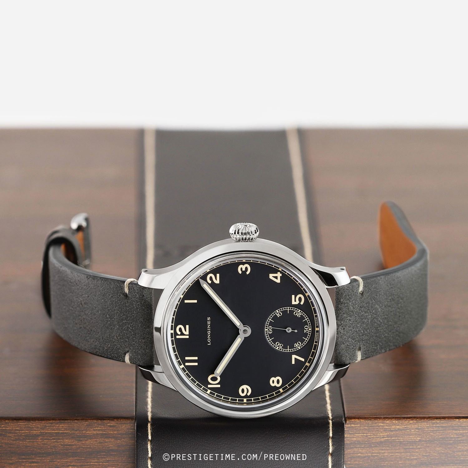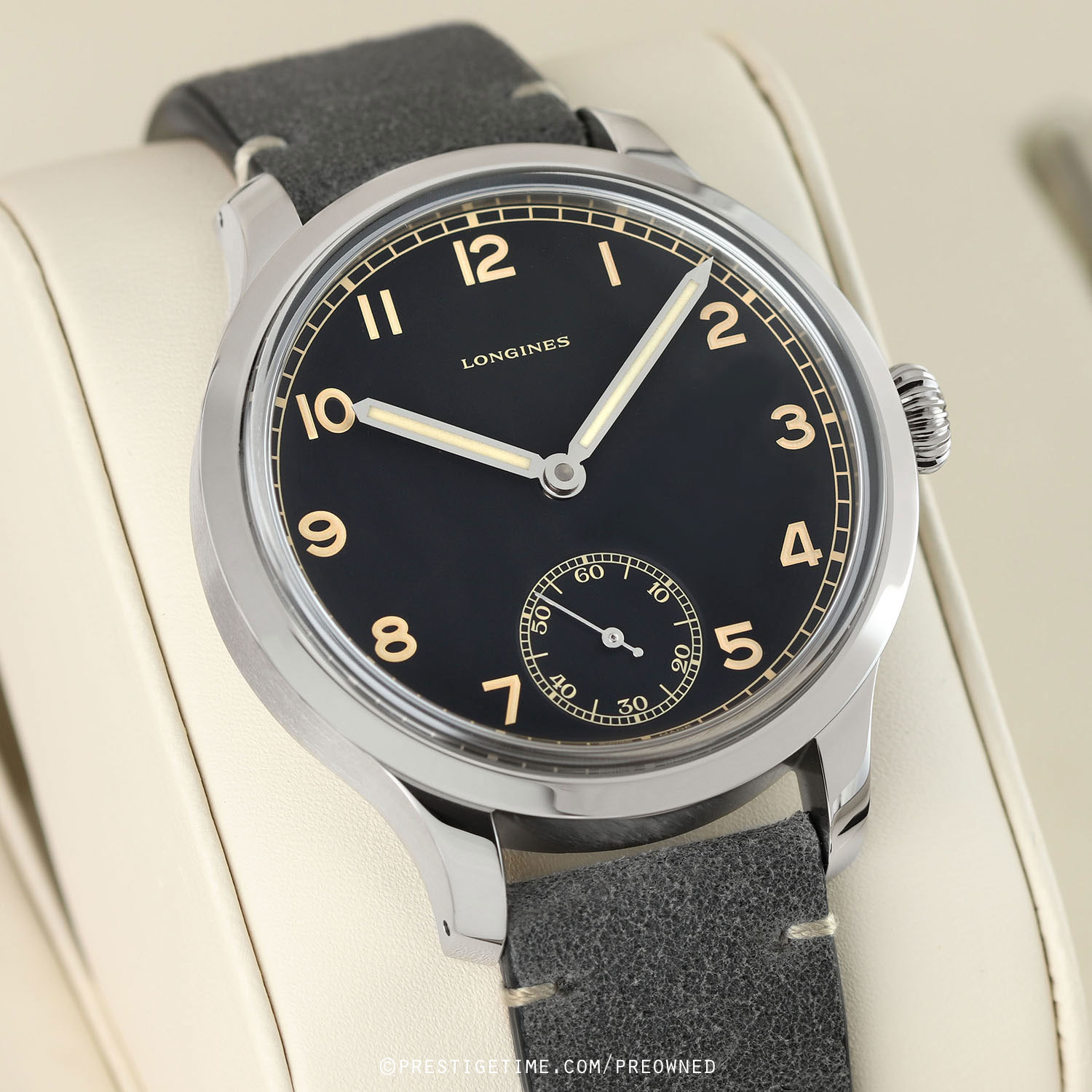 Movement: Powered by a Longines manual winding caliber L507 (base ETA 6498), beats at 18,000 vph (2.5 Hz), contains 17 jewels & has a power reserve of +/- 46 hours.