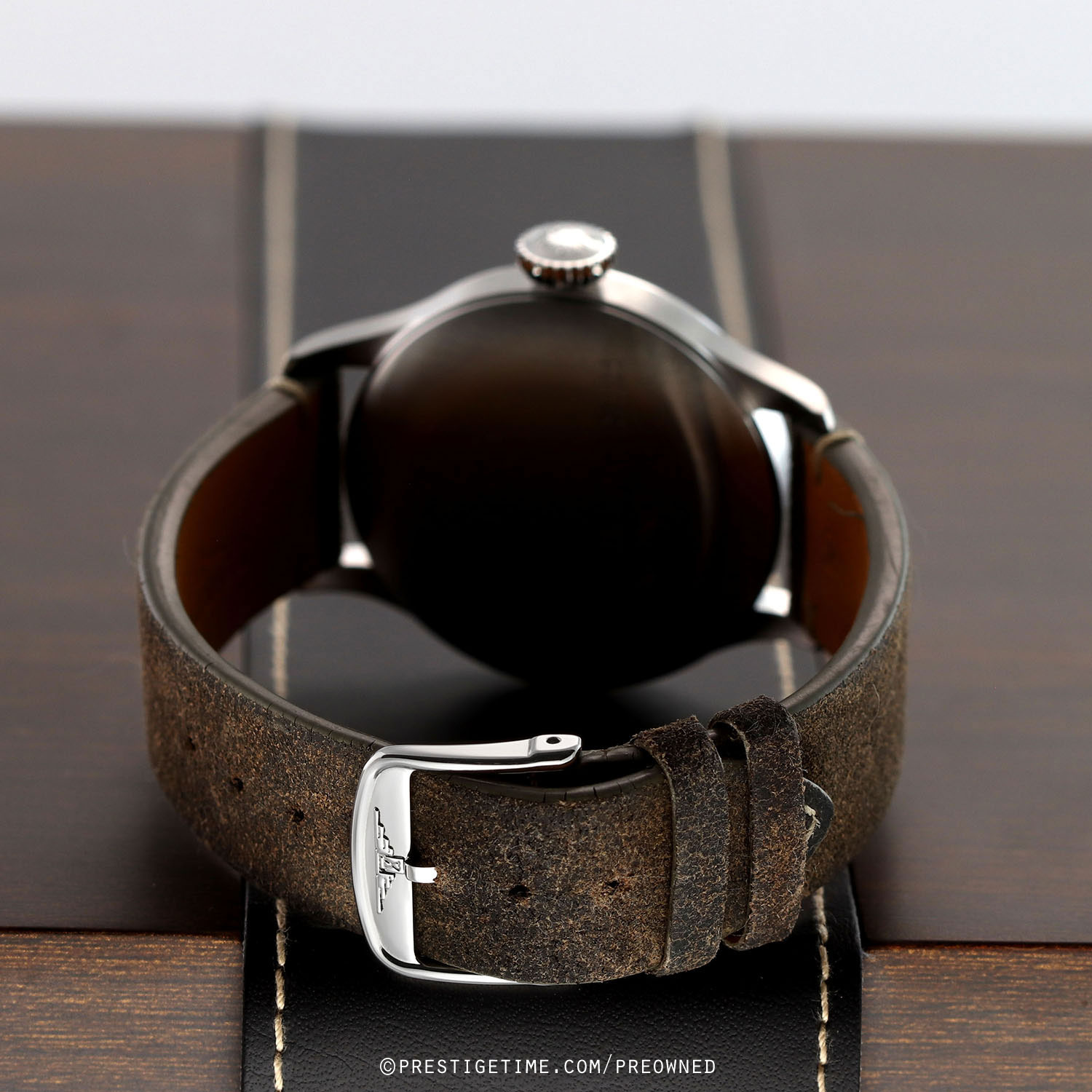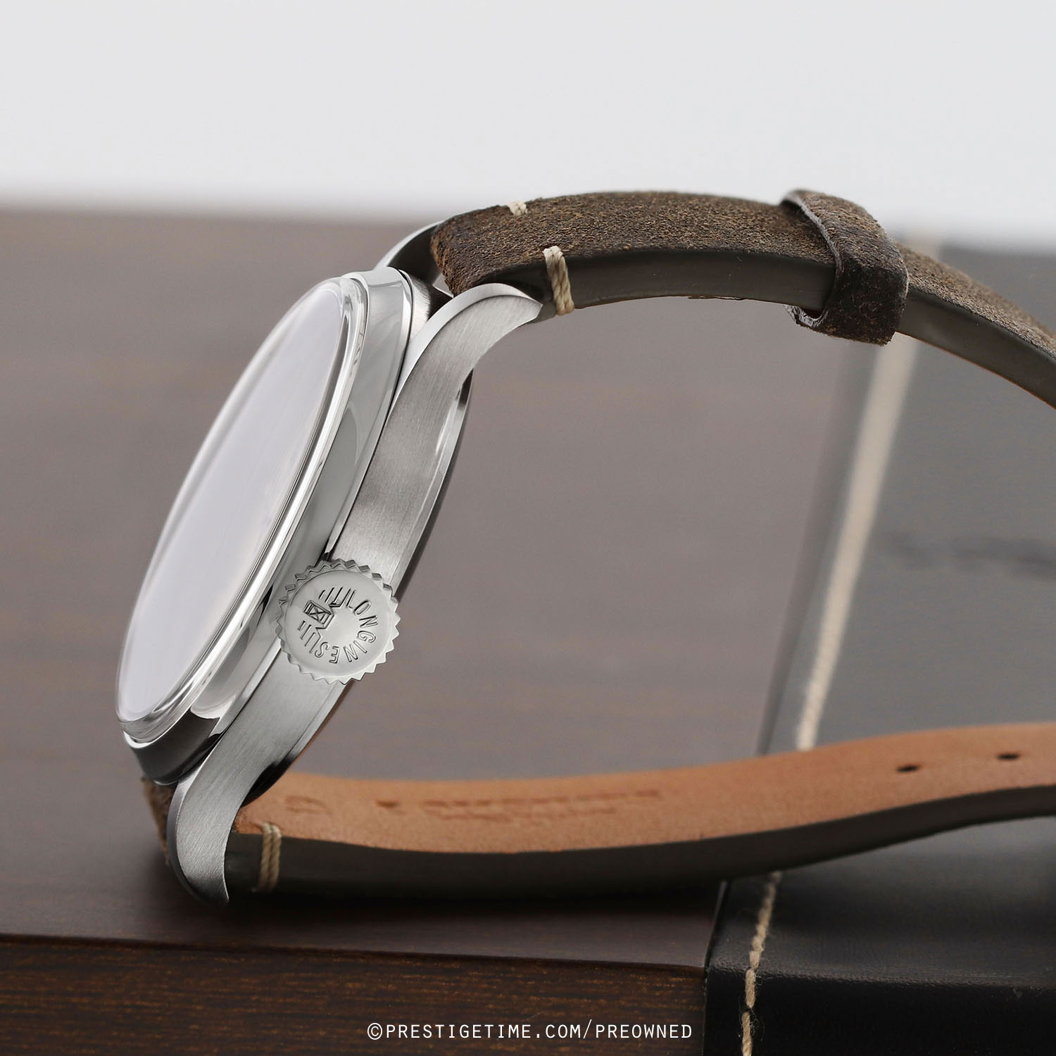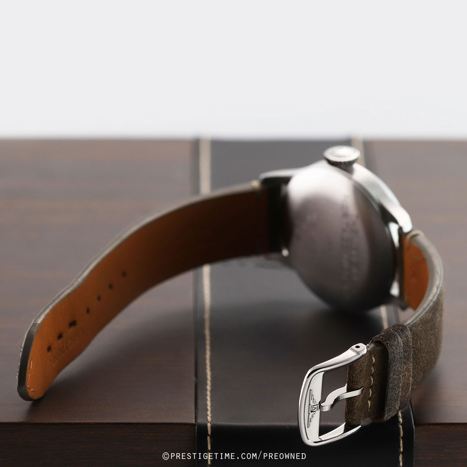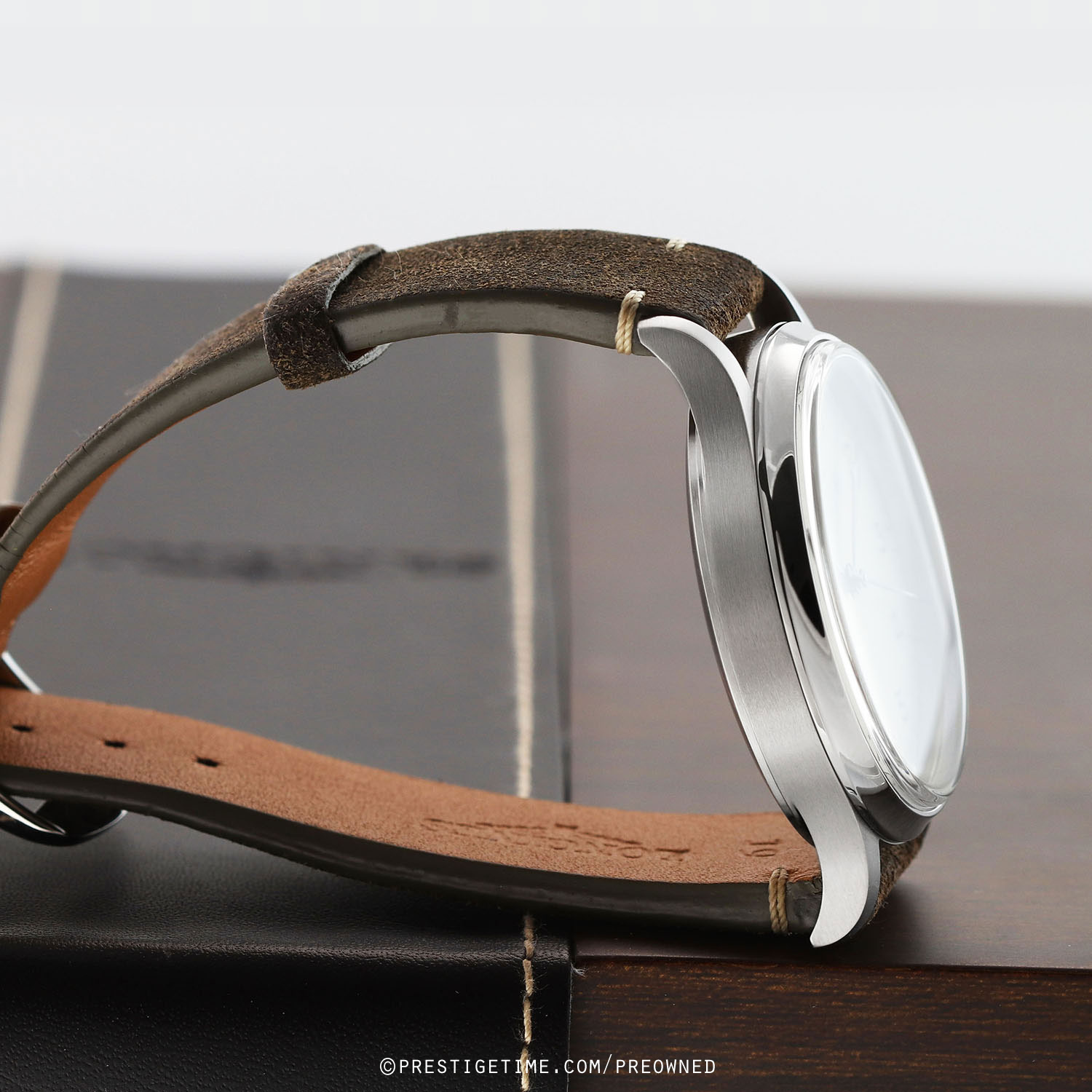 - Fitted on its original tan/brown raw-hide calfskin leather strap with a polished stainless steel tang buckle. This strap is in excellent, near-new condition with the majority of its wear lifespan remaining. We would rate the strap in 96% condition.