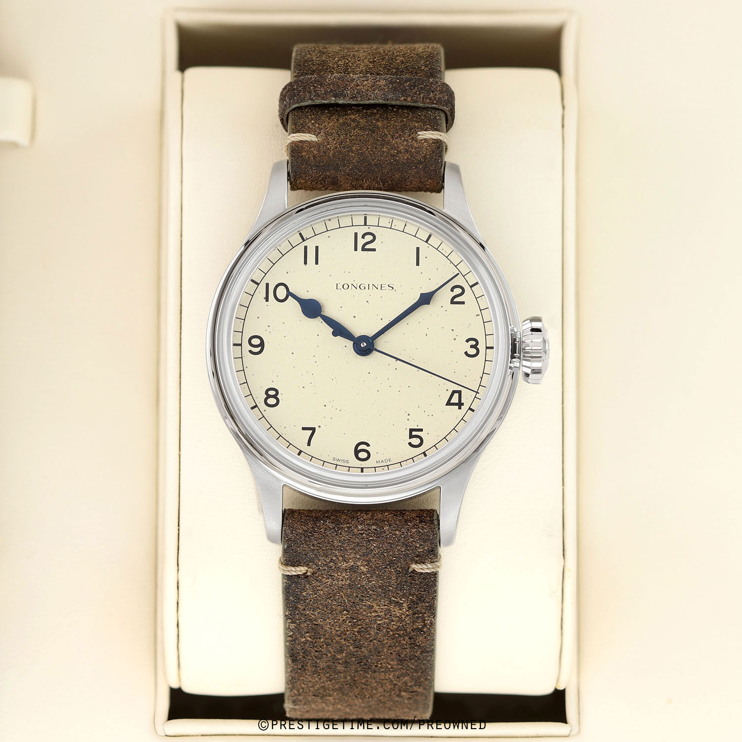 Case: Brushed & polished stainless steel case. Off-white ivory dial, lightly speckled to imitate a vintage patina dial. Blued steel hands. Black printed numeral hour markers & fine printed minutes/seconds track.