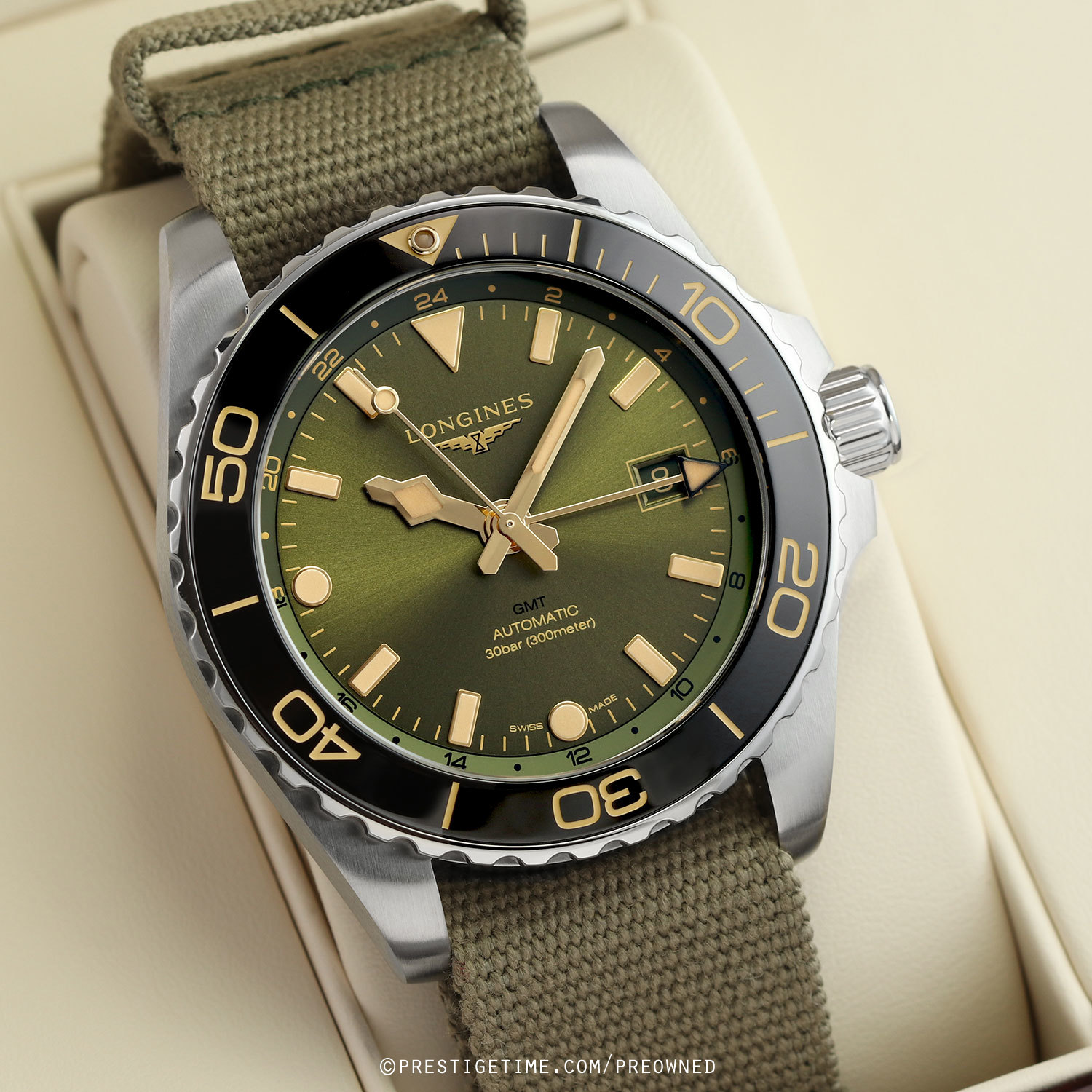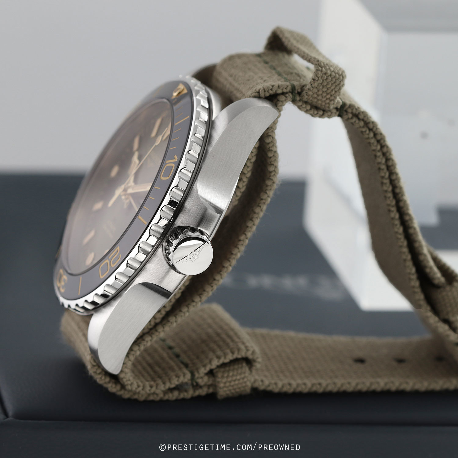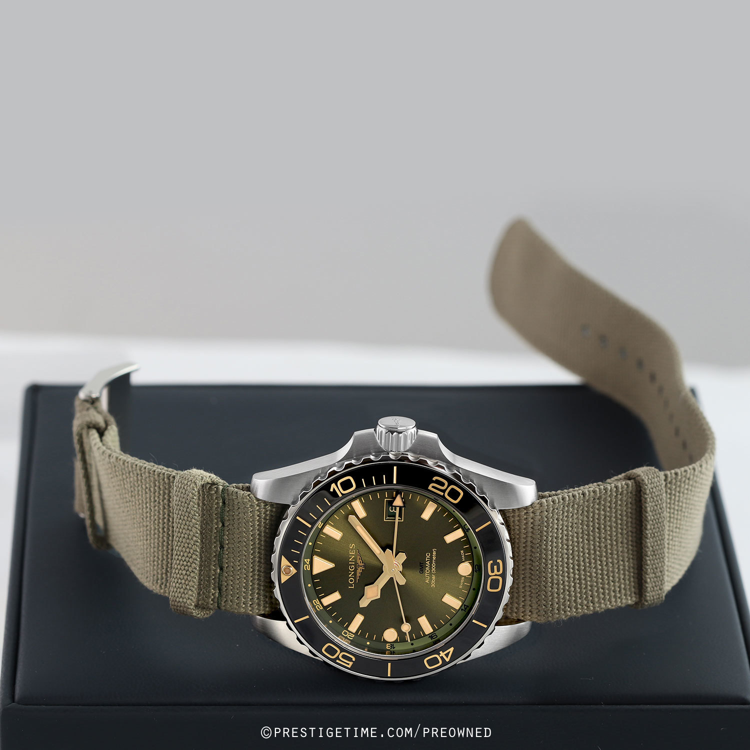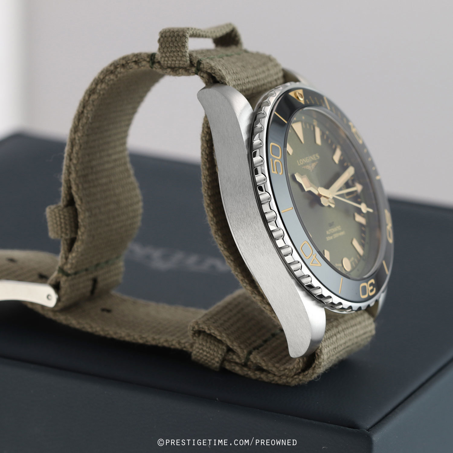 Strap: Fitted on its original Longines khaki green NATO fabric strap with a stainless steel tang buckle. The strap is in pristine near brand new condition with its full wear life-span remaining. We would rate the strap as in 99%
