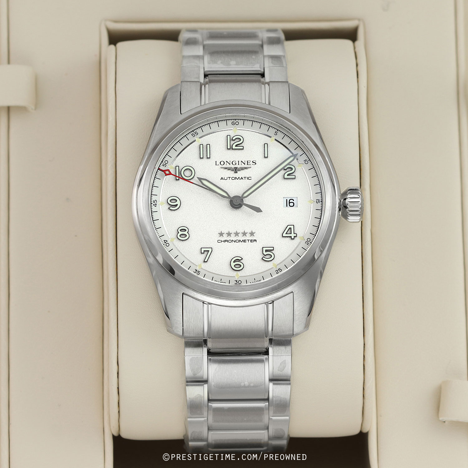 Movement: Powered by a COSC certified Longines caliber L888.4 (base ETA A31.L11), features a silicon balance spring, beats at 25,200 vph (3.5Hz), contains 21 jewels & has a power reserve of +/- 72 hours.