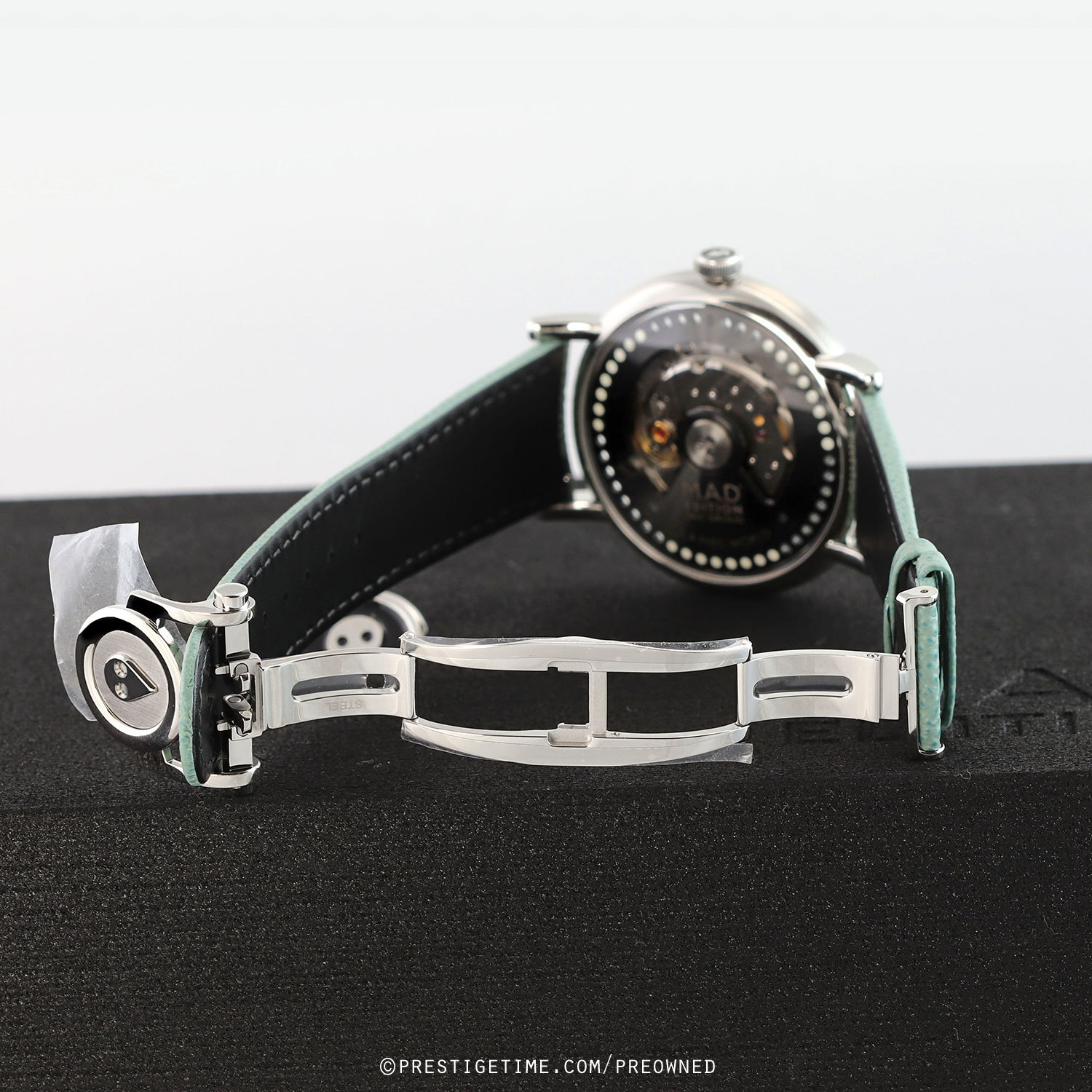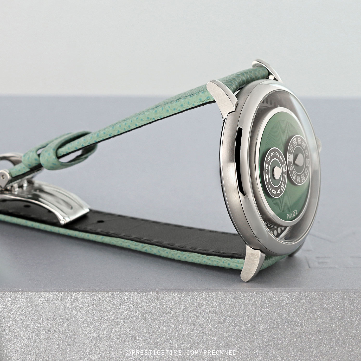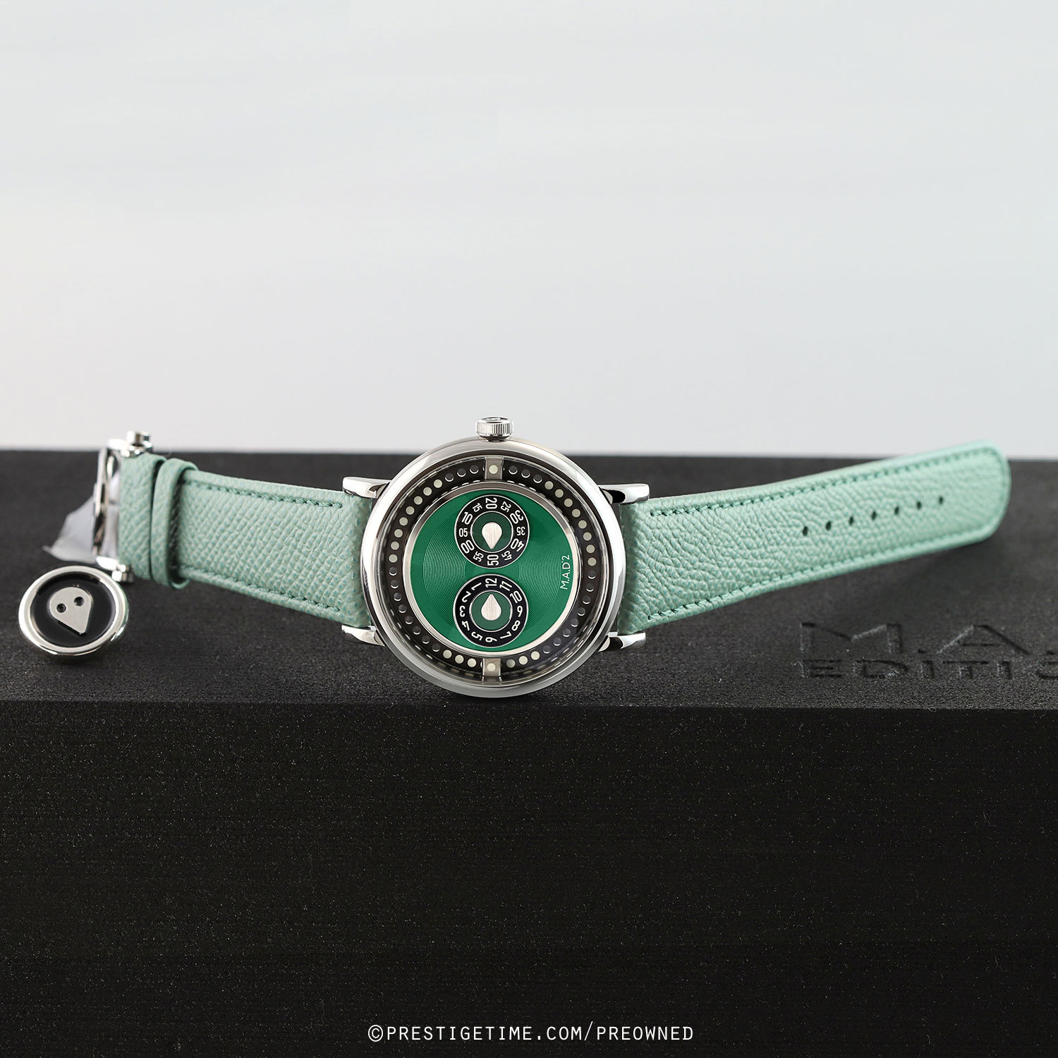 Strap: Fitted on its original MB&F light green calfskin leather strap with a stainless steel deployant buckle. The strap is crisp, brand new & unworn with its full wear lifespan remaining.