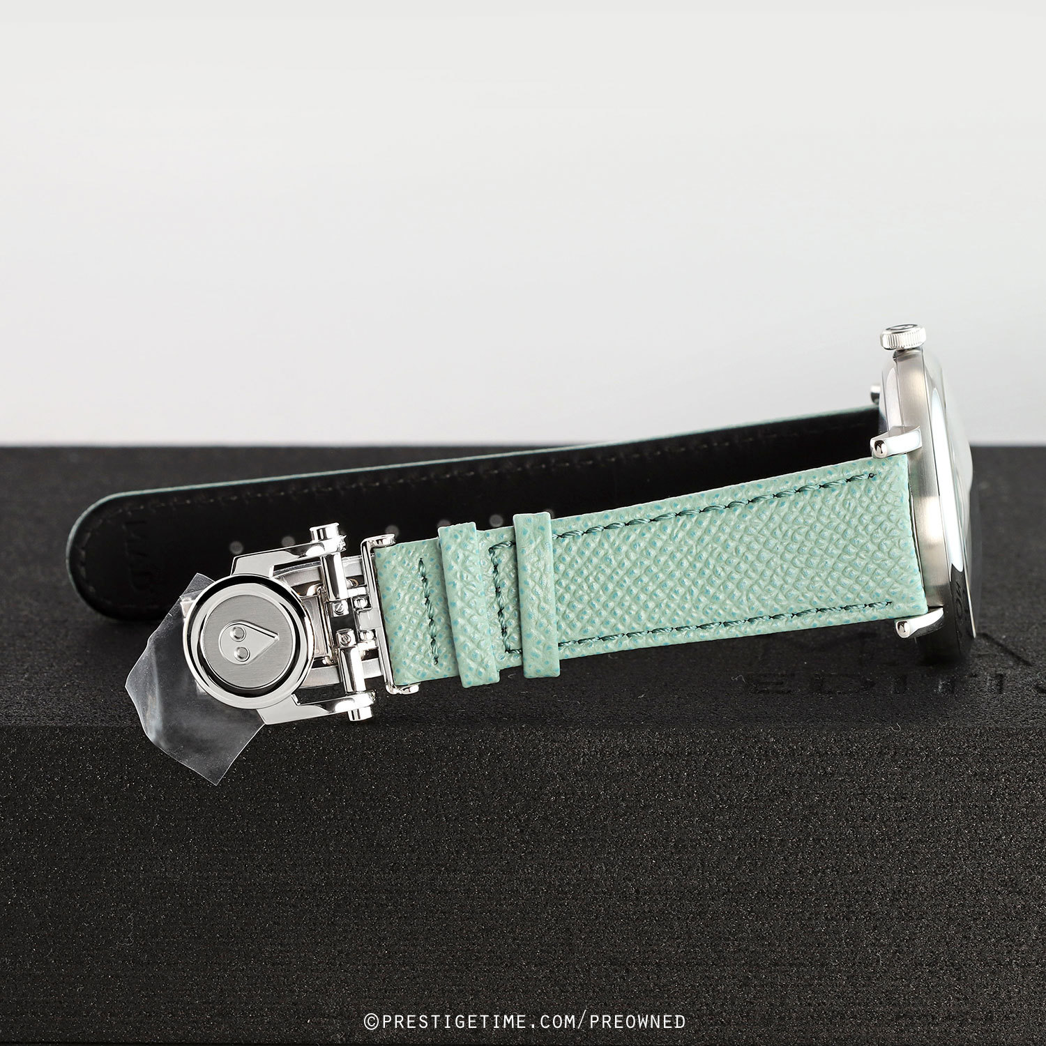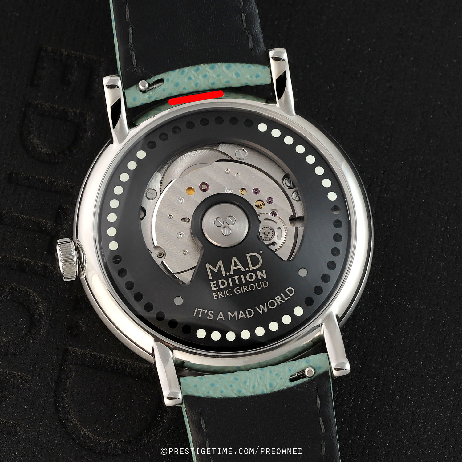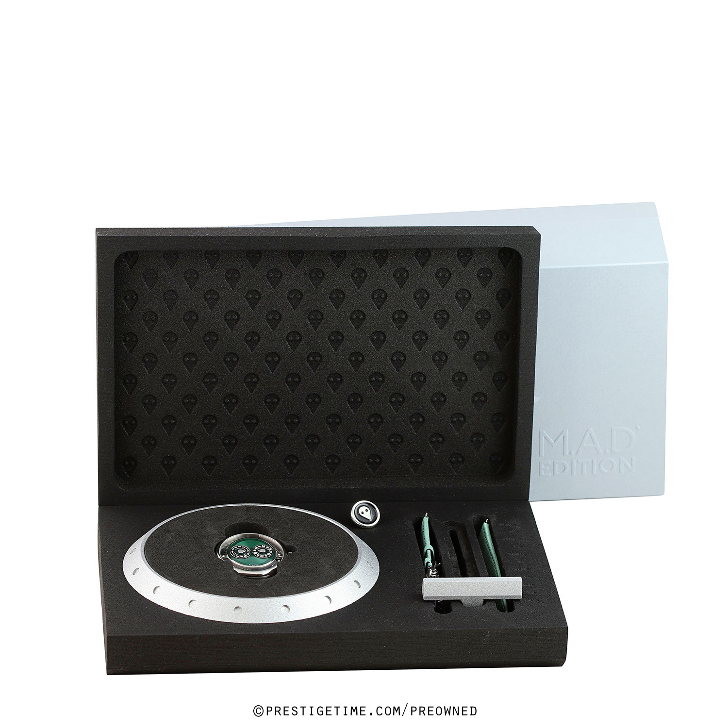 Strap: Fitted on its original MB&F light green calfskin leather strap with a stainless steel deployant buckle. The strap is crisp, brand new & unworn with its full wear lifespan remaining.